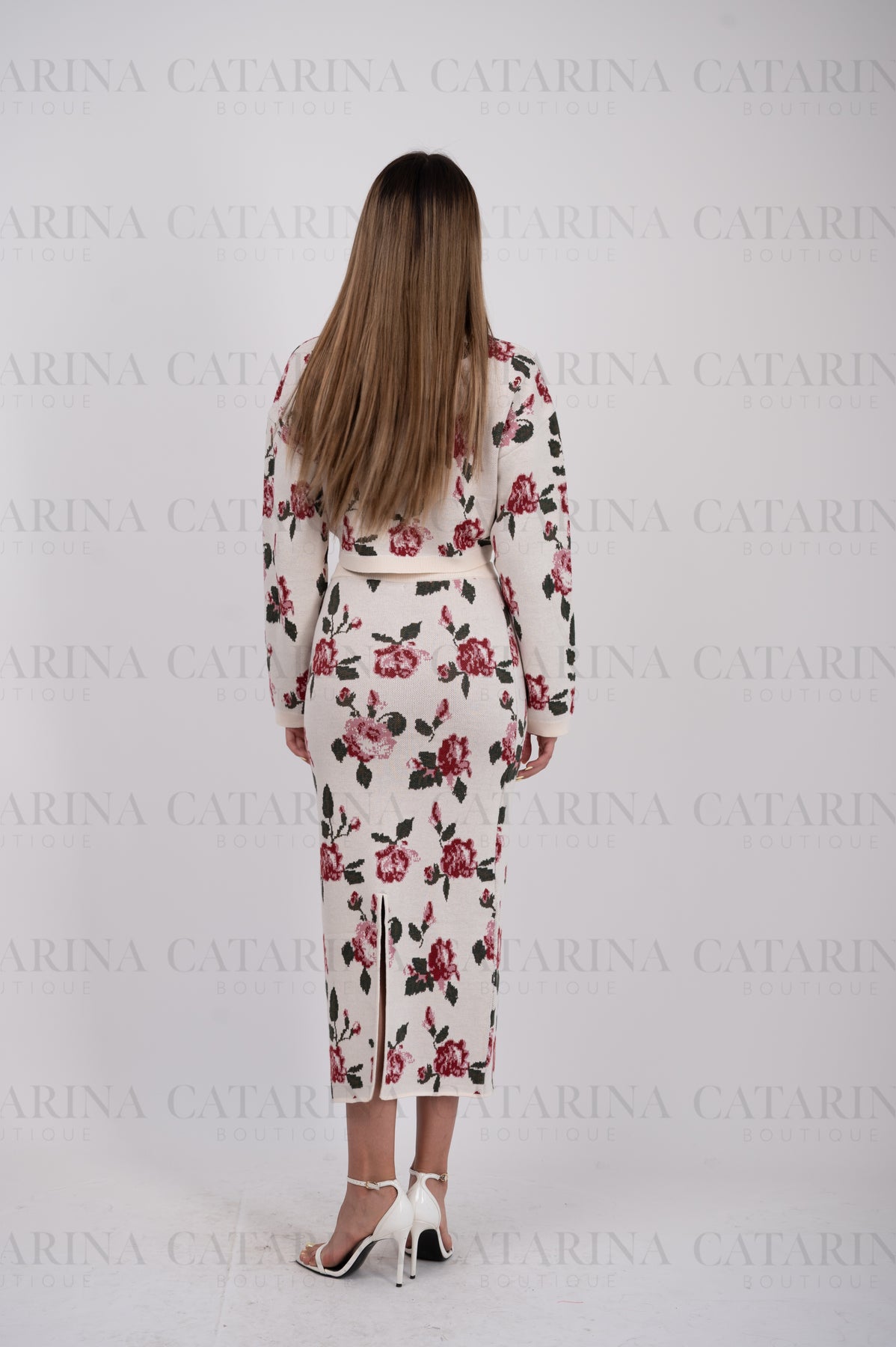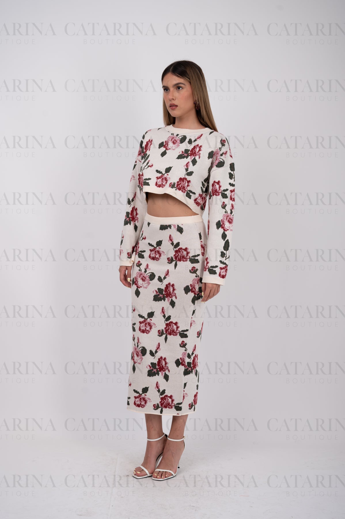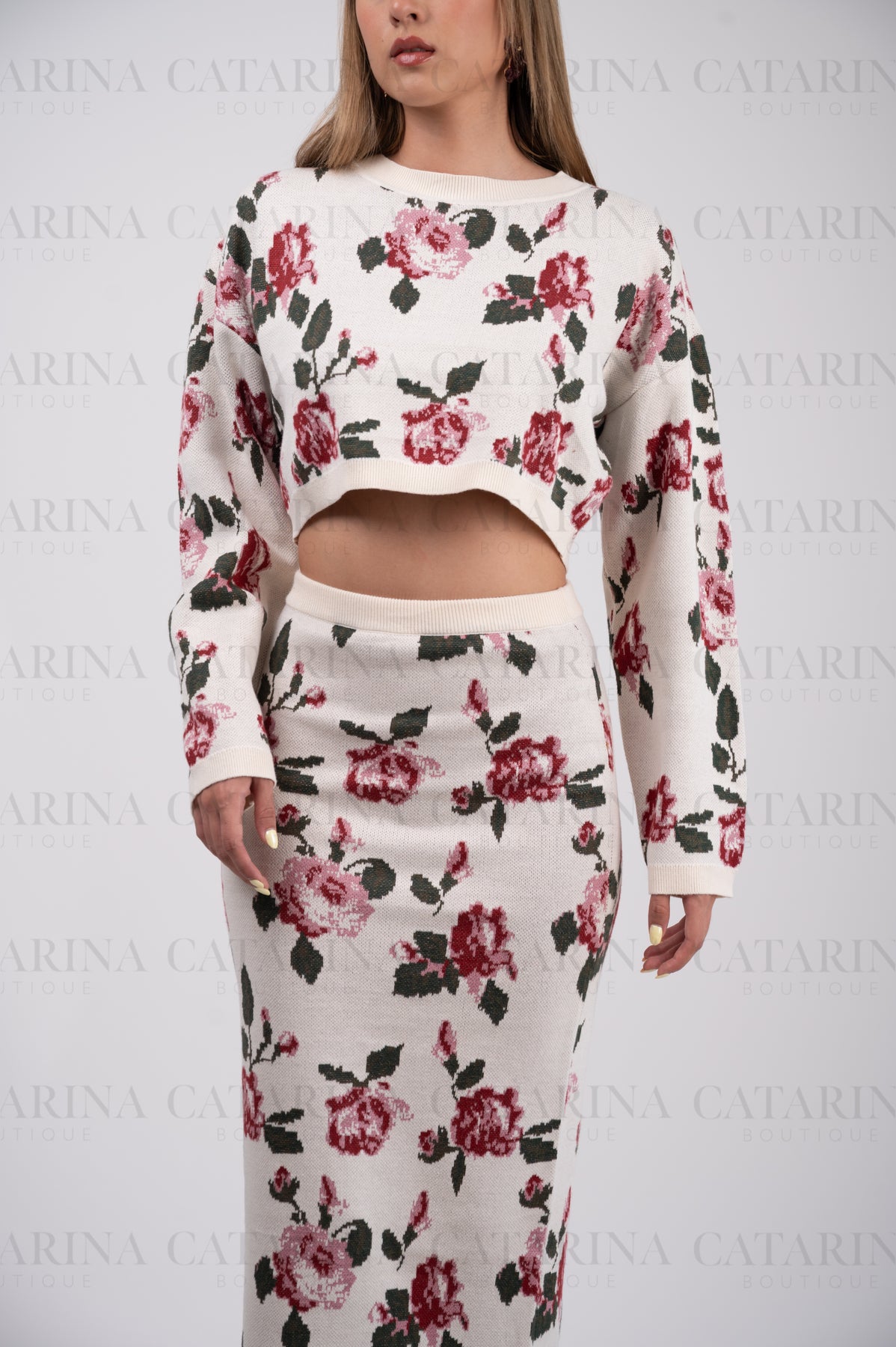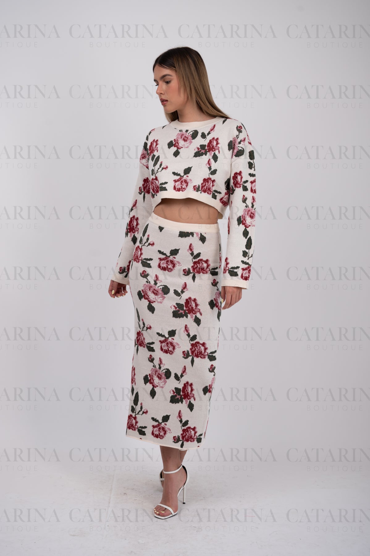 Conjunto de suéter y falda. Suéter de cuello redondo. Falda lisa. Elástico en cintura. Bajo acabado en volante. Detalle de estampado floral en todo el cuerpo del conjunto.