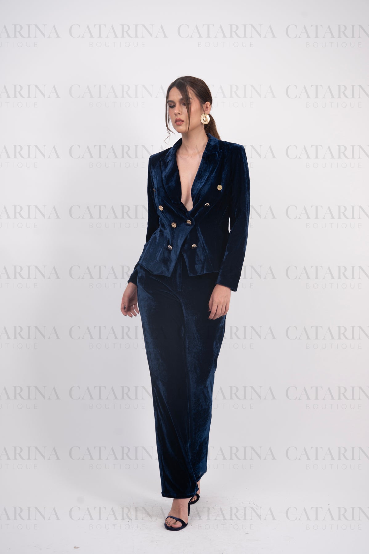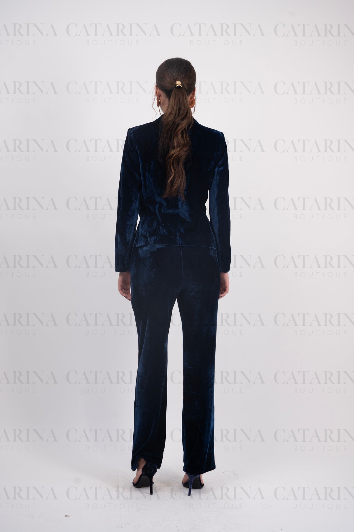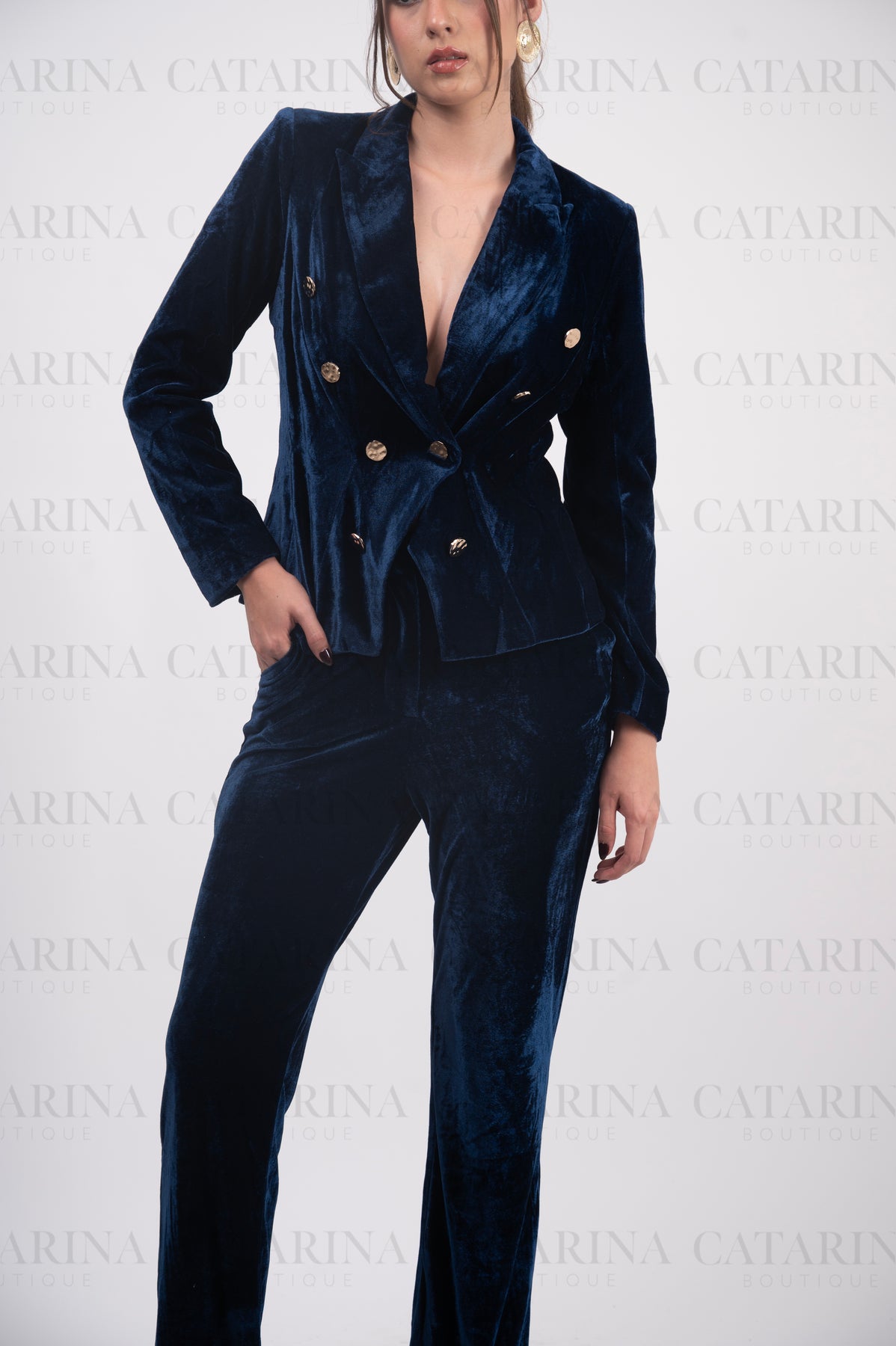 Conjunto de dos piezas de estilo sastre. Blazer de corte clásico y con solapas. Detalle de textura de terciopelo en todo el cuerpo de las prendas. Pantalón a juego. Bajo acabado recto.