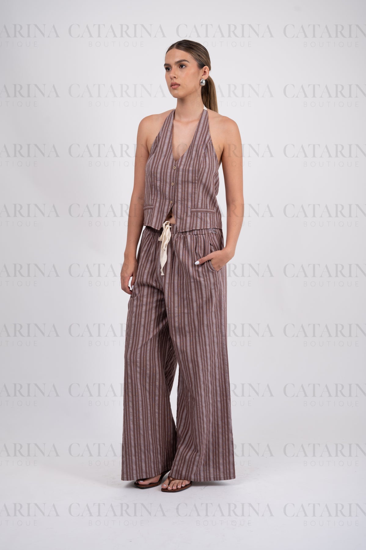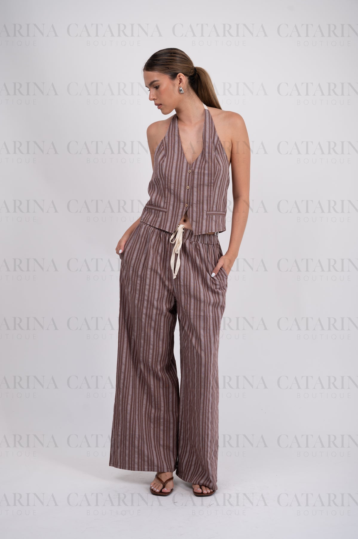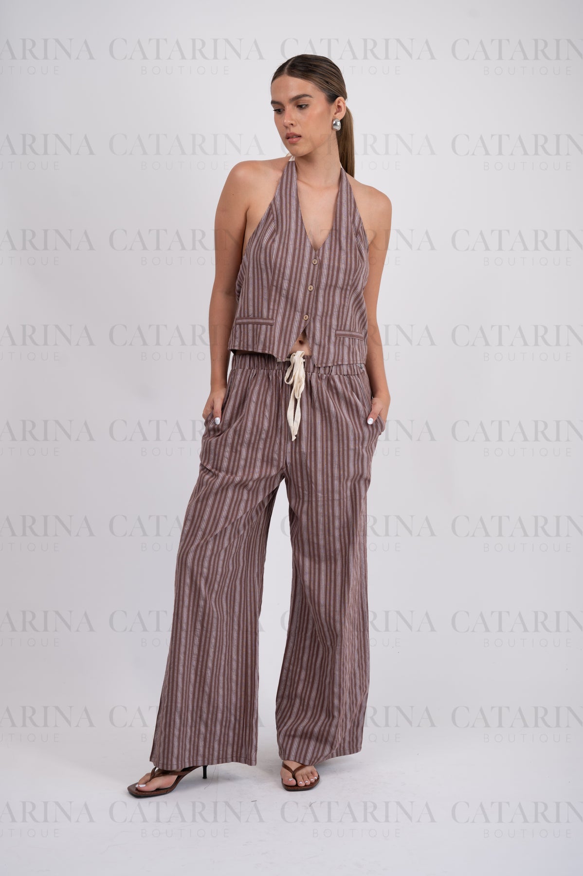 Conjunto de blusa y pantalón. Blusa de escote pronunciado. Pantalón de tiro alto. Elástico en cintura. Bajo acabado recto.