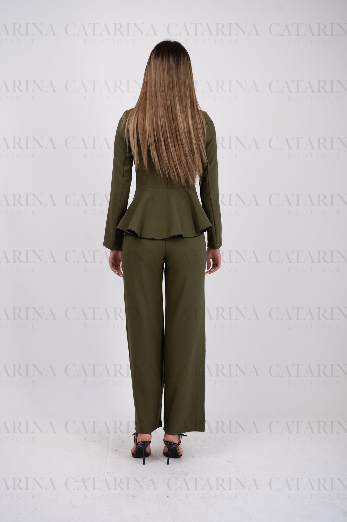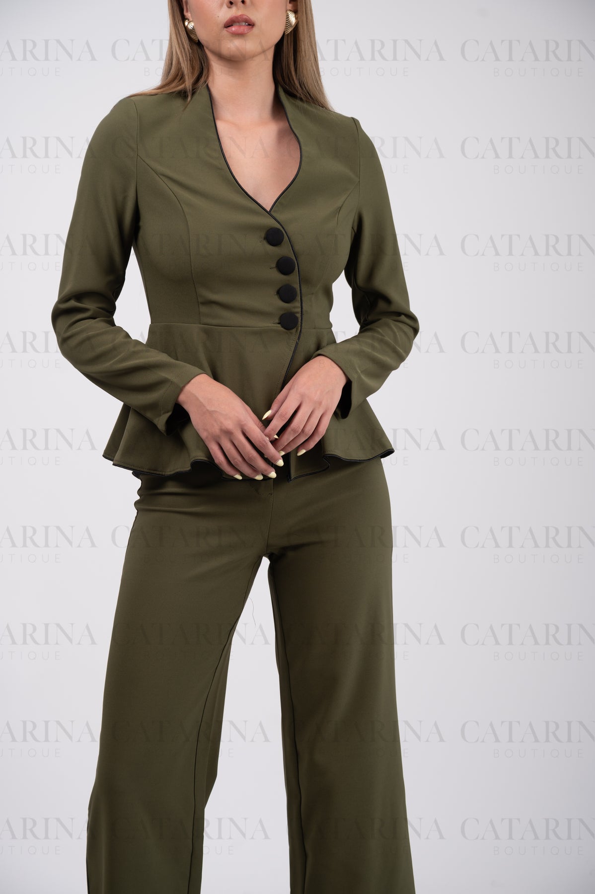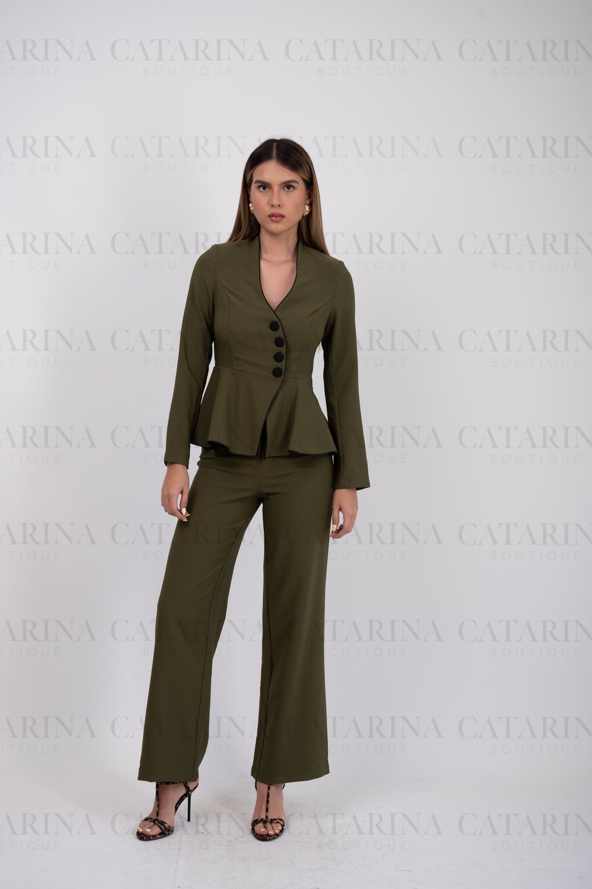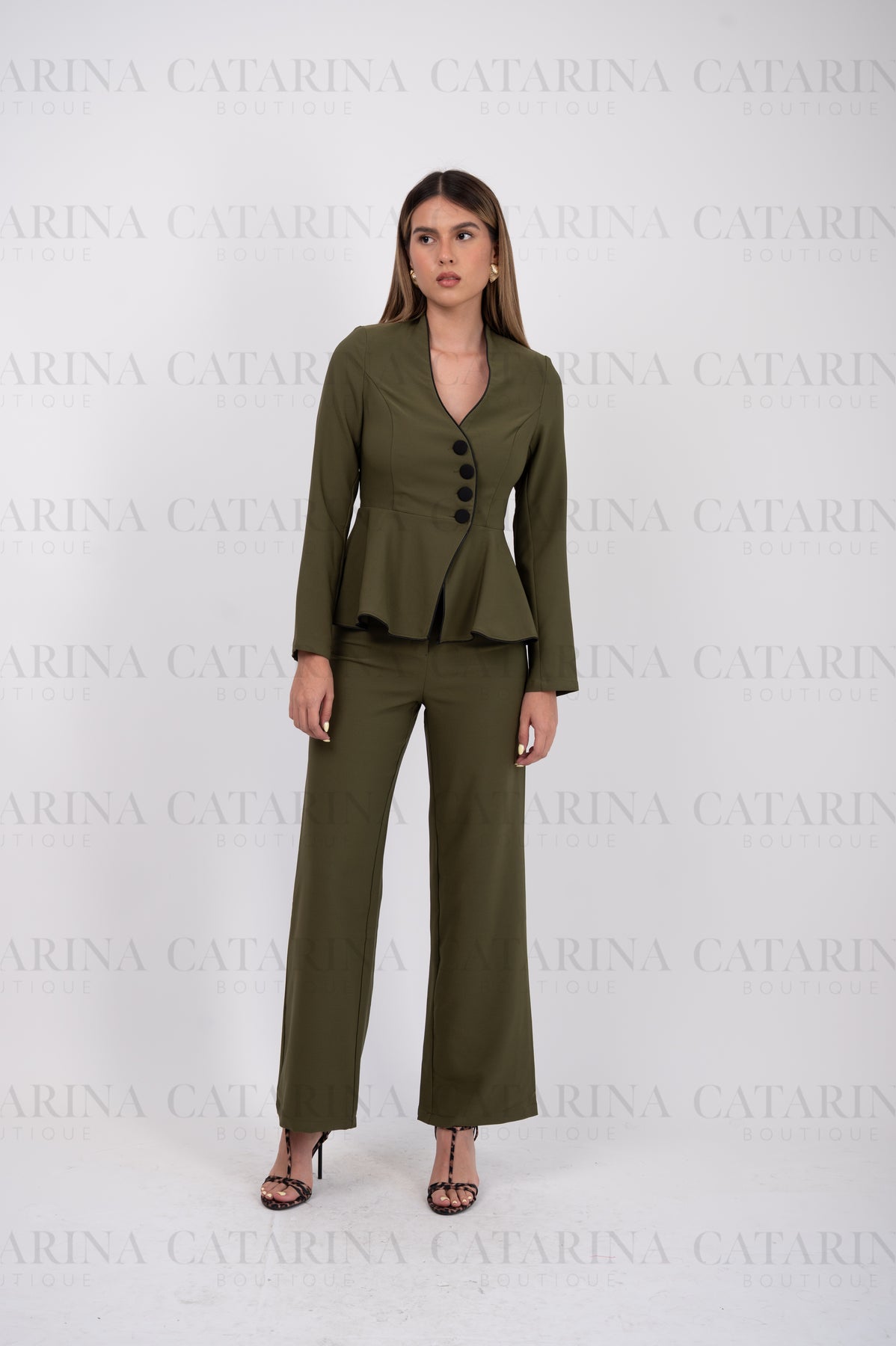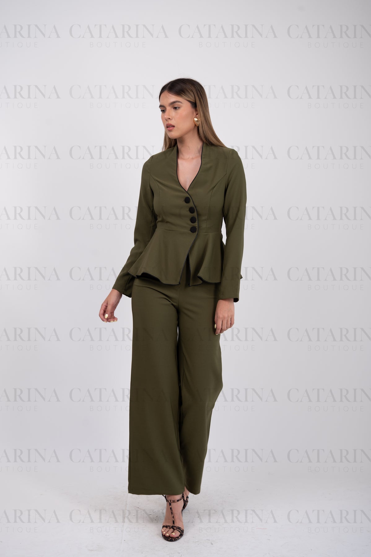 Conjunto de saco y pantalón. Saco de escote pronunciado. Bajo acabado en volante. Botones delanteros. Pantalón liso de tiro alto. Bolsillos ocultos en los costados.