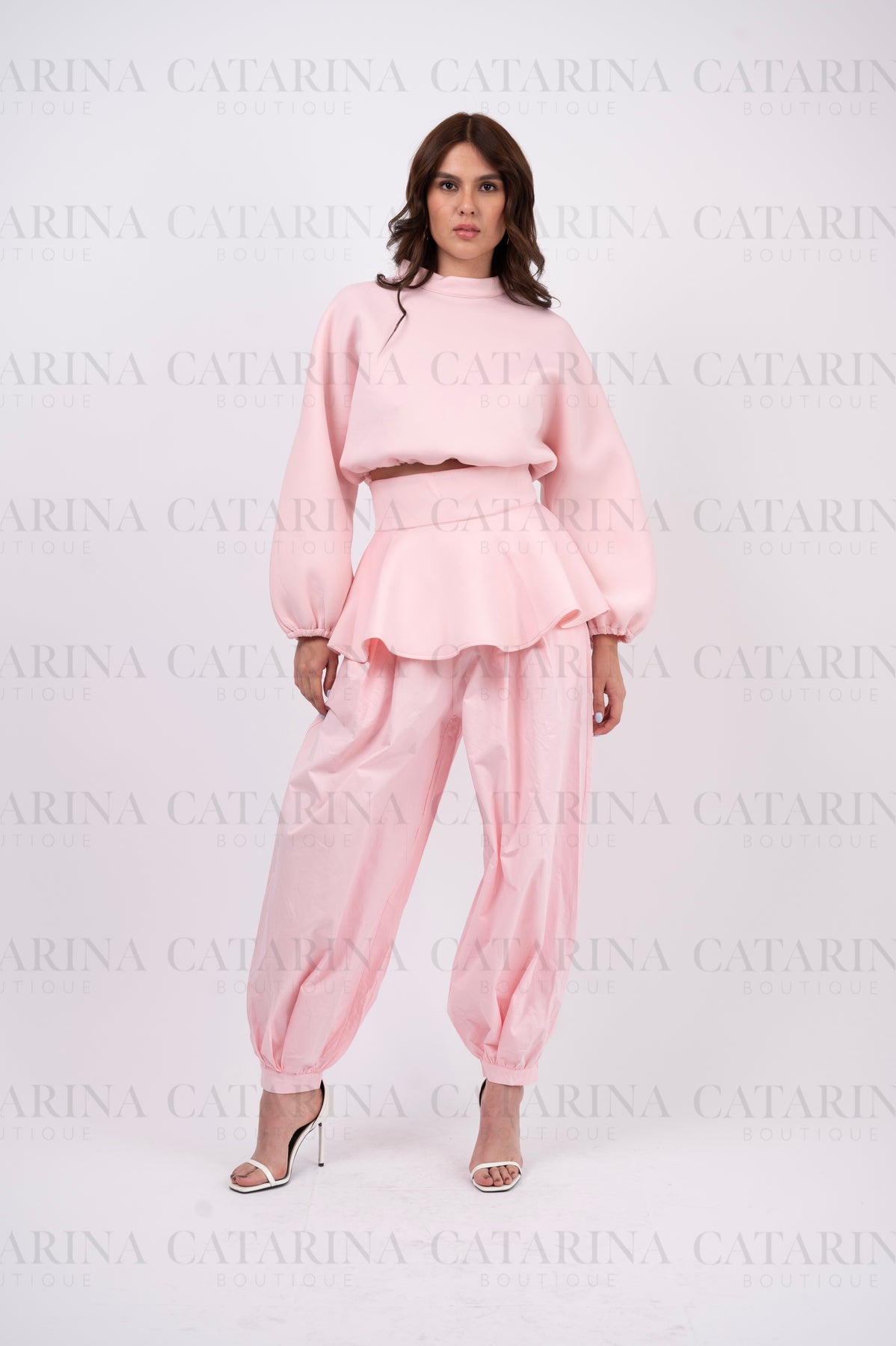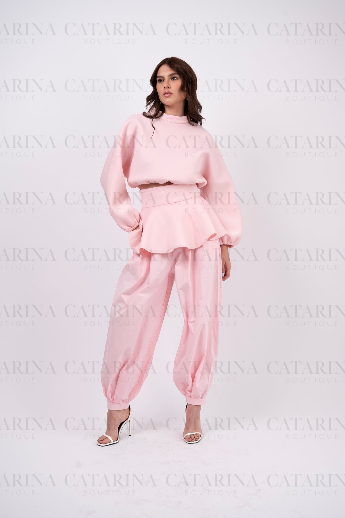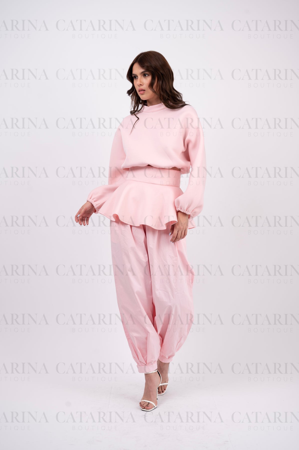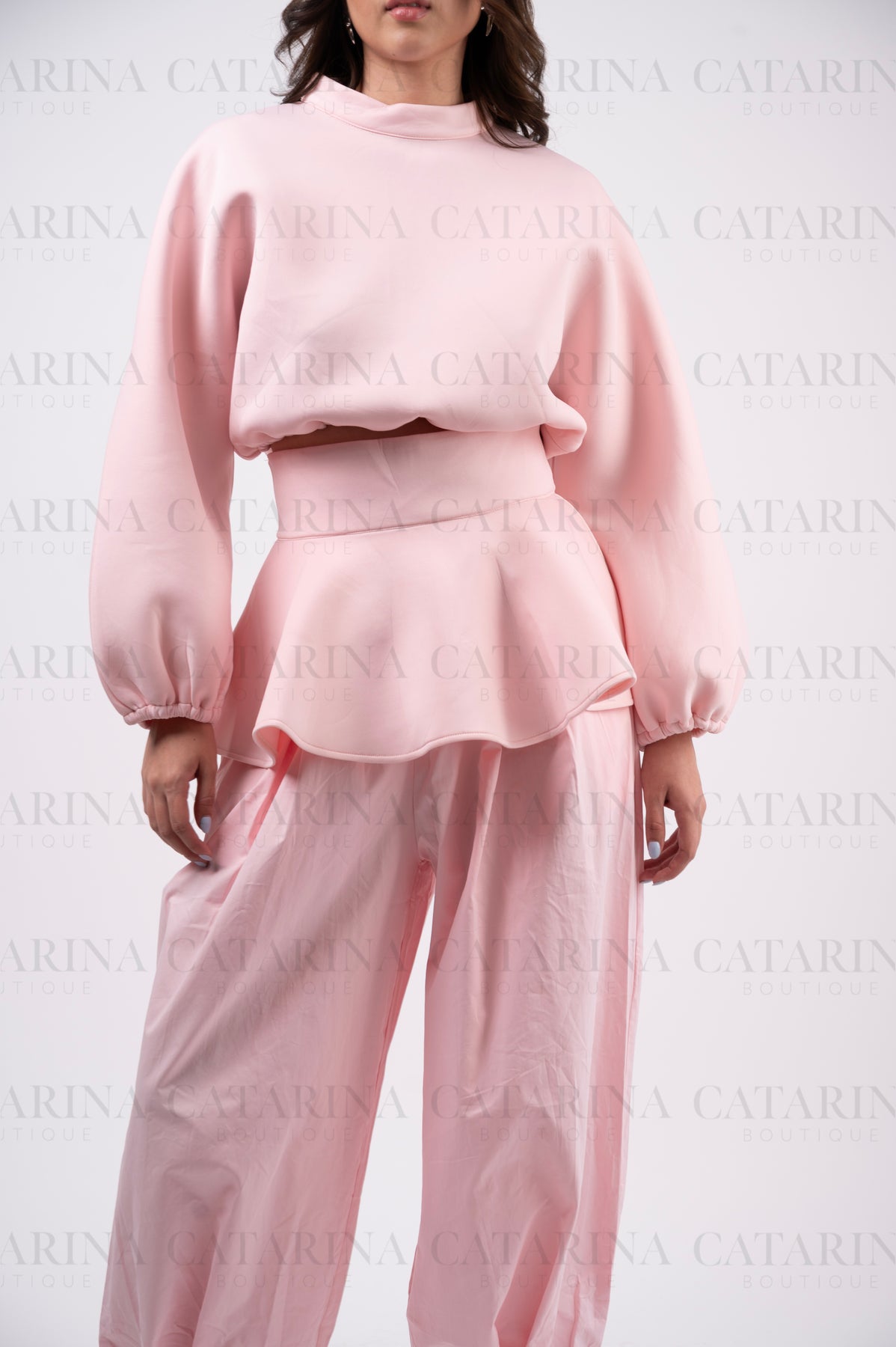 Set de tres piezas. Suéter cuello redondo. Mini-falda con acabado en olan. Pantalón a juego. Bajo acabado recto.