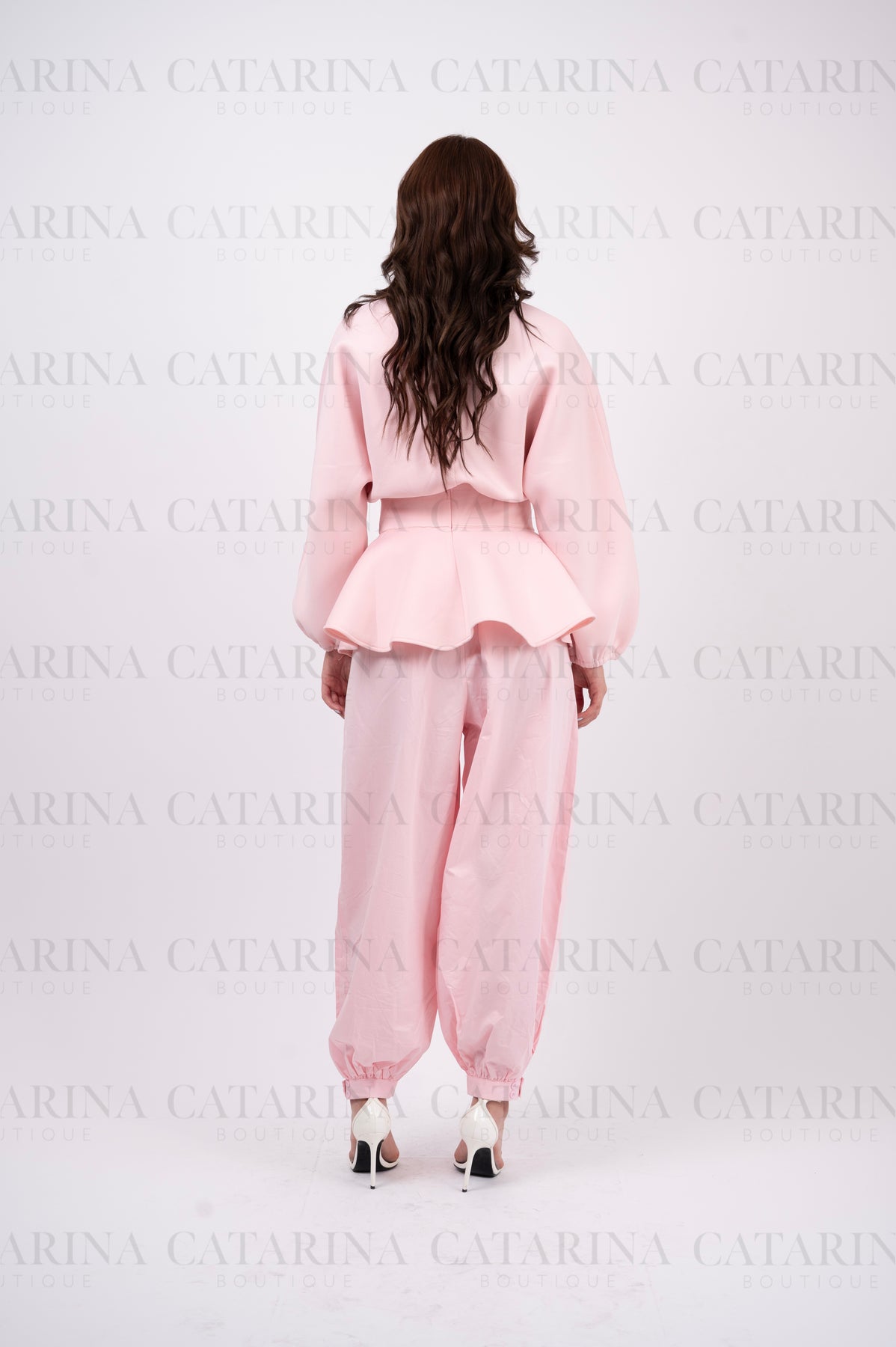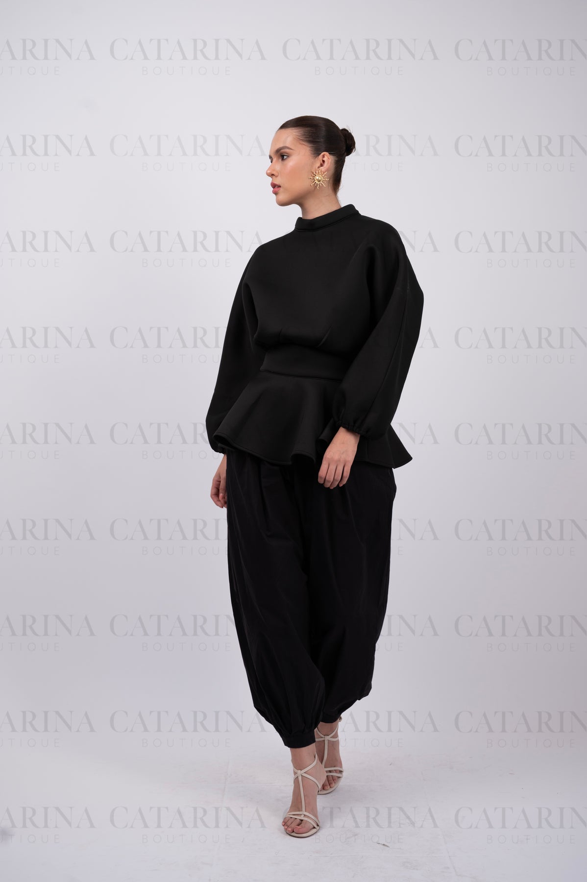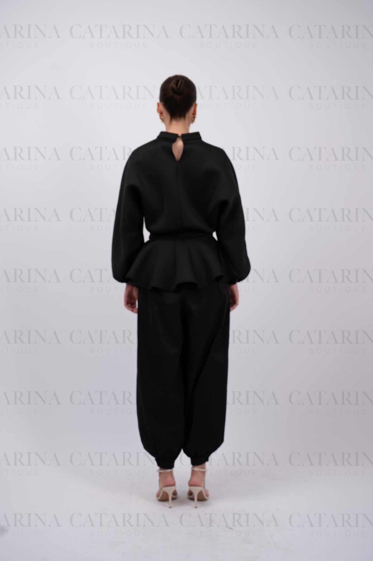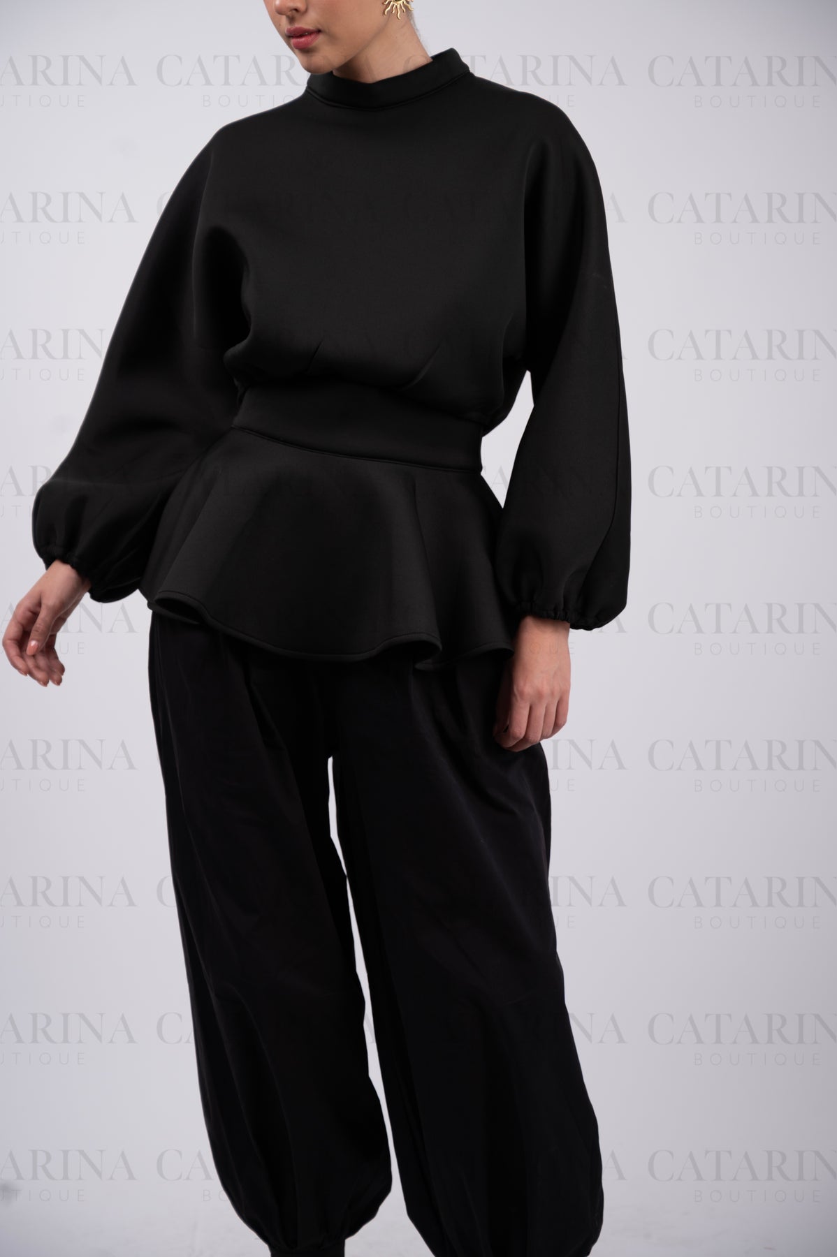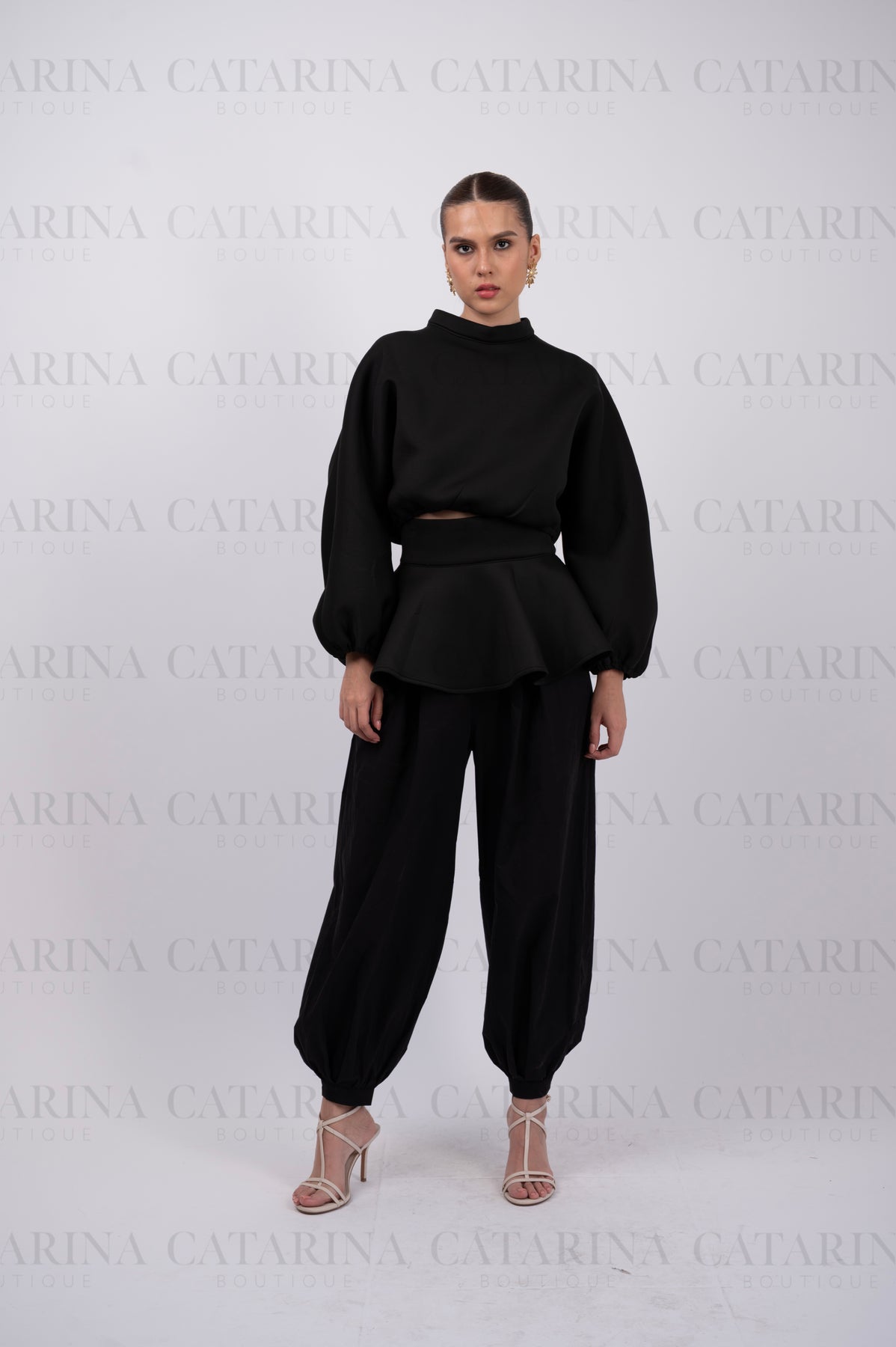 Set de tres piezas. Suéter cuello redondo. Mini-falda con acabado en olan. Pantalón a juego. Bajo acabado recto.