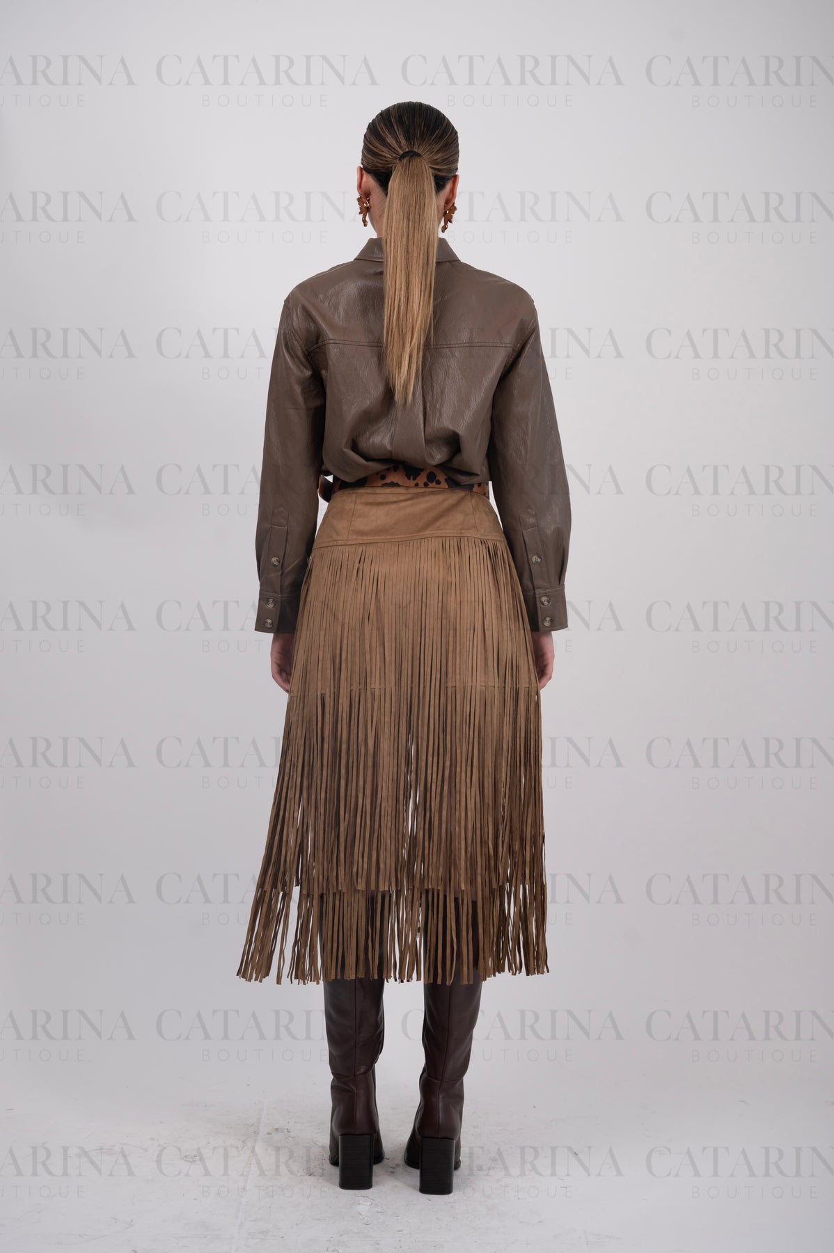 Falda lisa. Bajo acabado recto . Detalle de flequillos sueltos en todo el cuerpo de la falda.