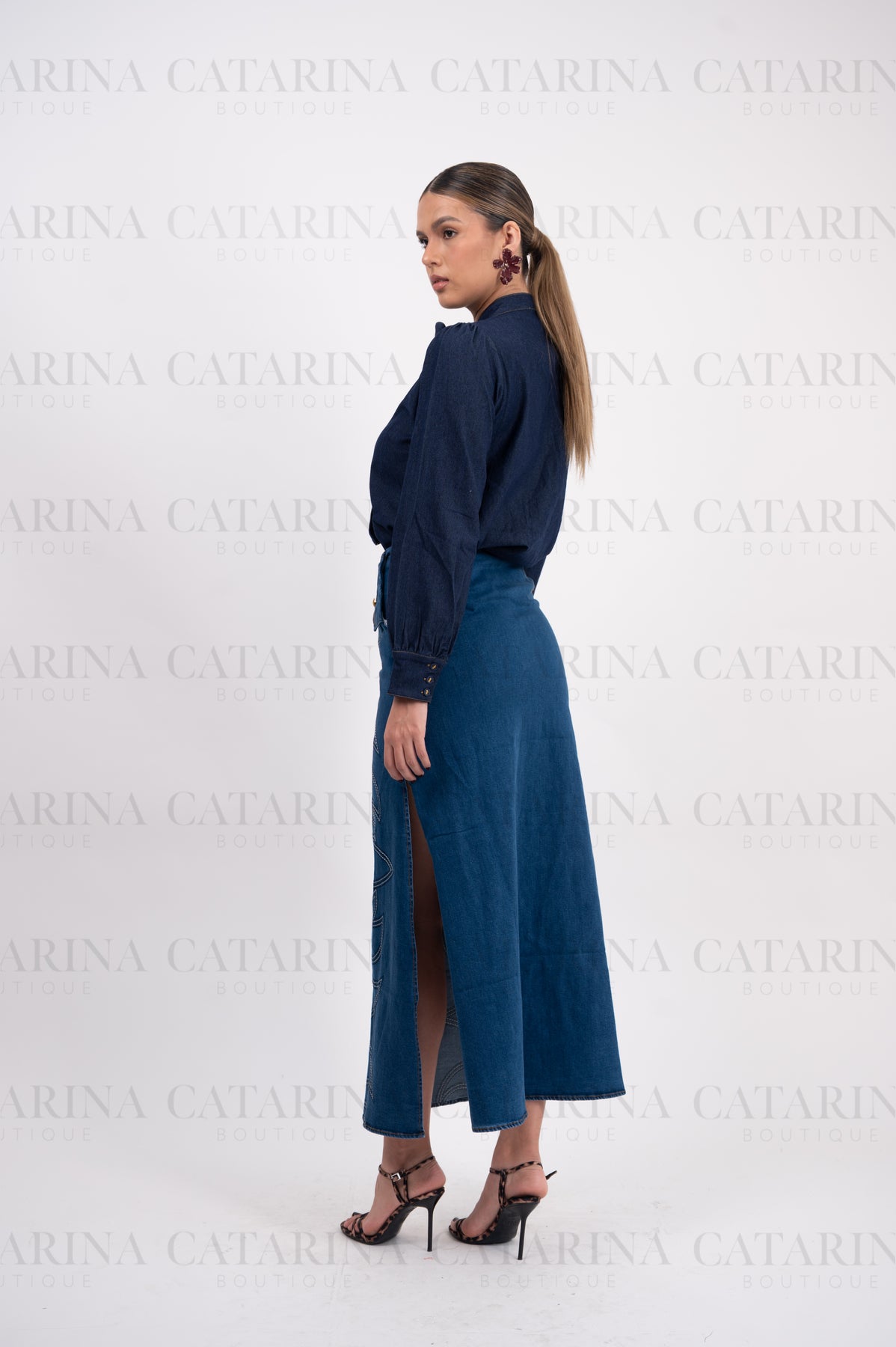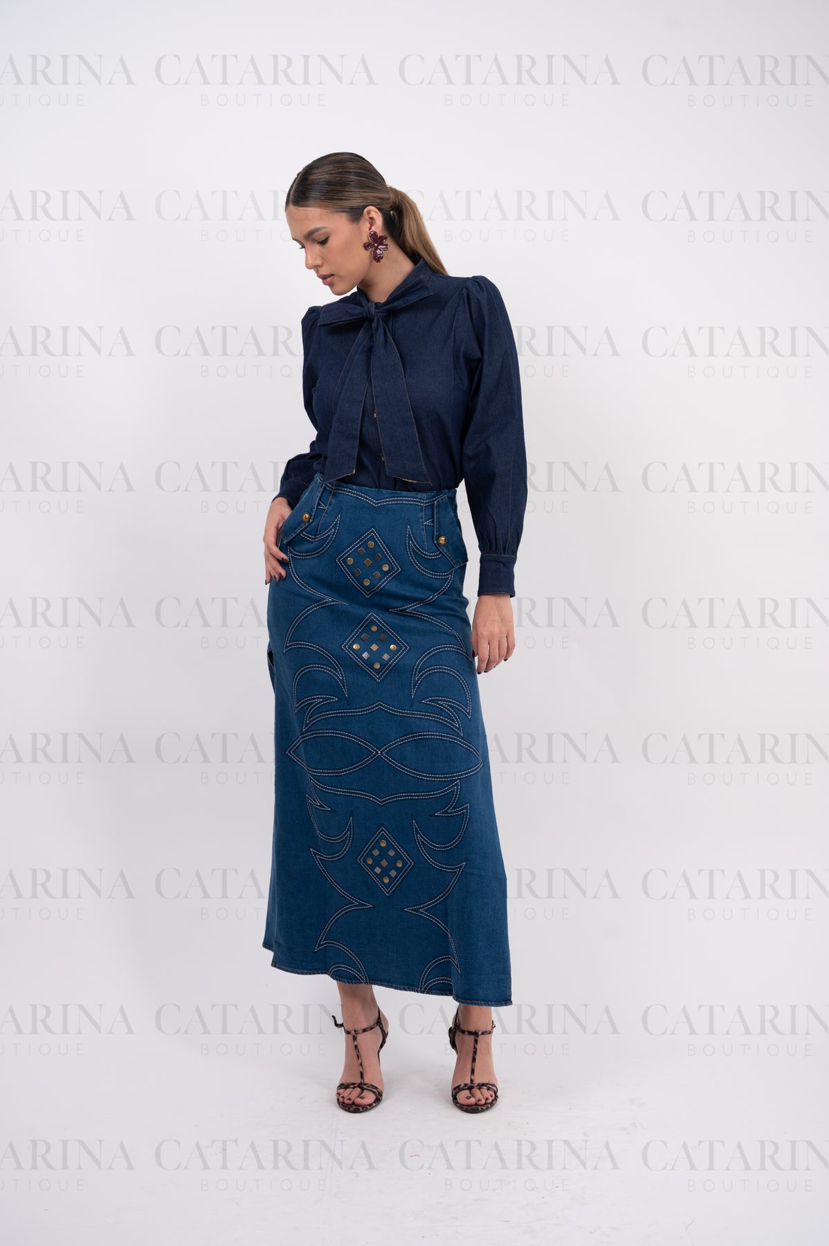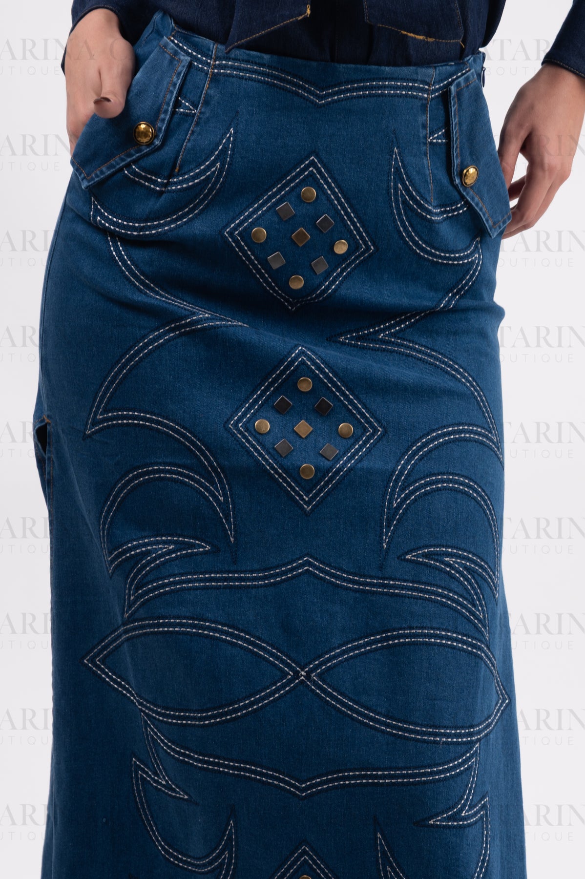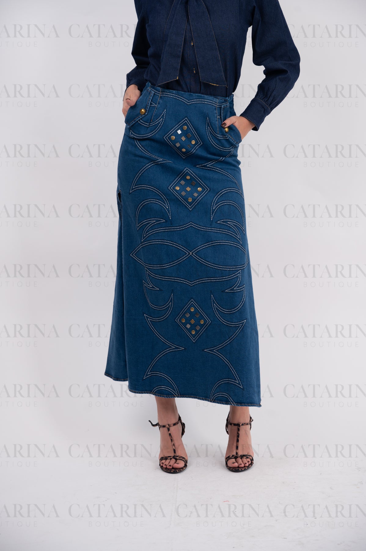 Falda de color liso. Bajo acabado recto. Detalle de bordado al frente.