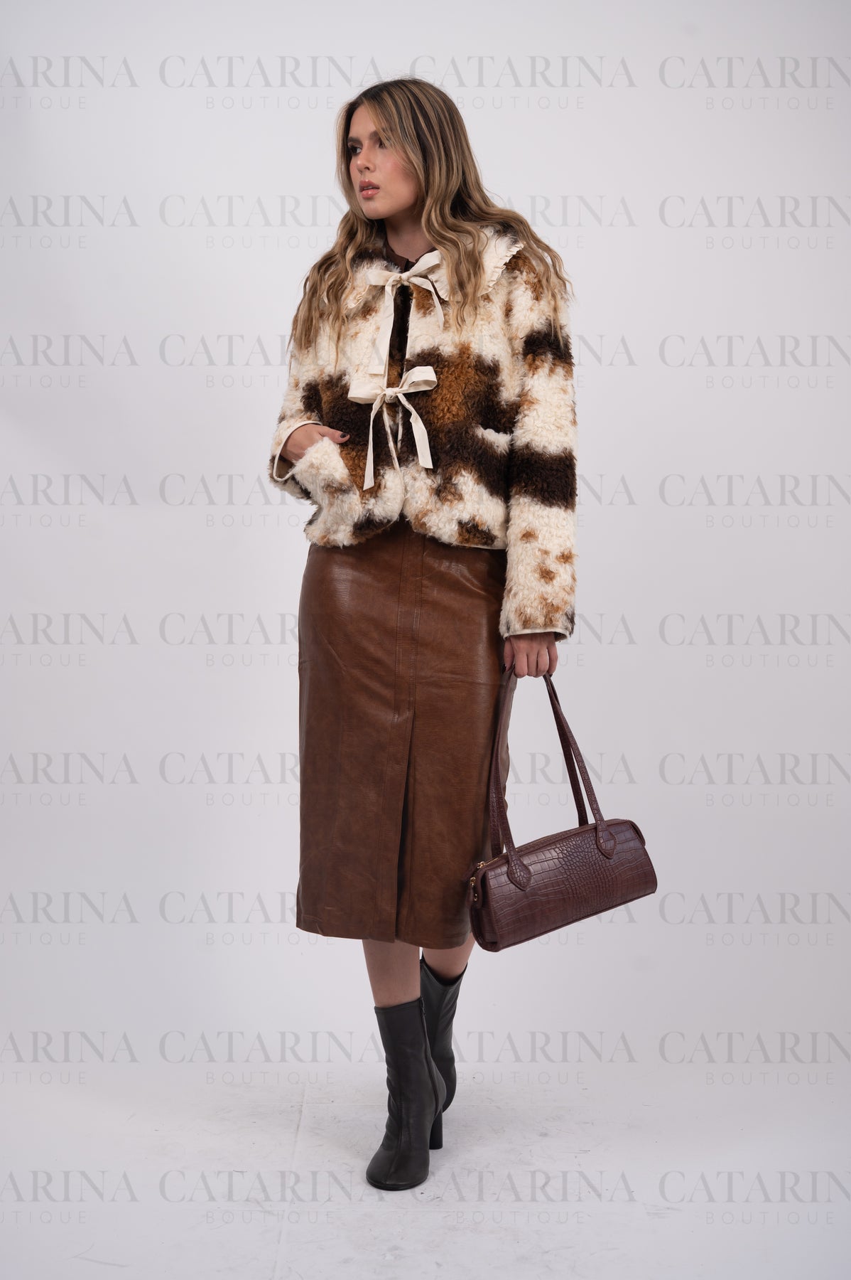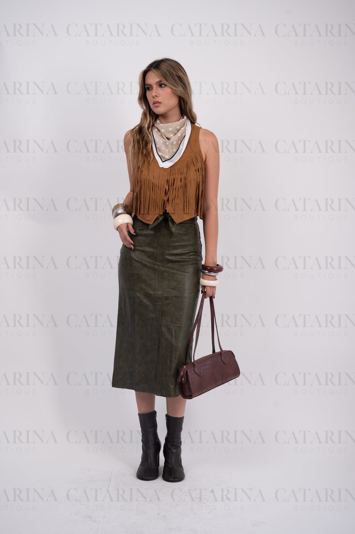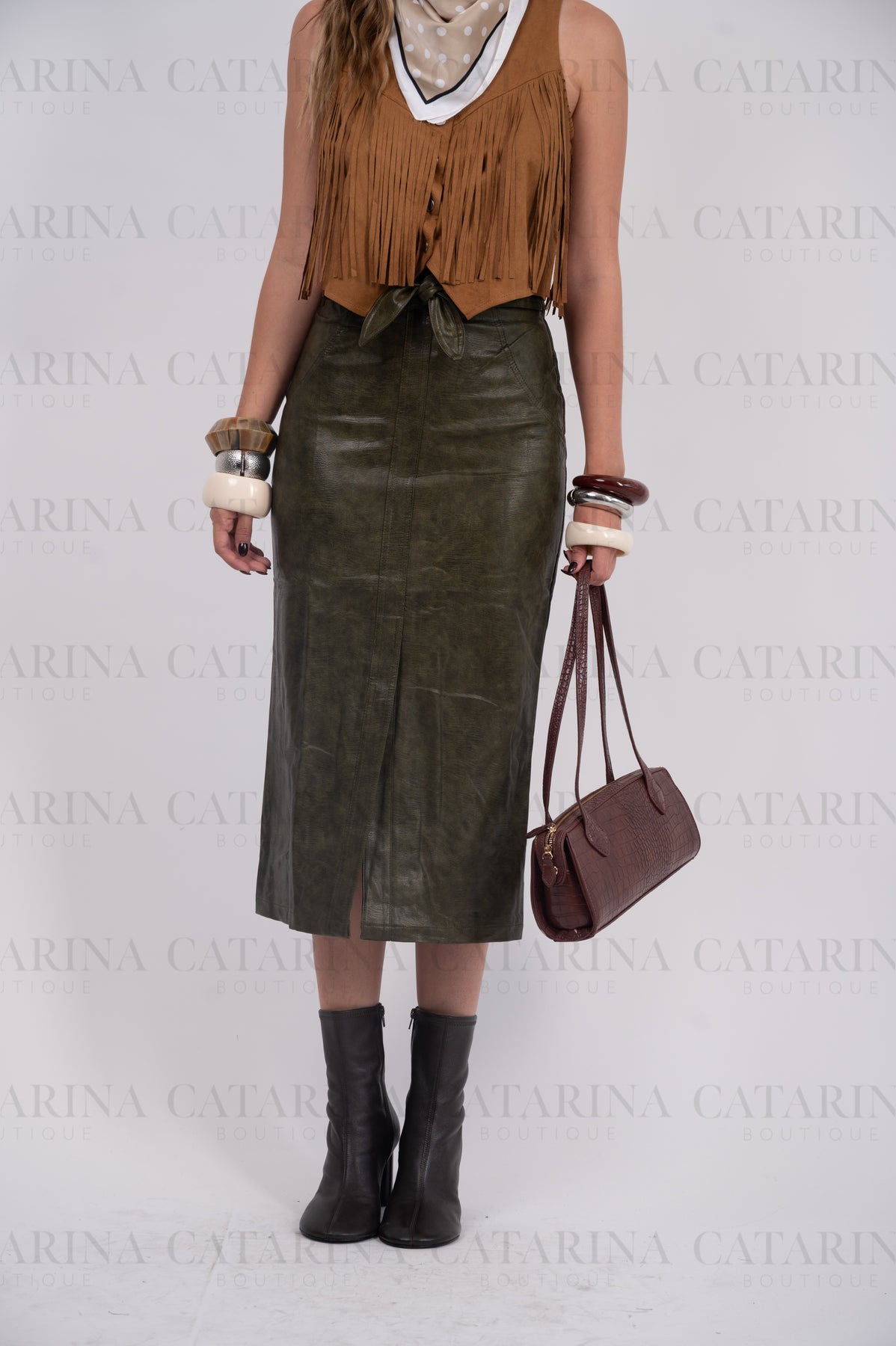 Falda de color liso. Bajo acabado recto con abertura. Botón y cierre al frente. Detalle de lazadas.