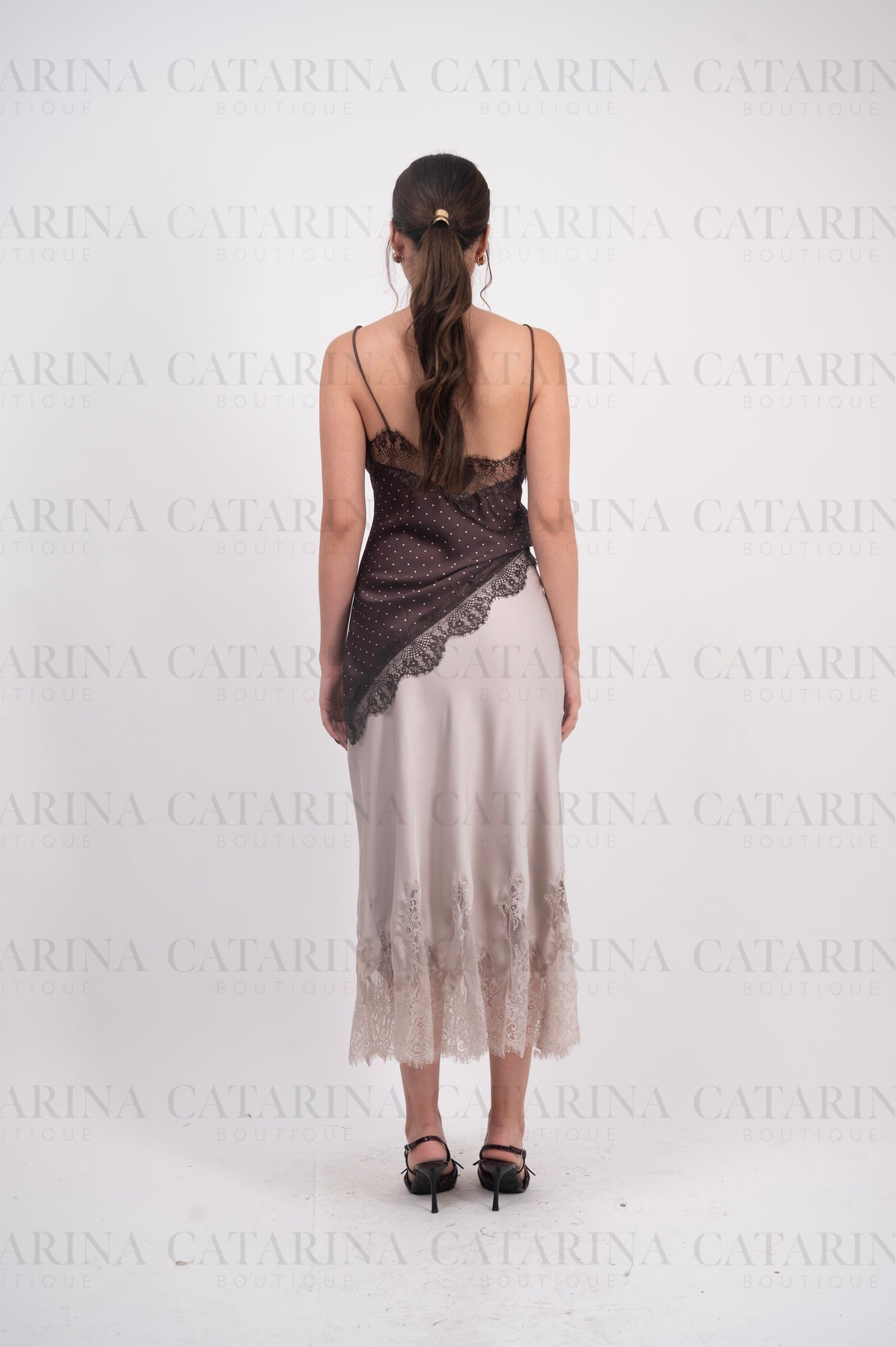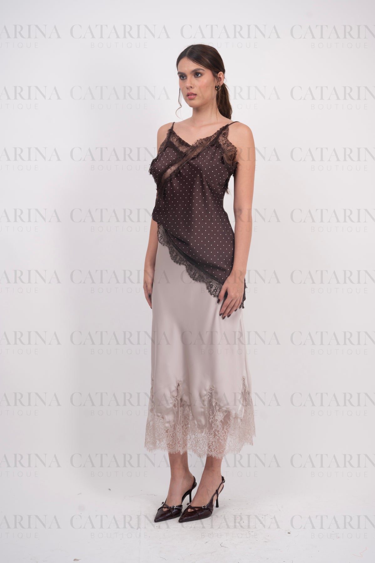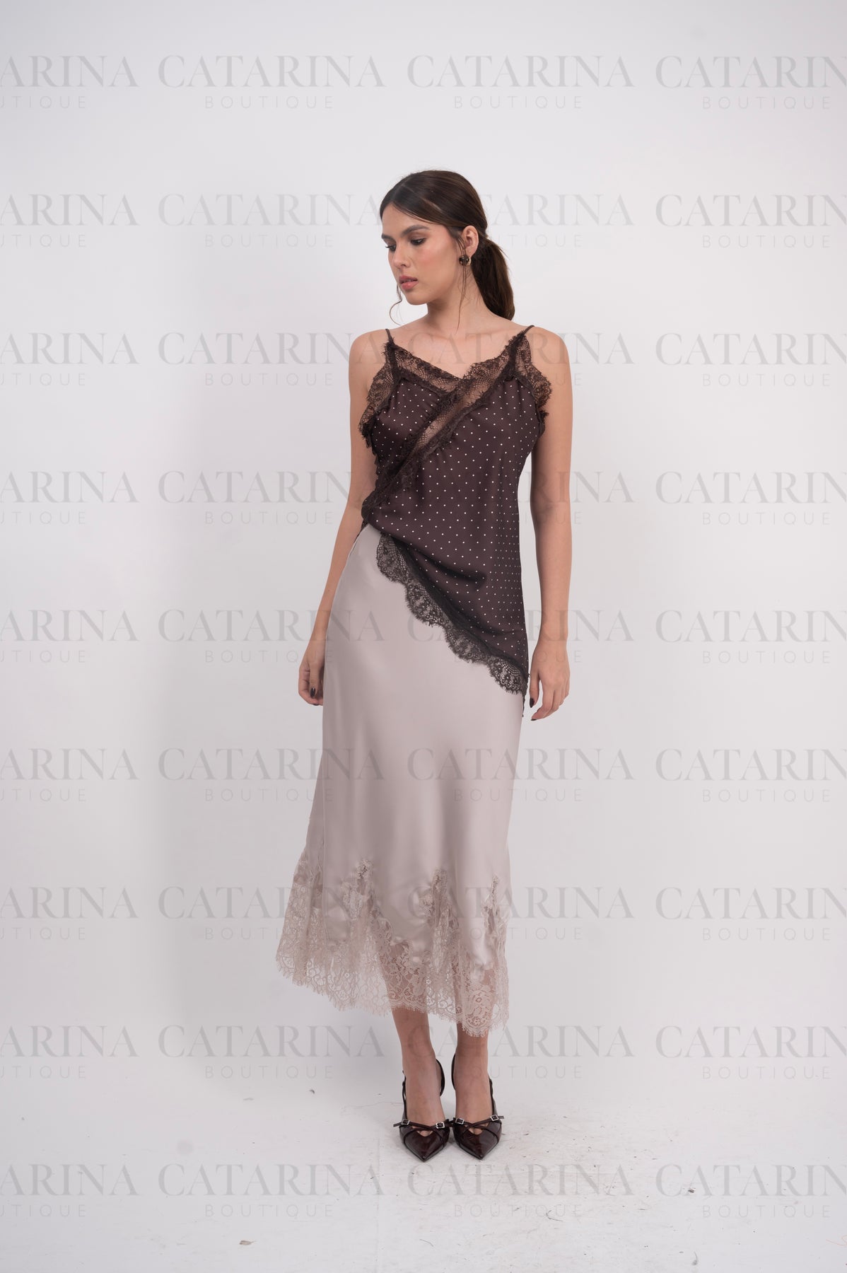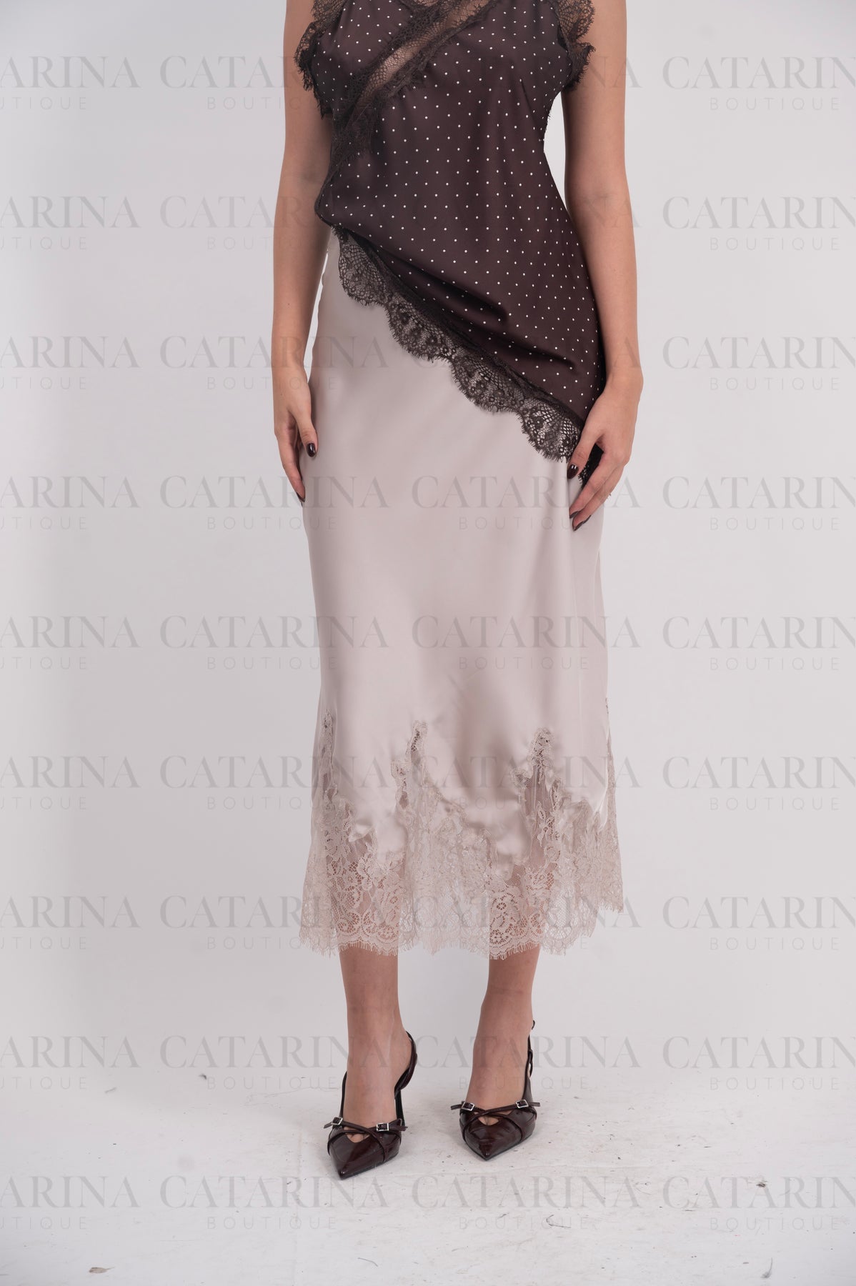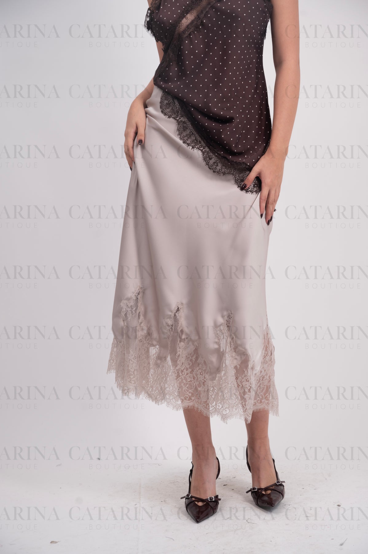 Falda satinada. Elástico en cintura. Bajo acabado recto con detalle de encaje.