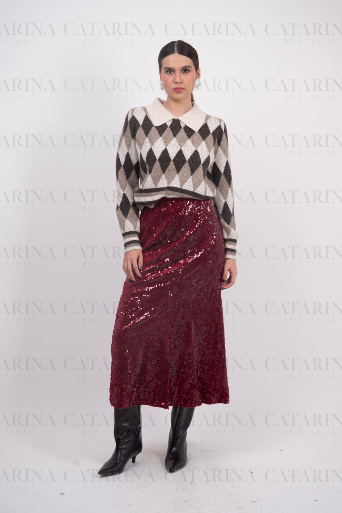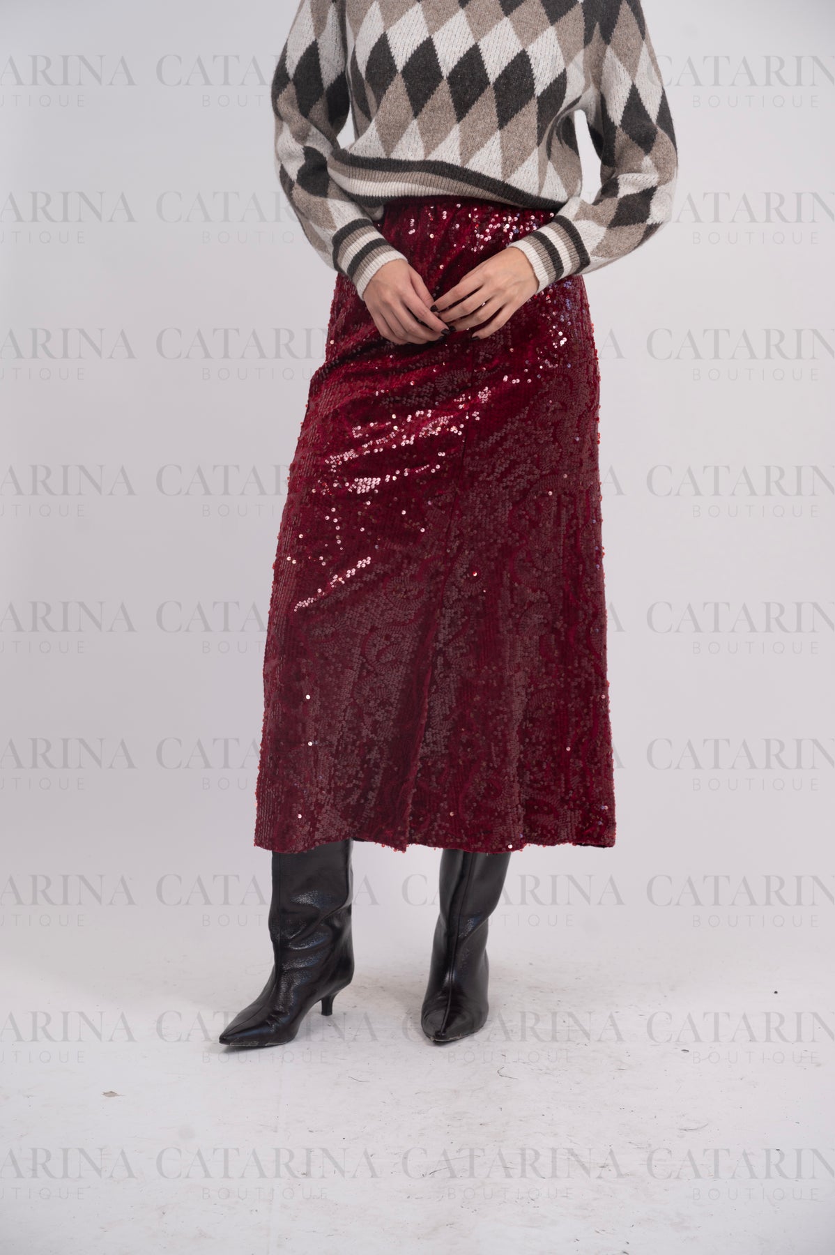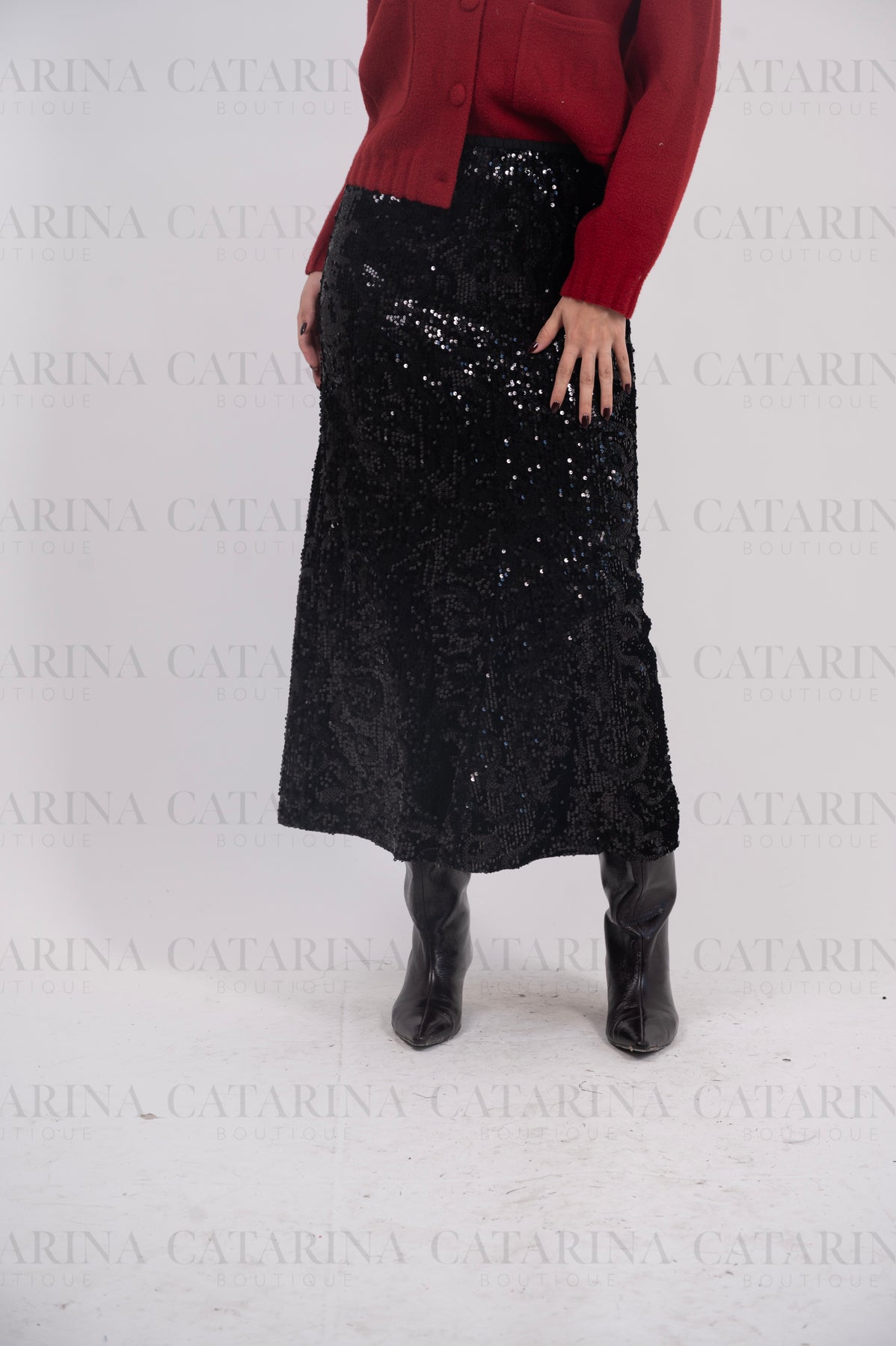 Falda de lentejuela. Elástico en cintura. Bajo acabado recto.