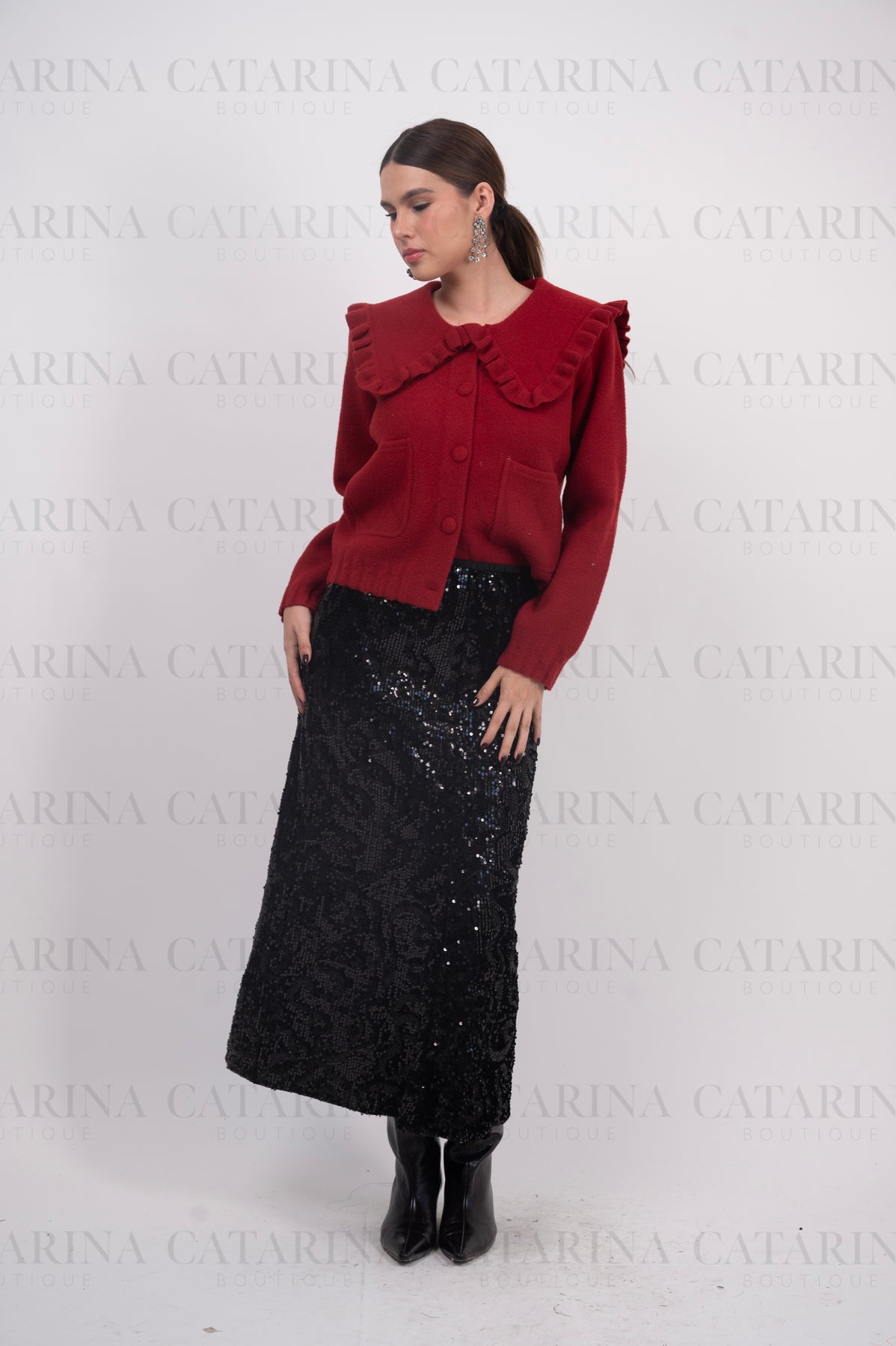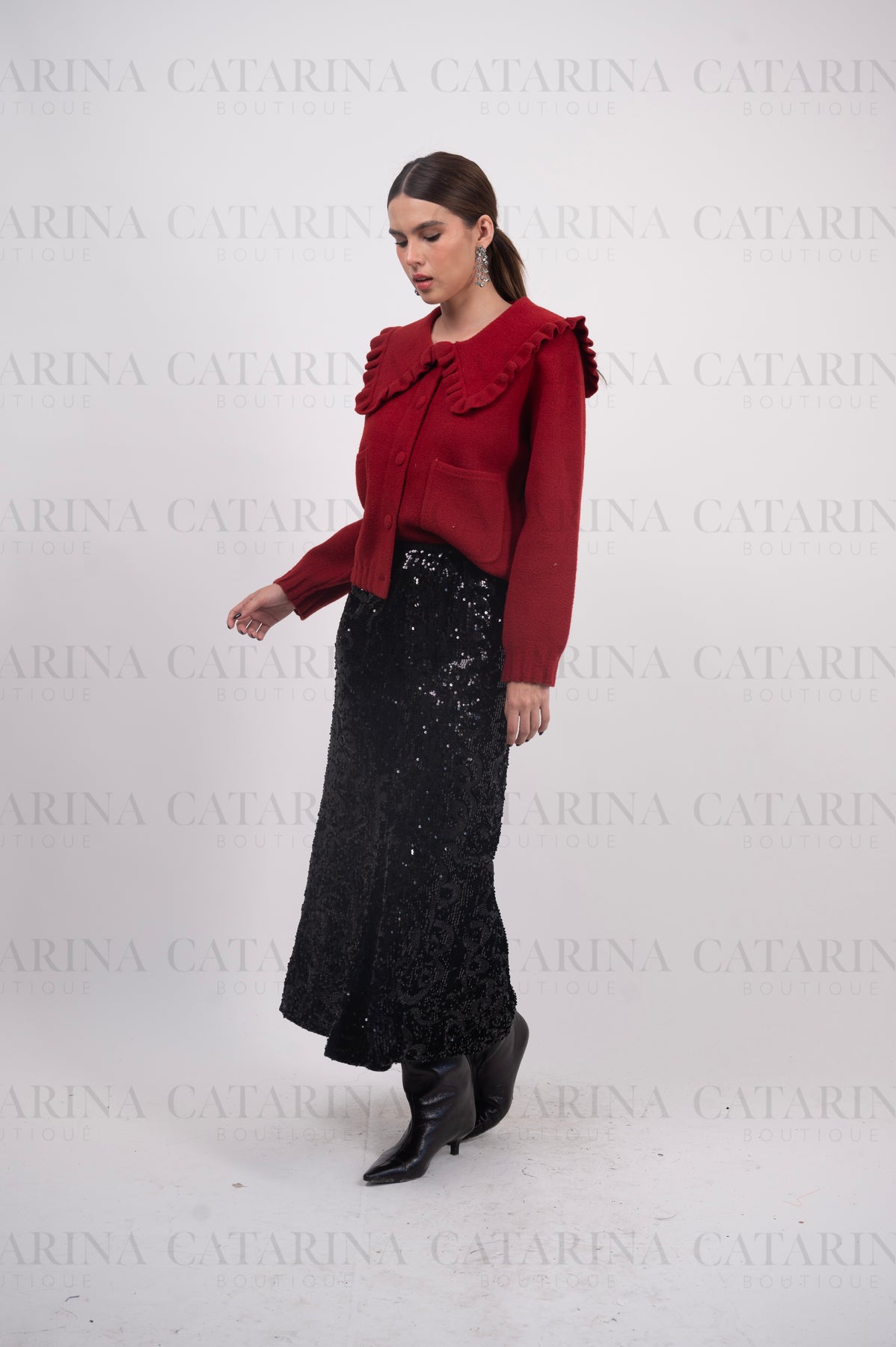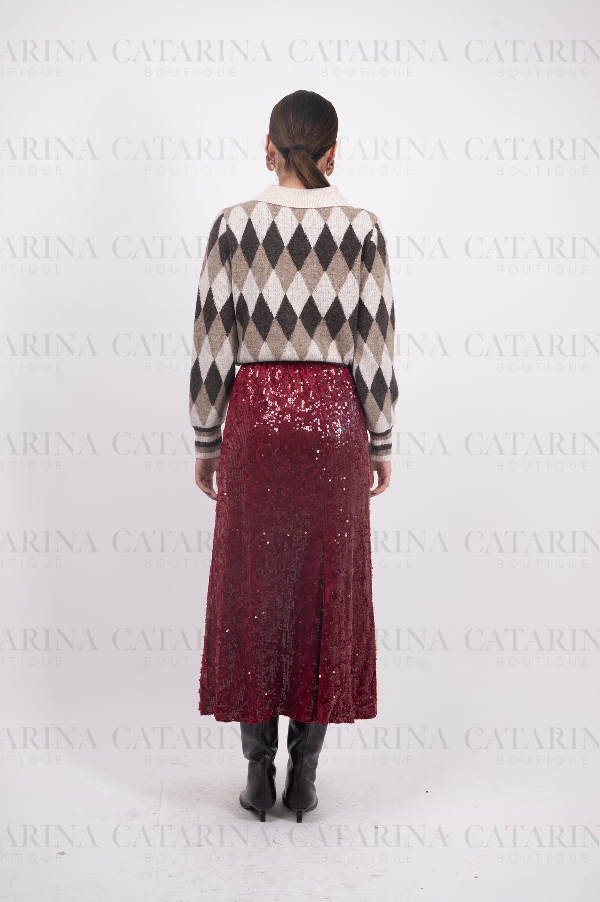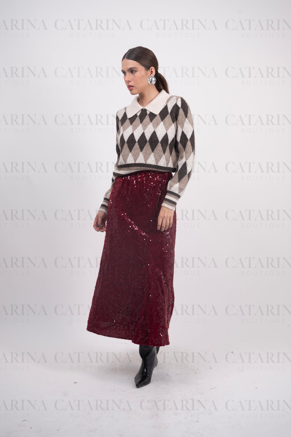 Falda de lentejuela. Elástico en cintura. Bajo acabado recto.
