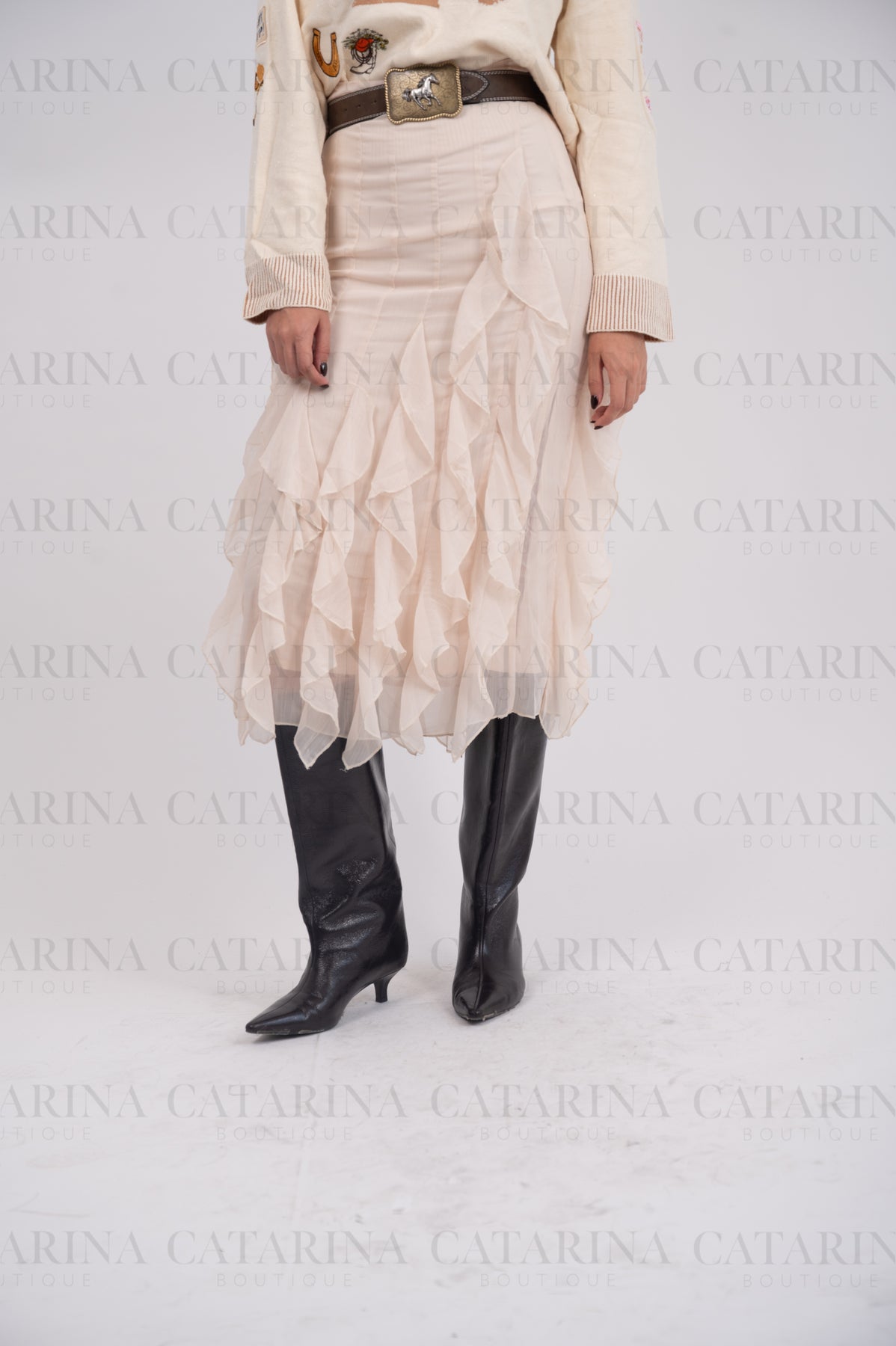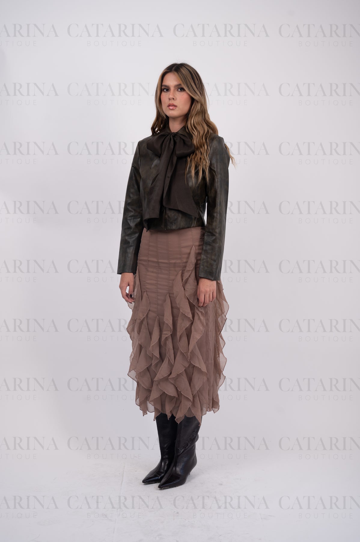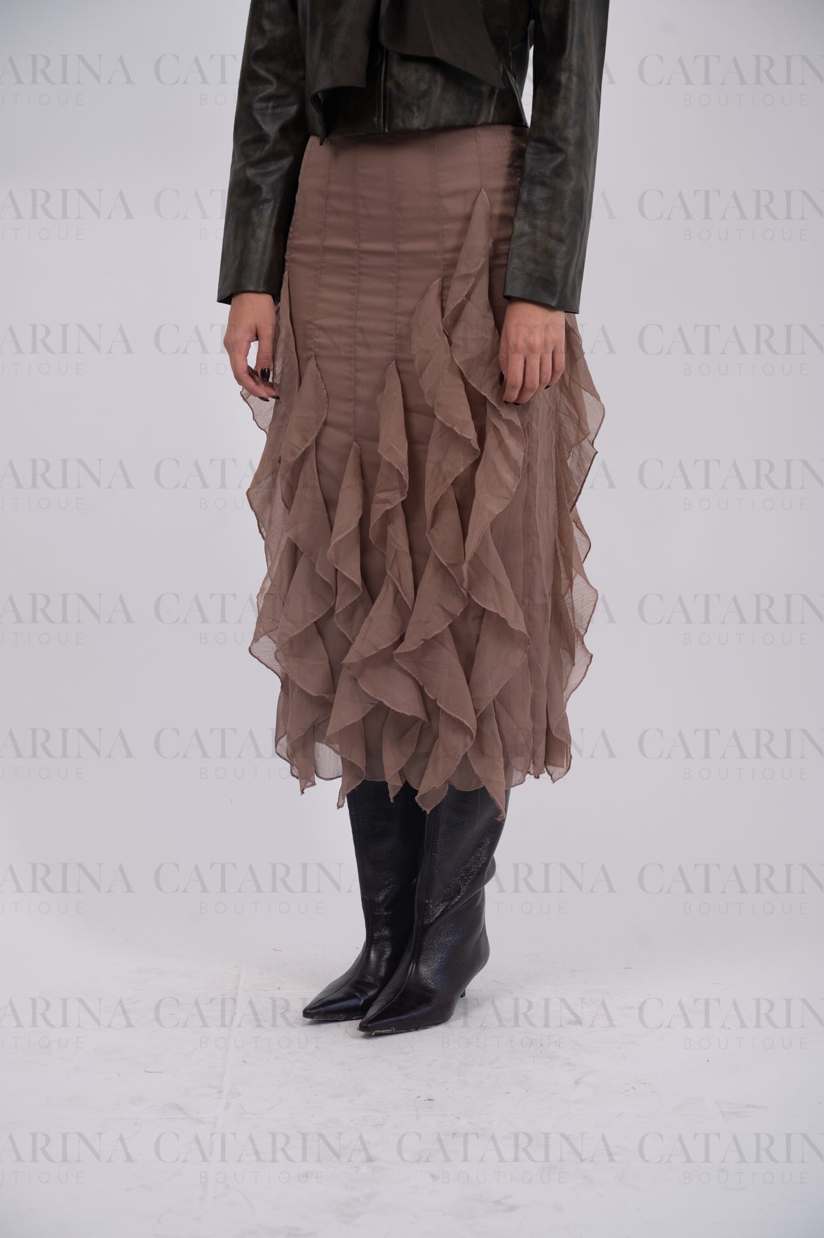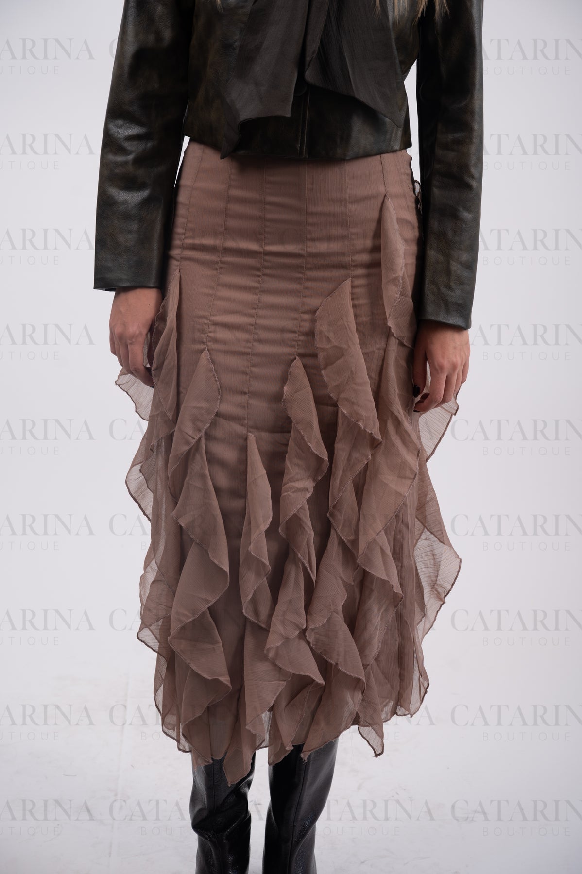 Falda de color liso.  Detalle de olanes. Bajo acabado recto.  Cierre oculto.