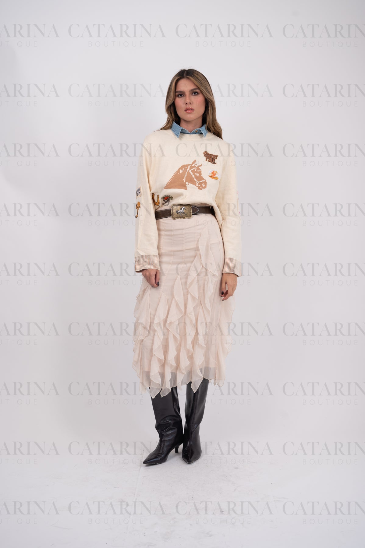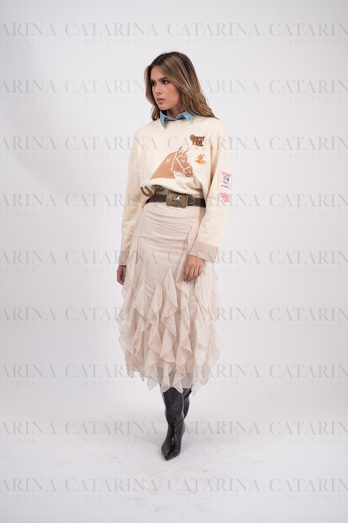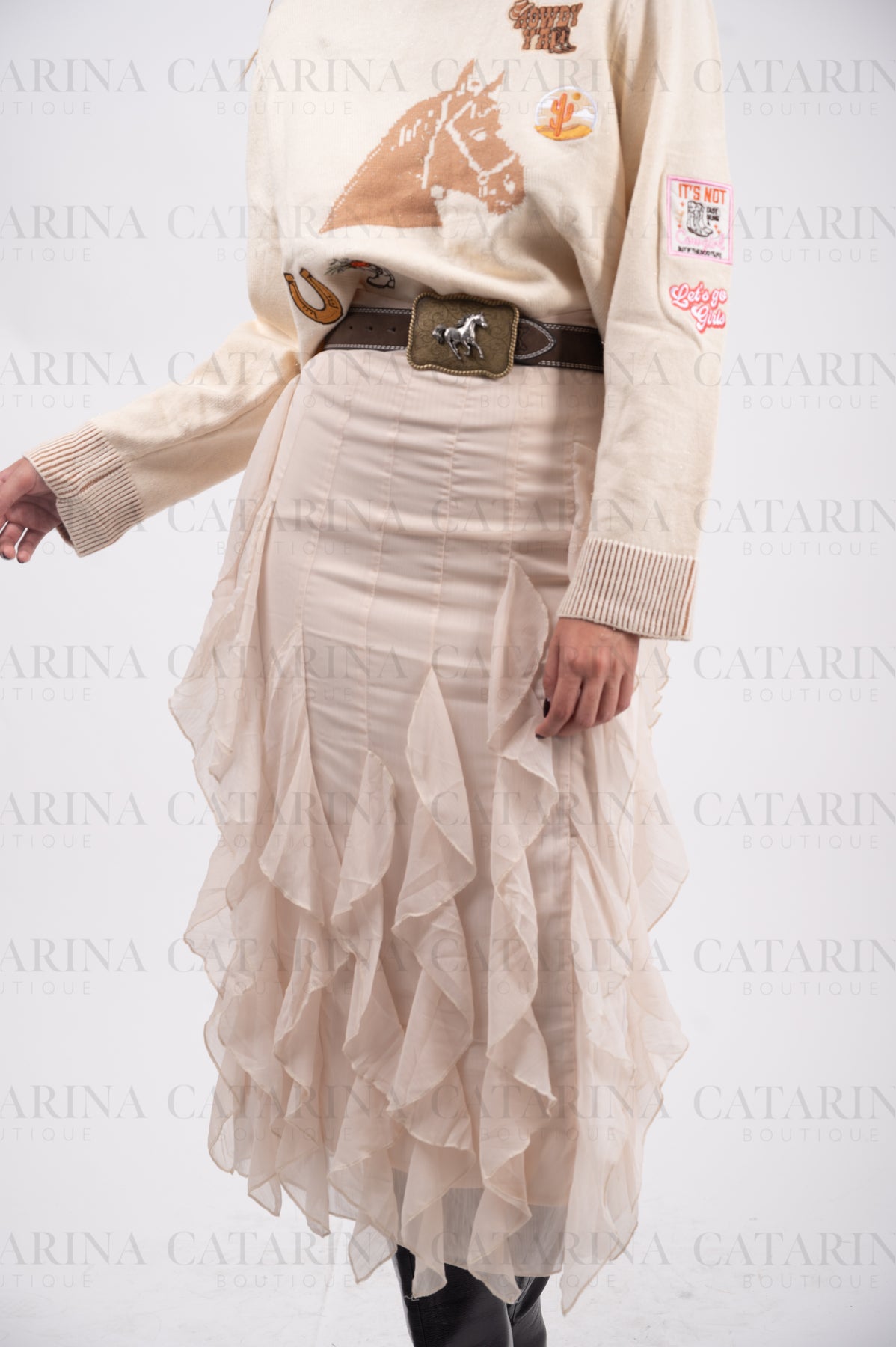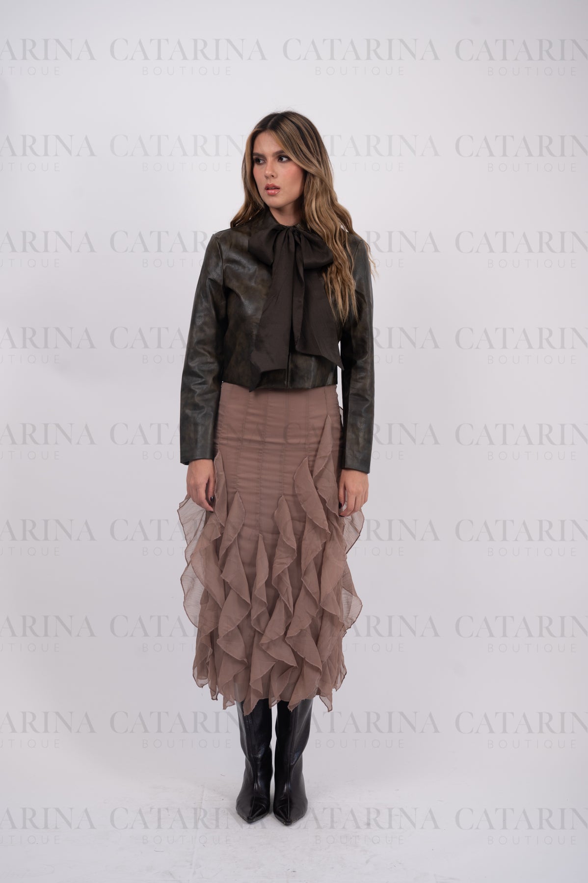Falda de color liso.  Detalle de olanes. Bajo acabado recto.  Cierre oculto.