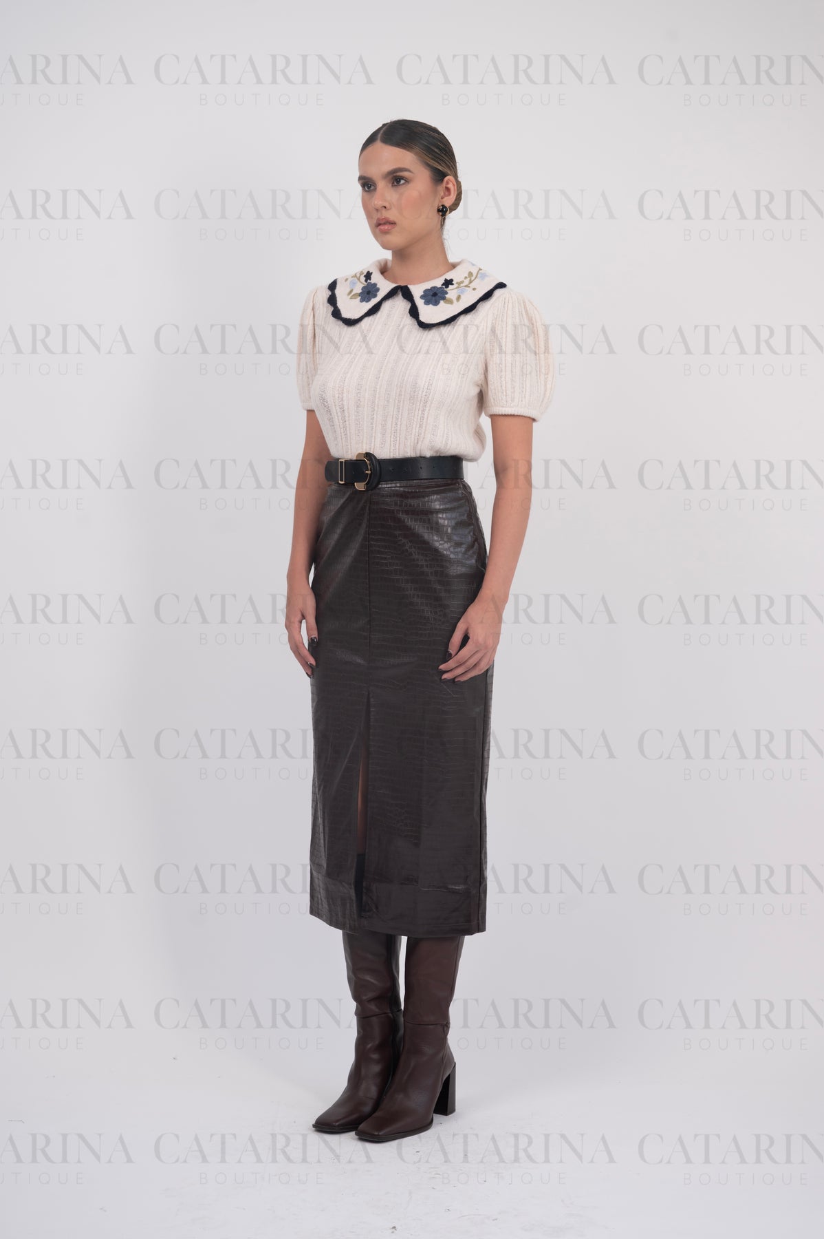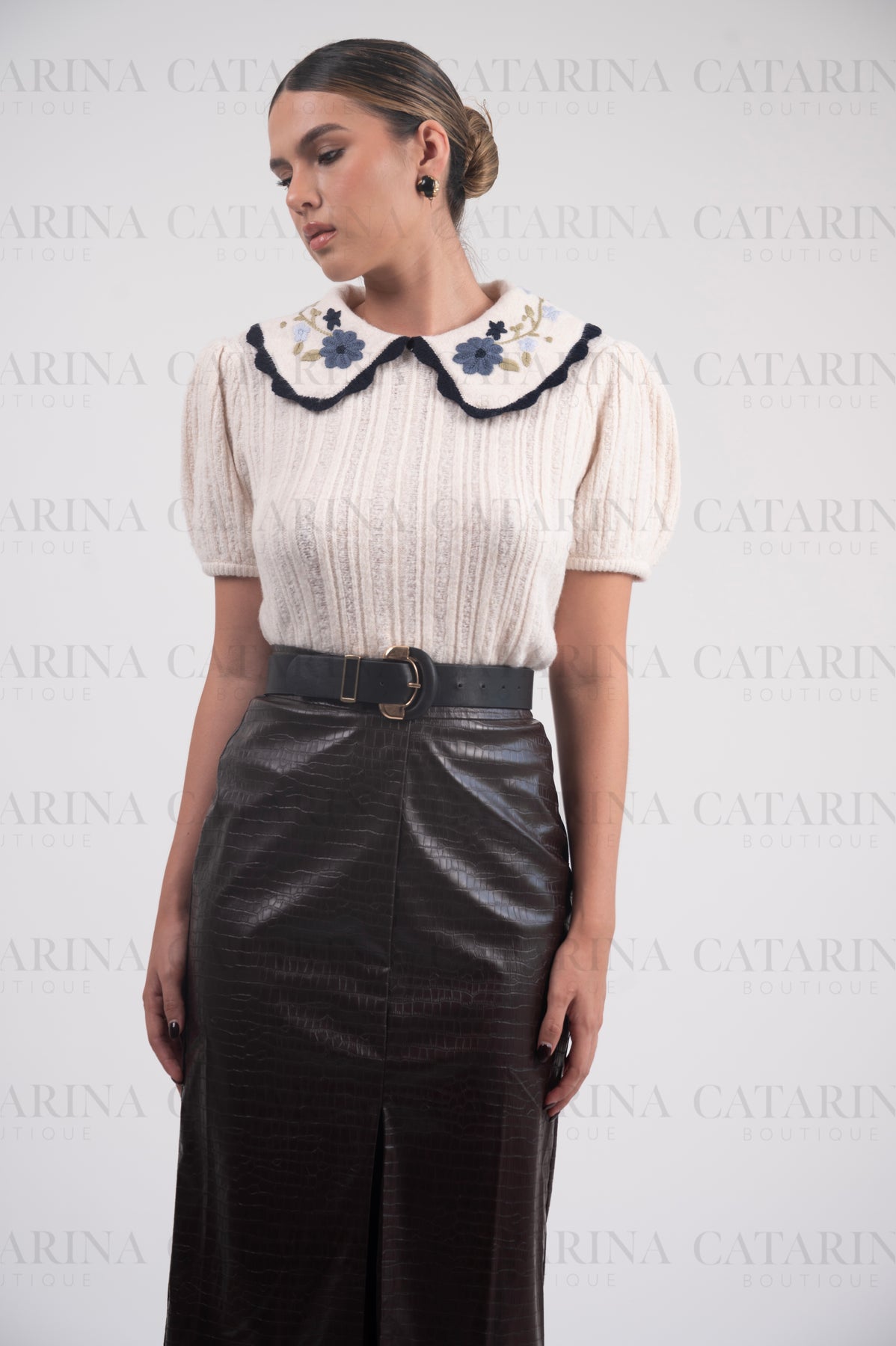 Blusa de mangas cortas abullonadas. Cuello grande tipo Peter Pan con bordes festoneados, está adornado con un bordado floral.