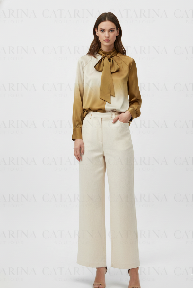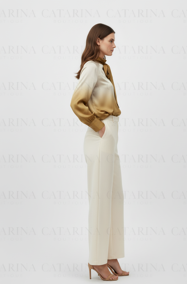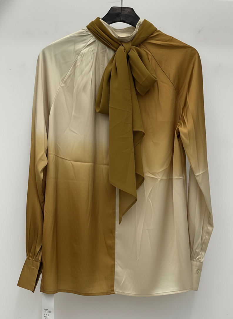 Blusa de manga larga con caída fluida. Efecto degradado. Cuello alto con un lazo.