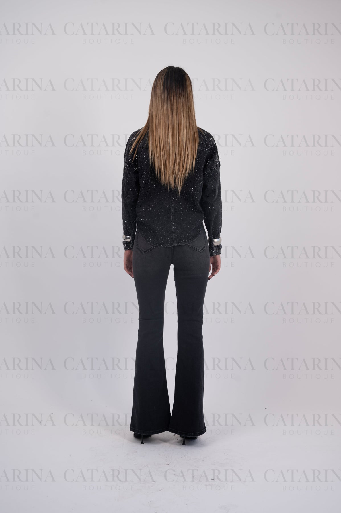 Camisero de color liso. Botones al frente. Bolsillo en el pecho. Cuello tipo americano. Bajo acabado Detalle de brillos en color plata.