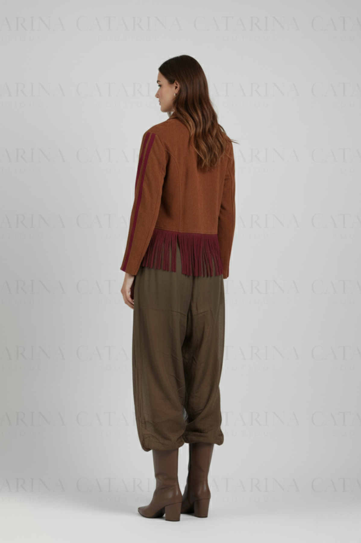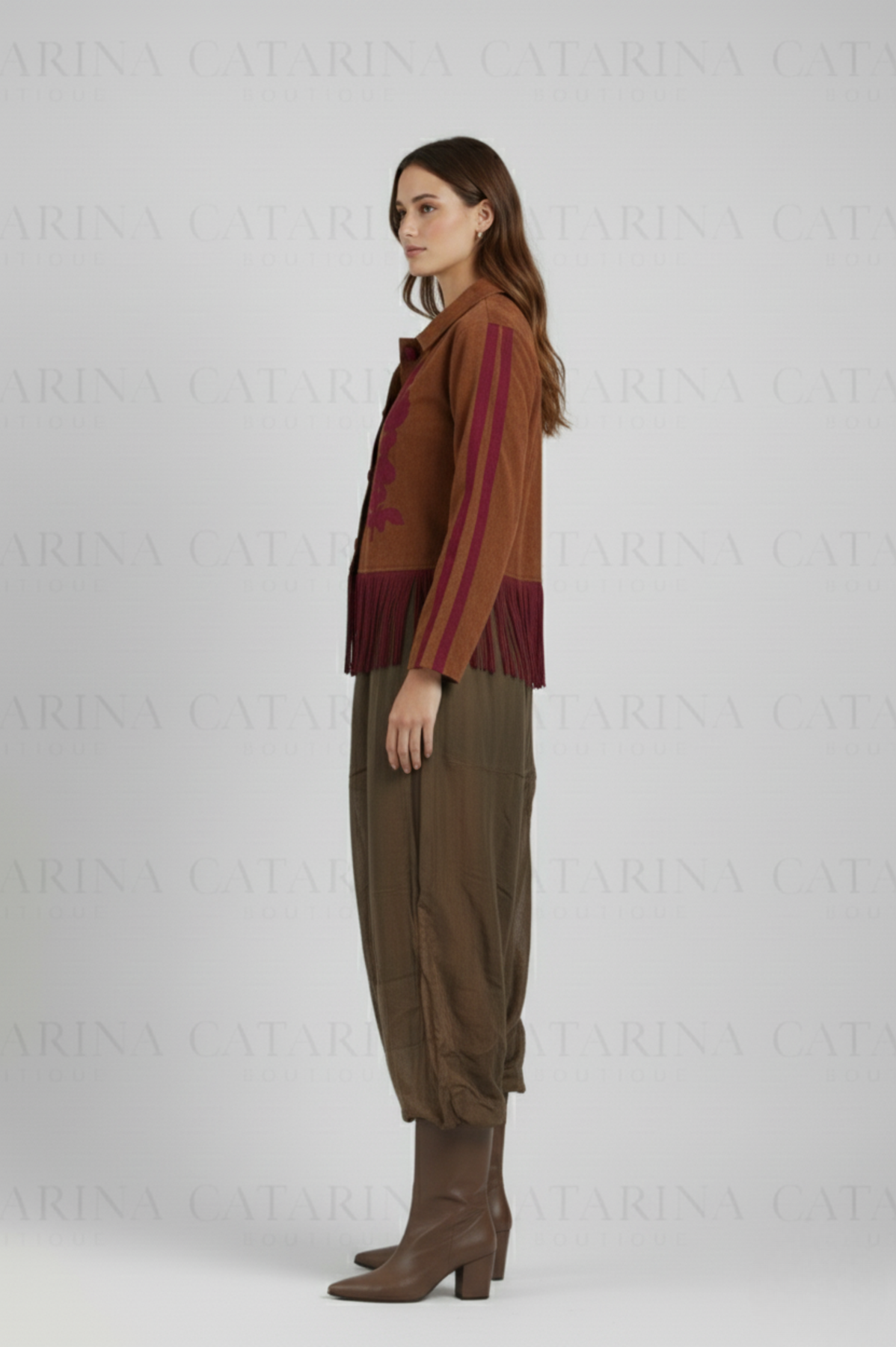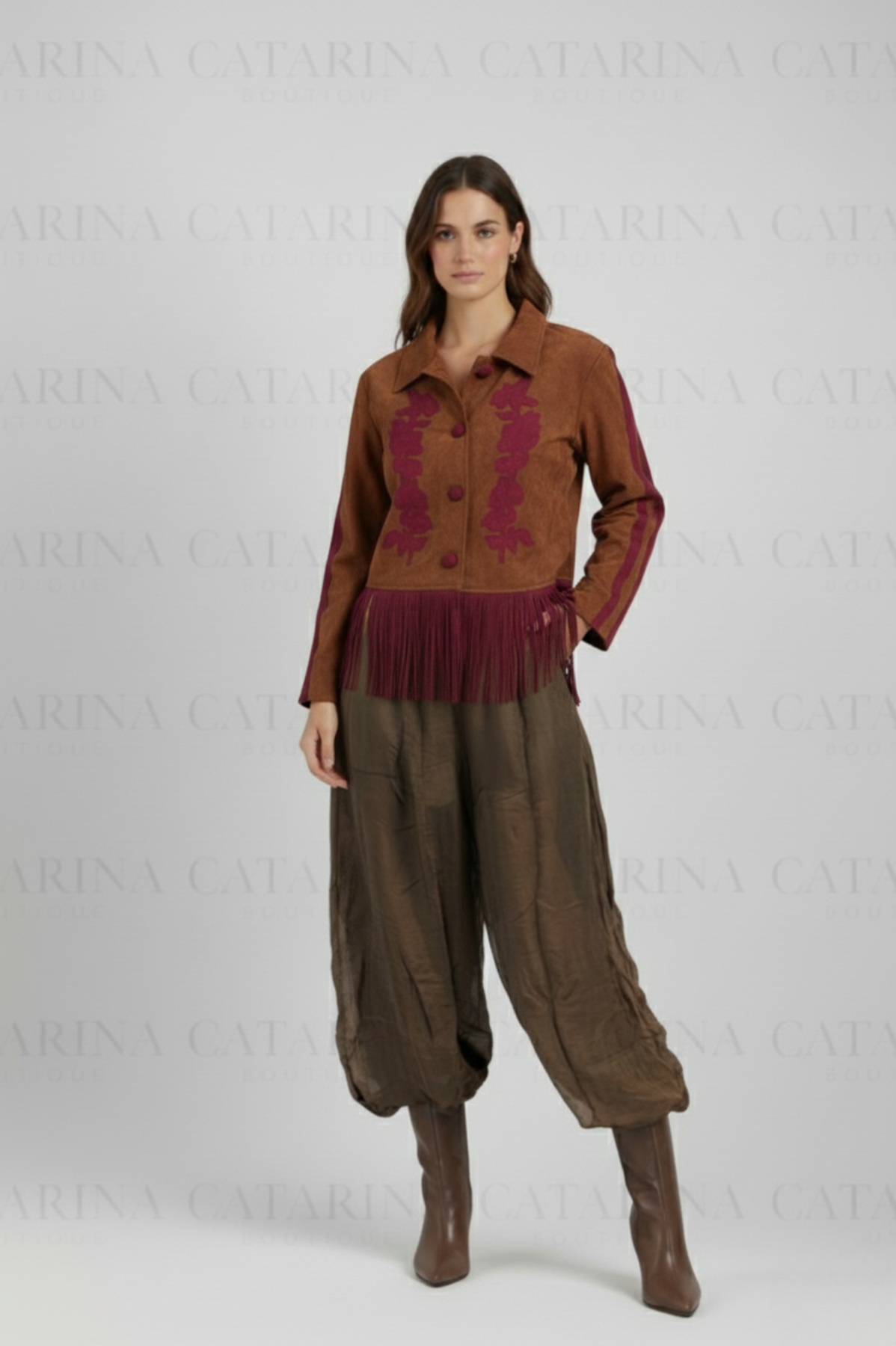 Chamarra Western. Detalle de flecos que cuelgan en el bajo. Cierre frontal de botones.
