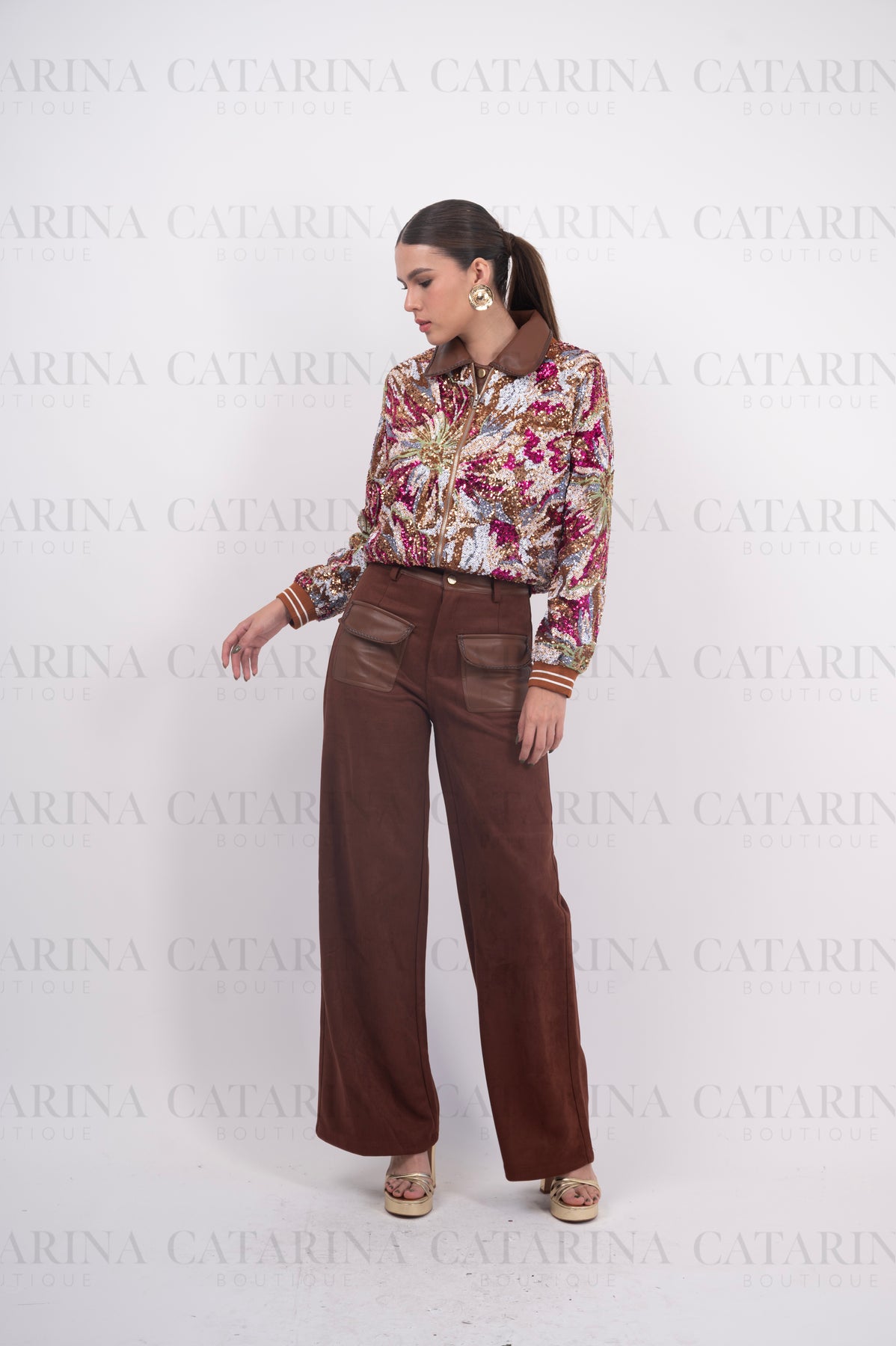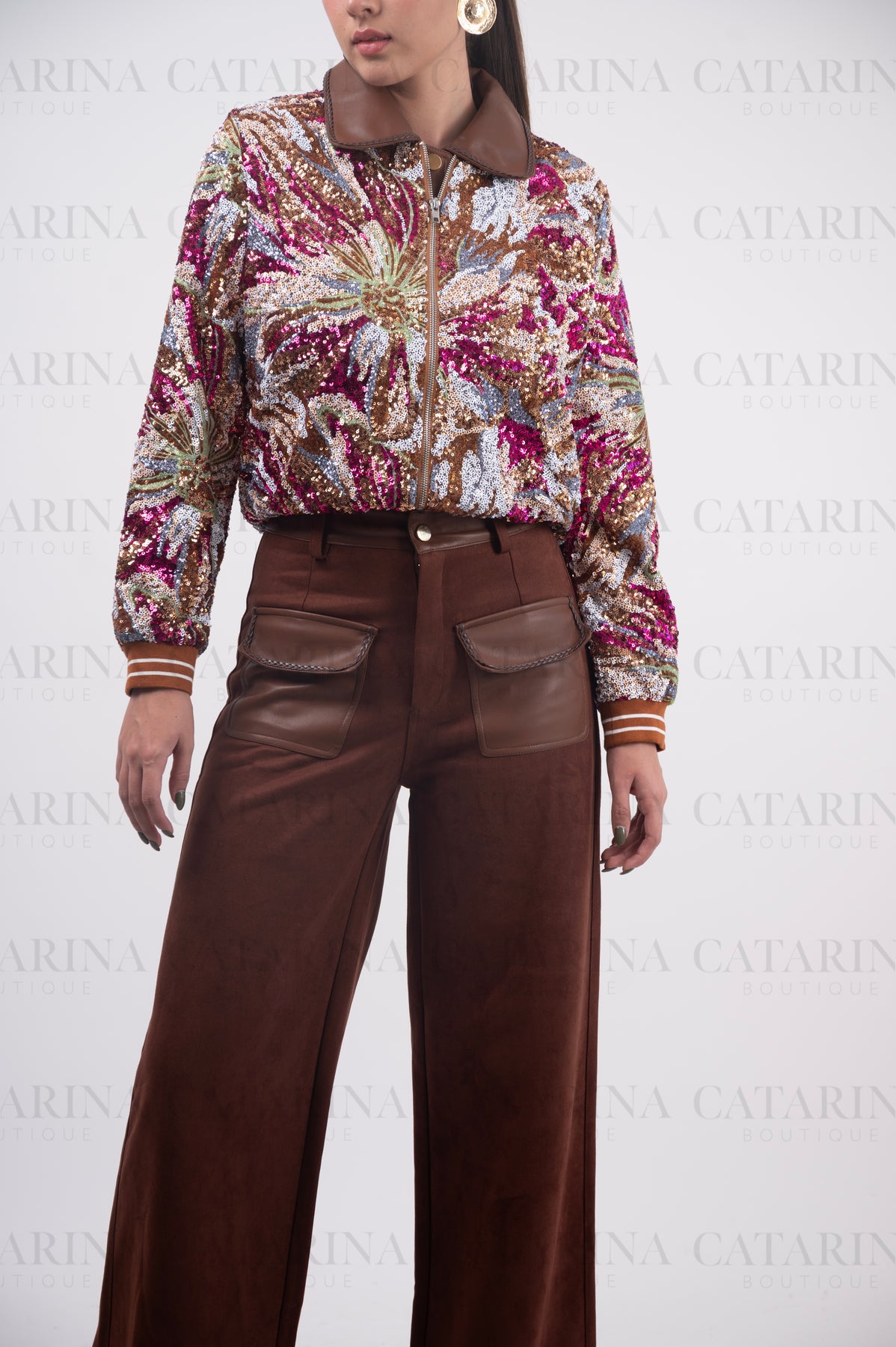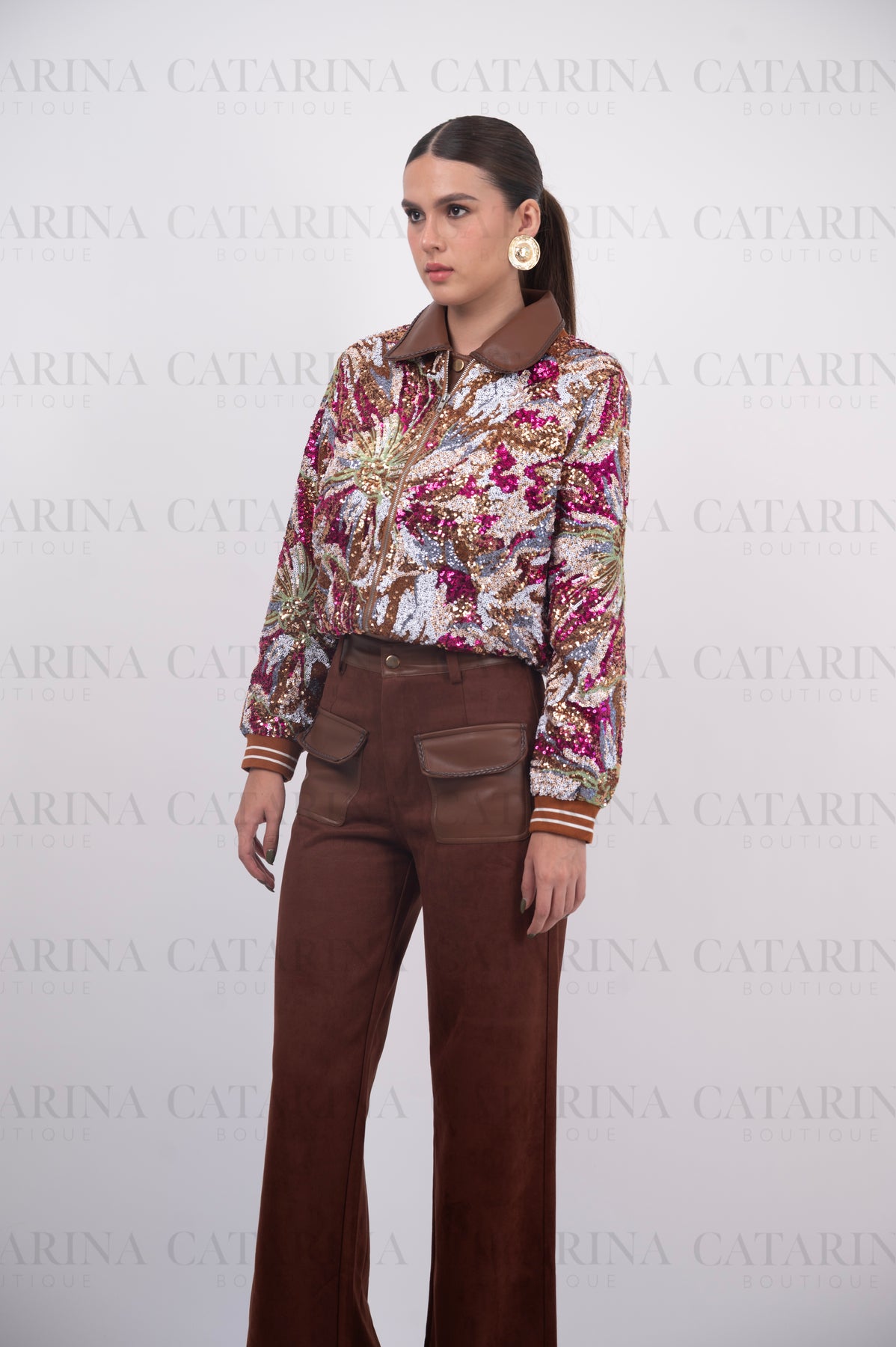 Chaqueta con lentejuela. Corte recto. Escote redondo. Cierre al frente.