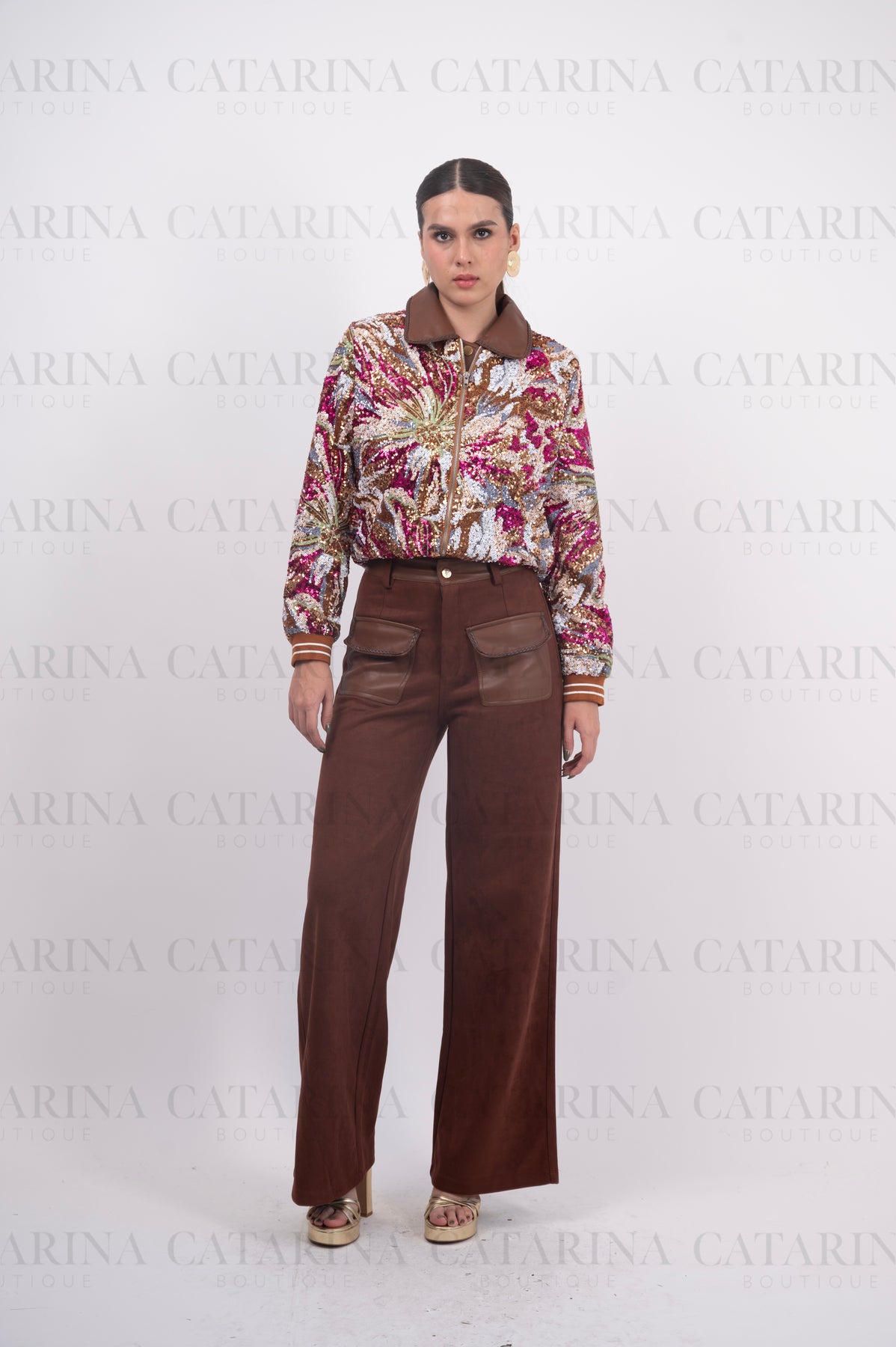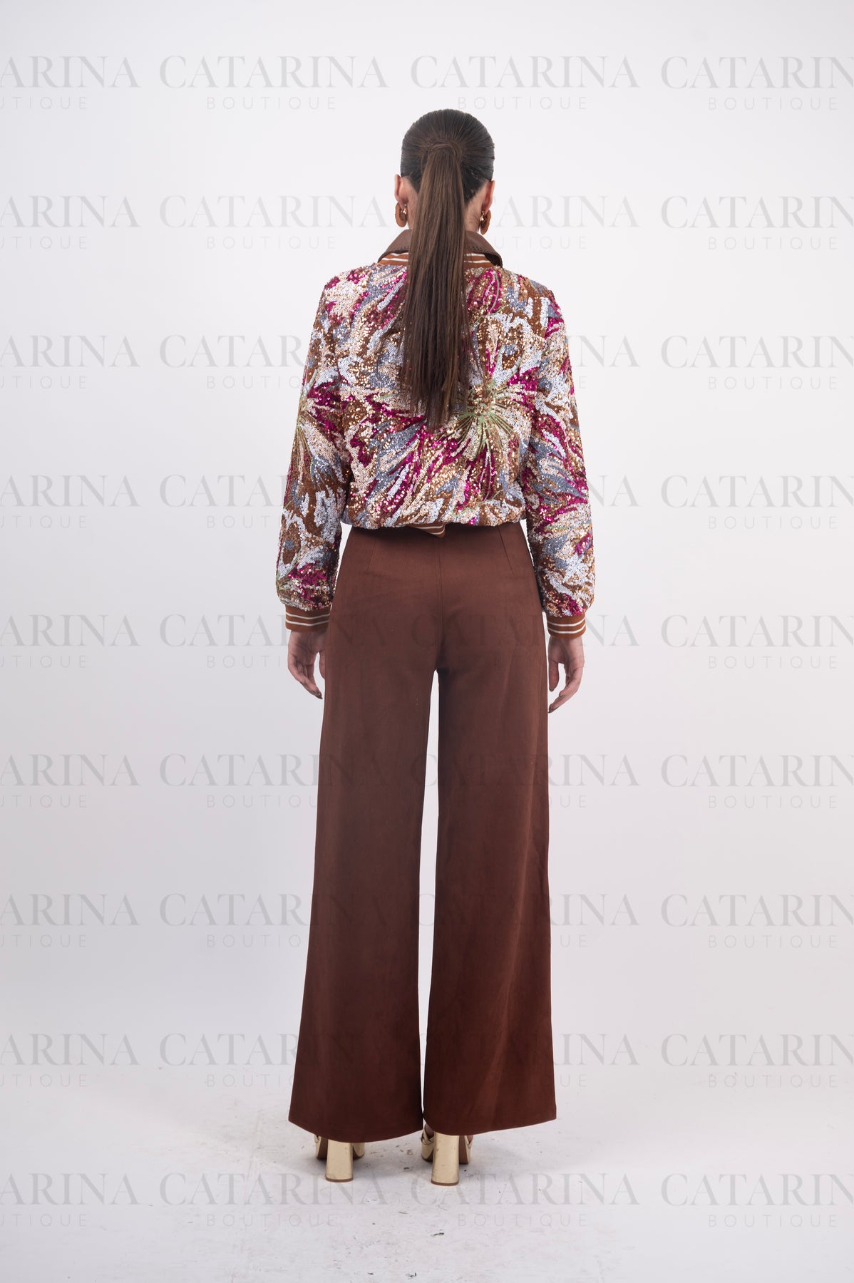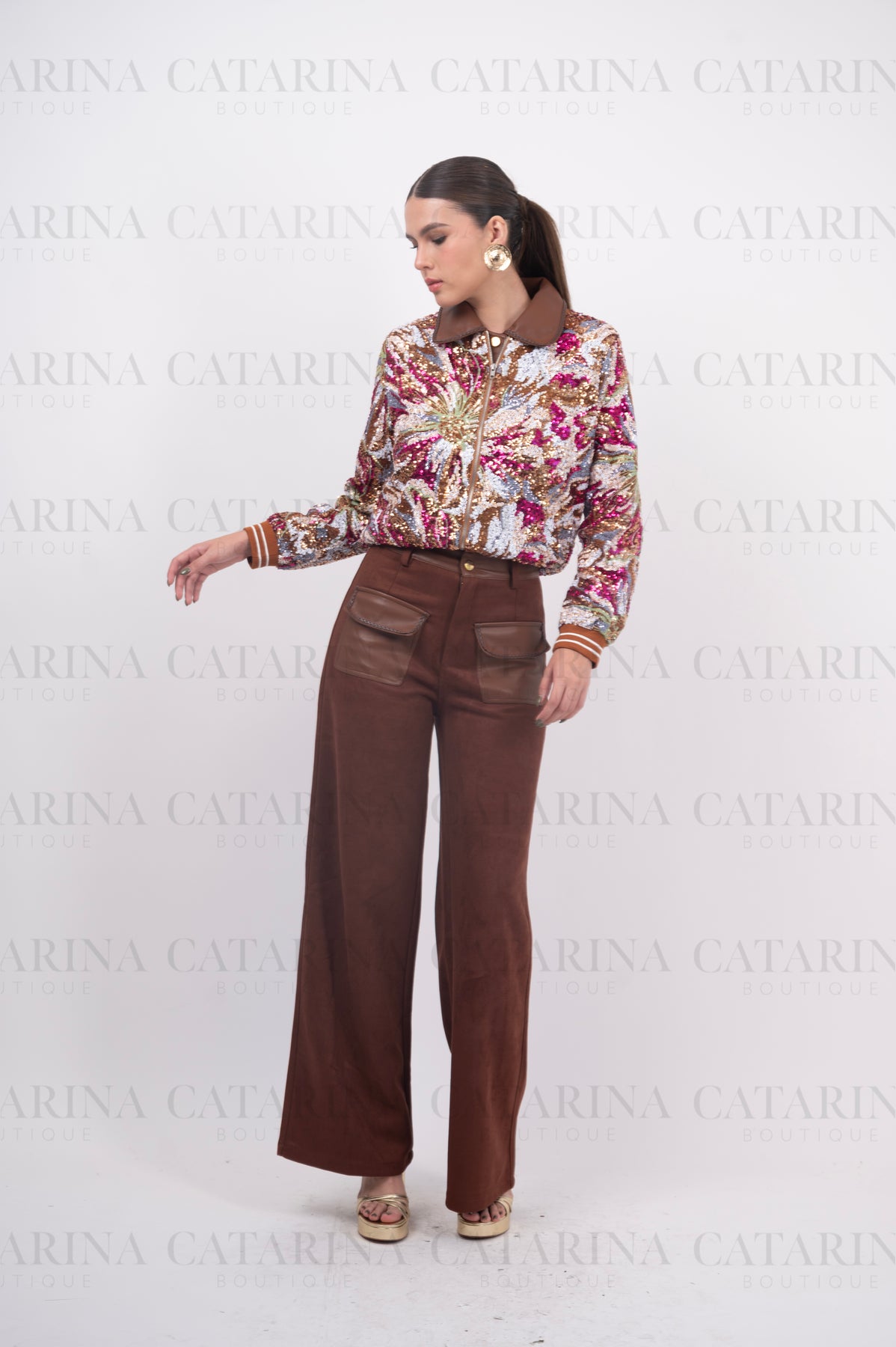 Chaqueta con lentejuela. Corte recto. Escote redondo. Cierre al frente.