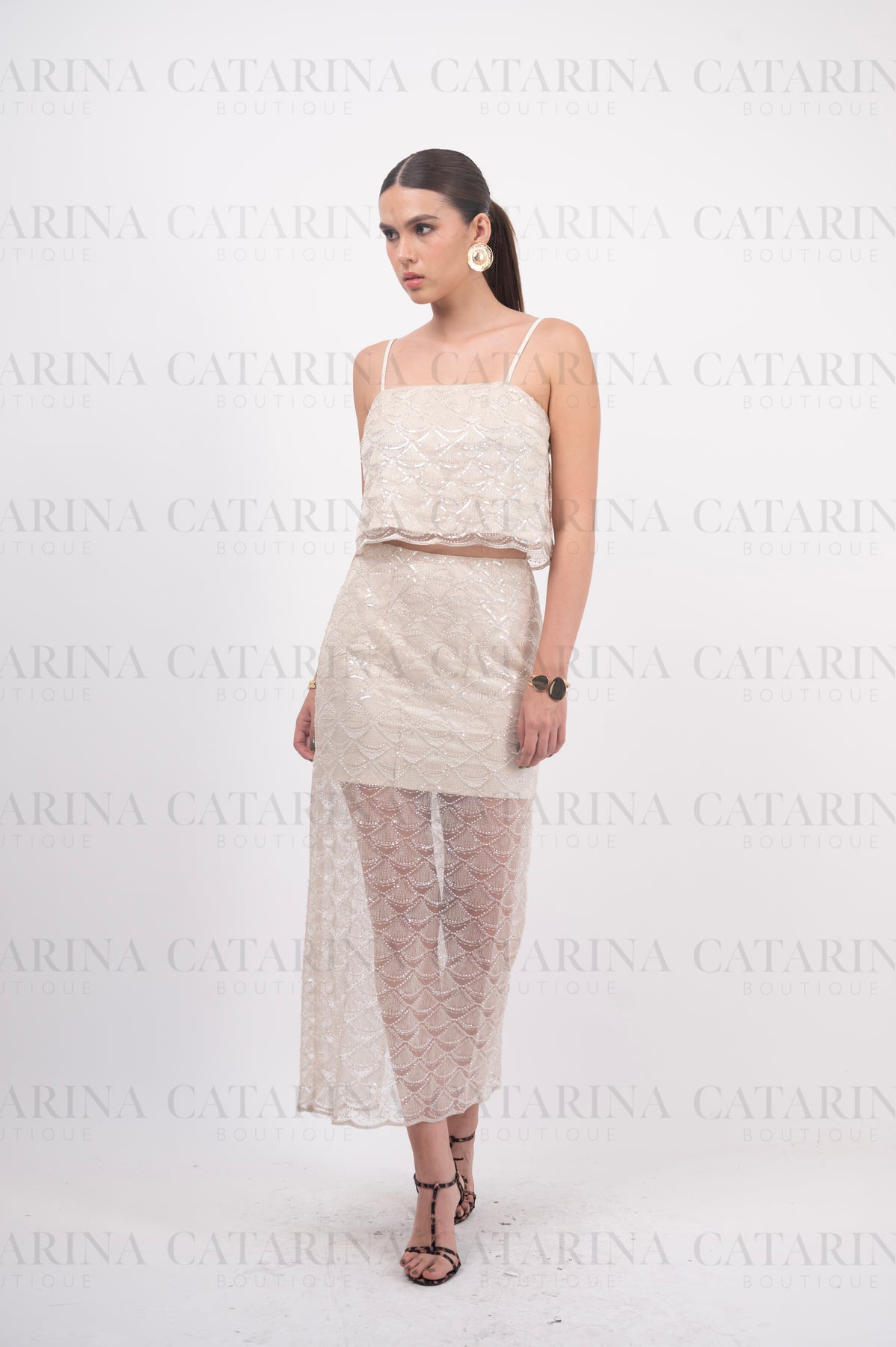 Conjunto de top de escote recto. Tirantes delgados. Falda de bajo acabado recto.