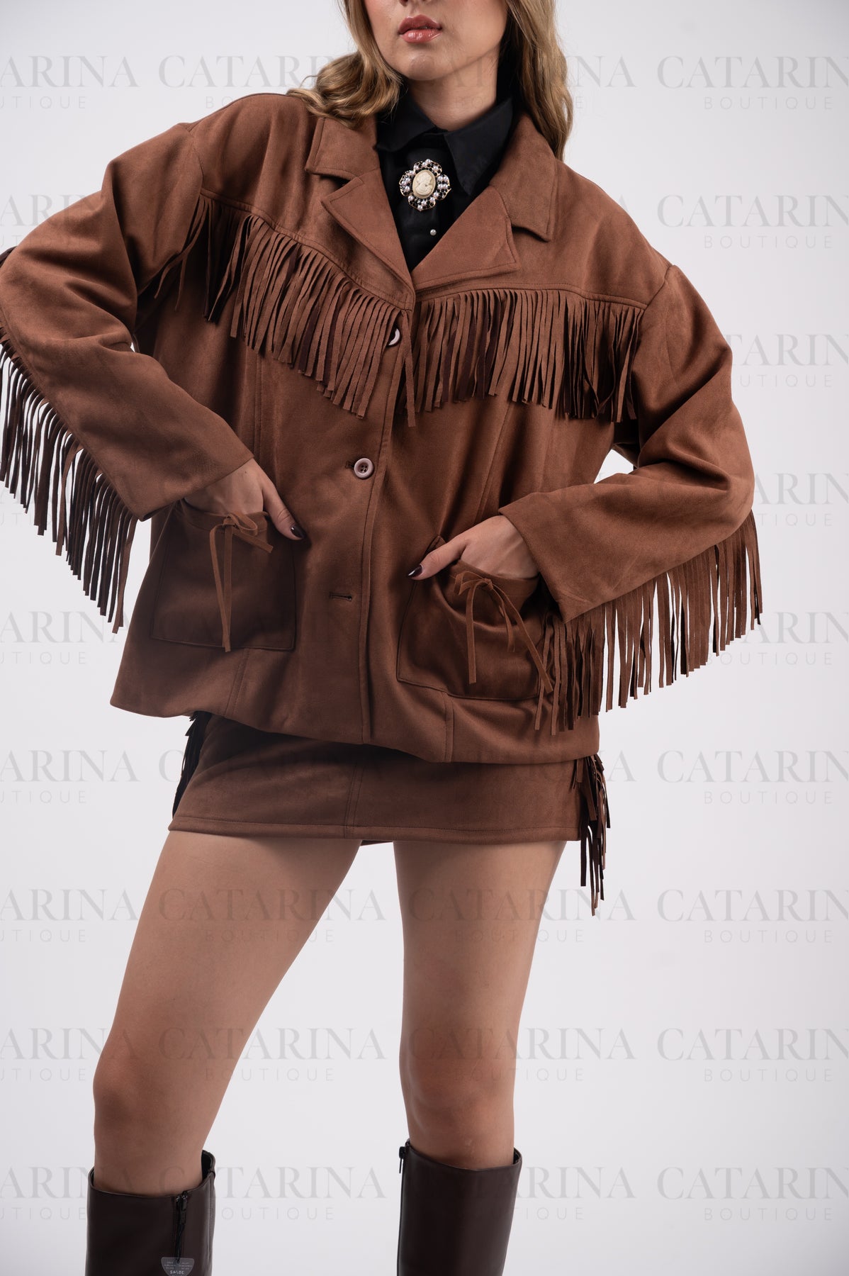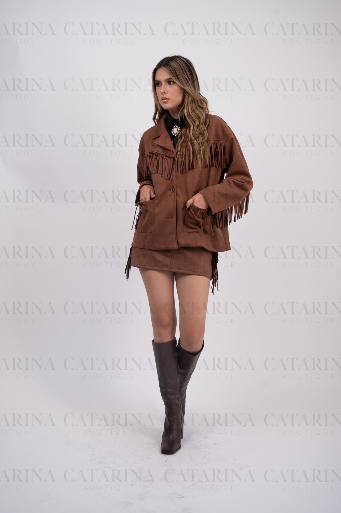 Conjunto de dos piezas. Chaqueta de manga larga, con solapas y flecos decorativos en las costuras de las mangas y el frente. Falda de corte clásico y también tiene flecos en los laterales, a juego con la chaqueta.