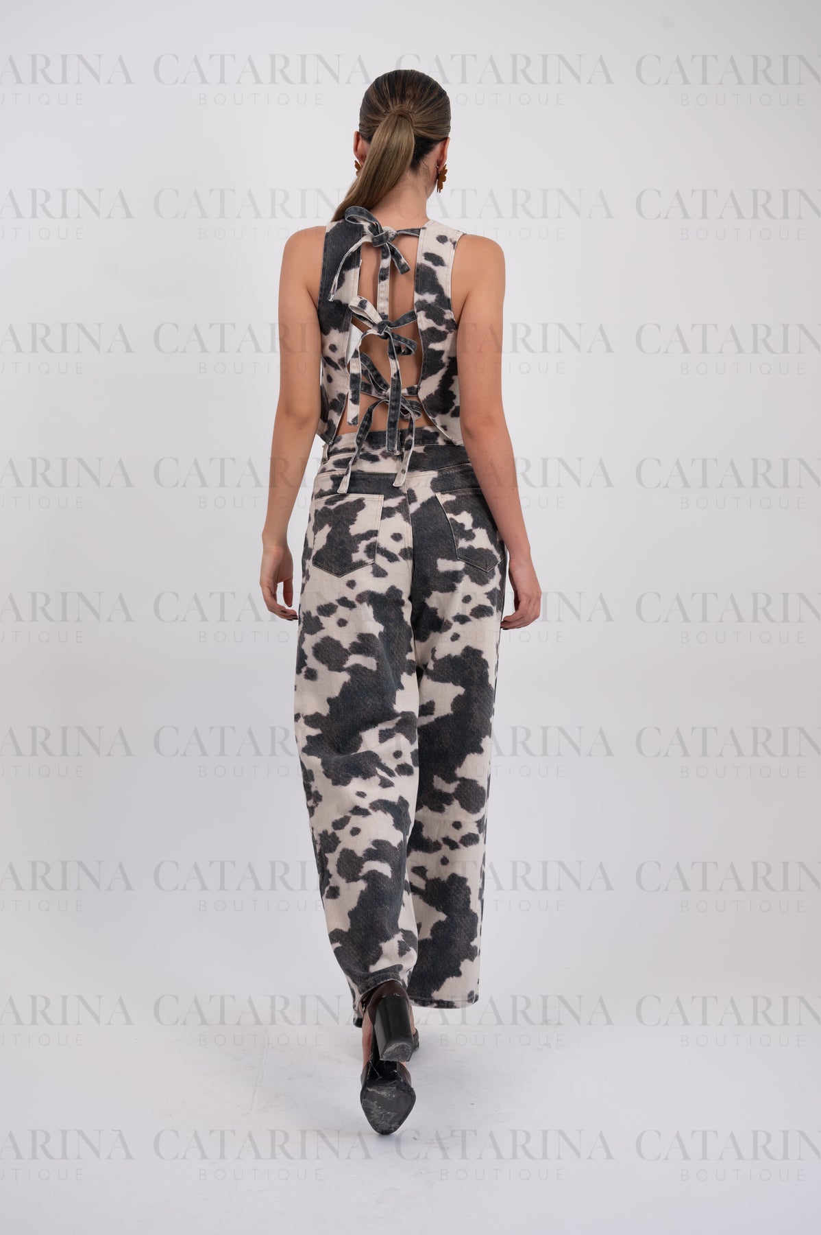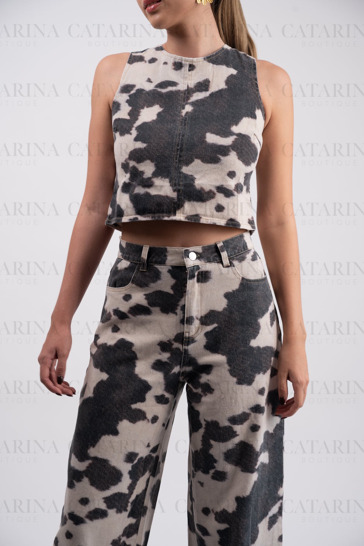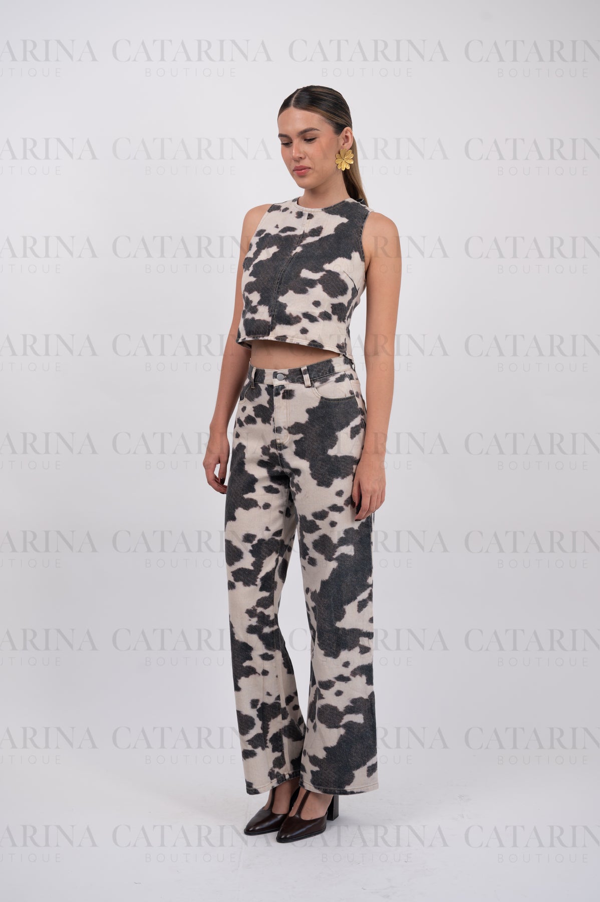 Conjunto de chaleco y pantalón. Chaleco de cuello redondo y manga sisa. Lazadas en espalda. Pantalón liso de tiro alto. Botón y cierre al frente. Bajo acabado recto.