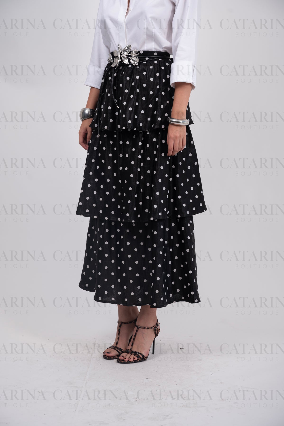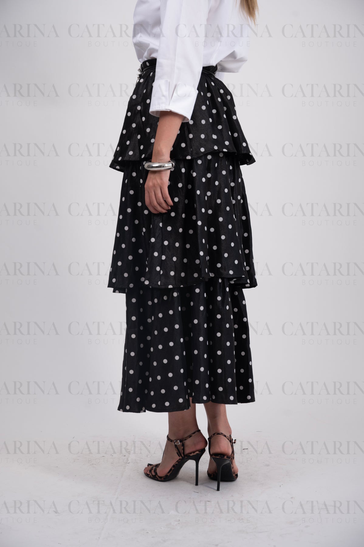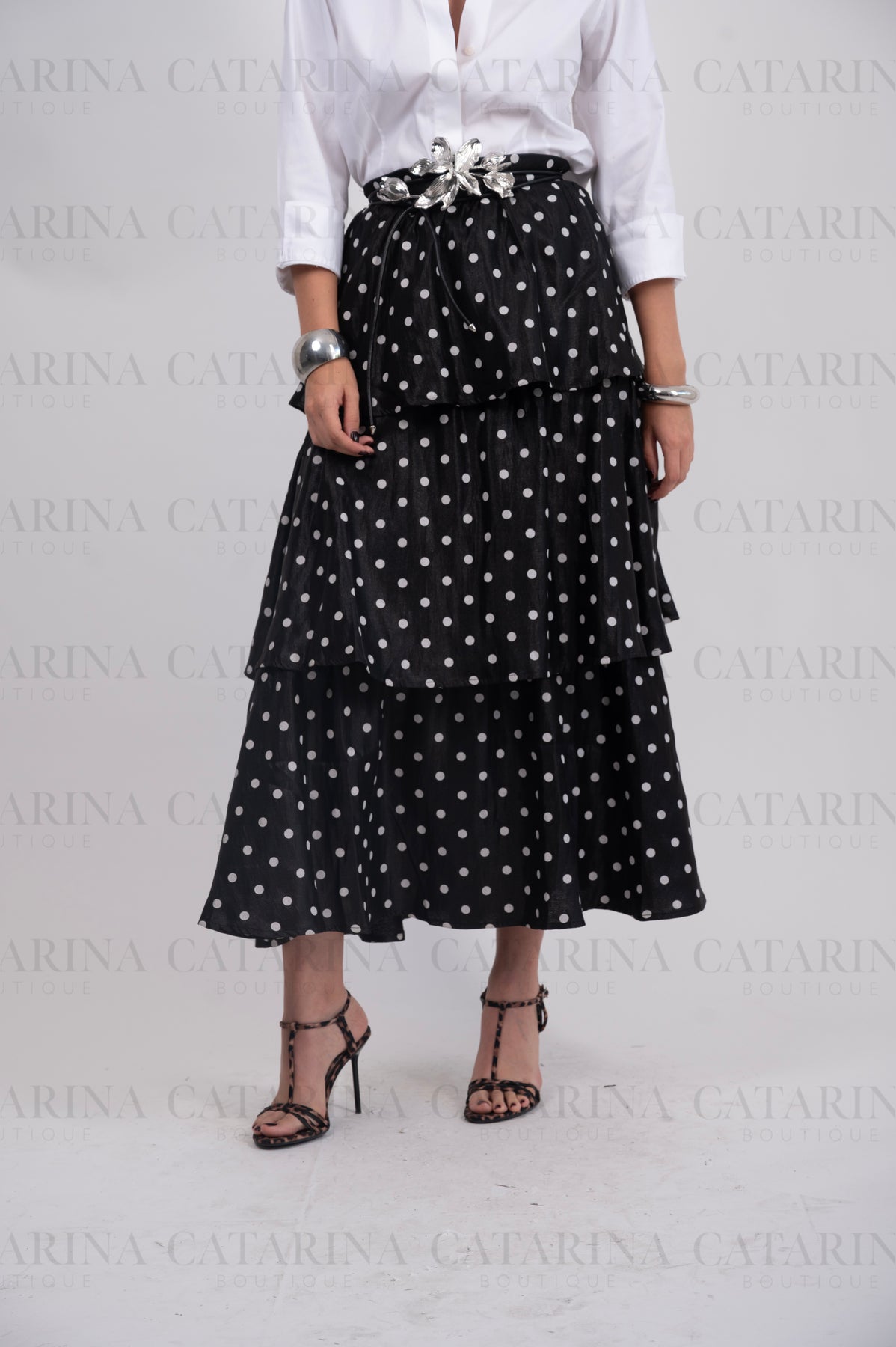 Falda de corte suelto y con vuelo. Estampado de lunares blancos sobre fondo negro. Volantes escalonados. Cintura alta con elástico en espalda, ideal para un ajuste cómodo.