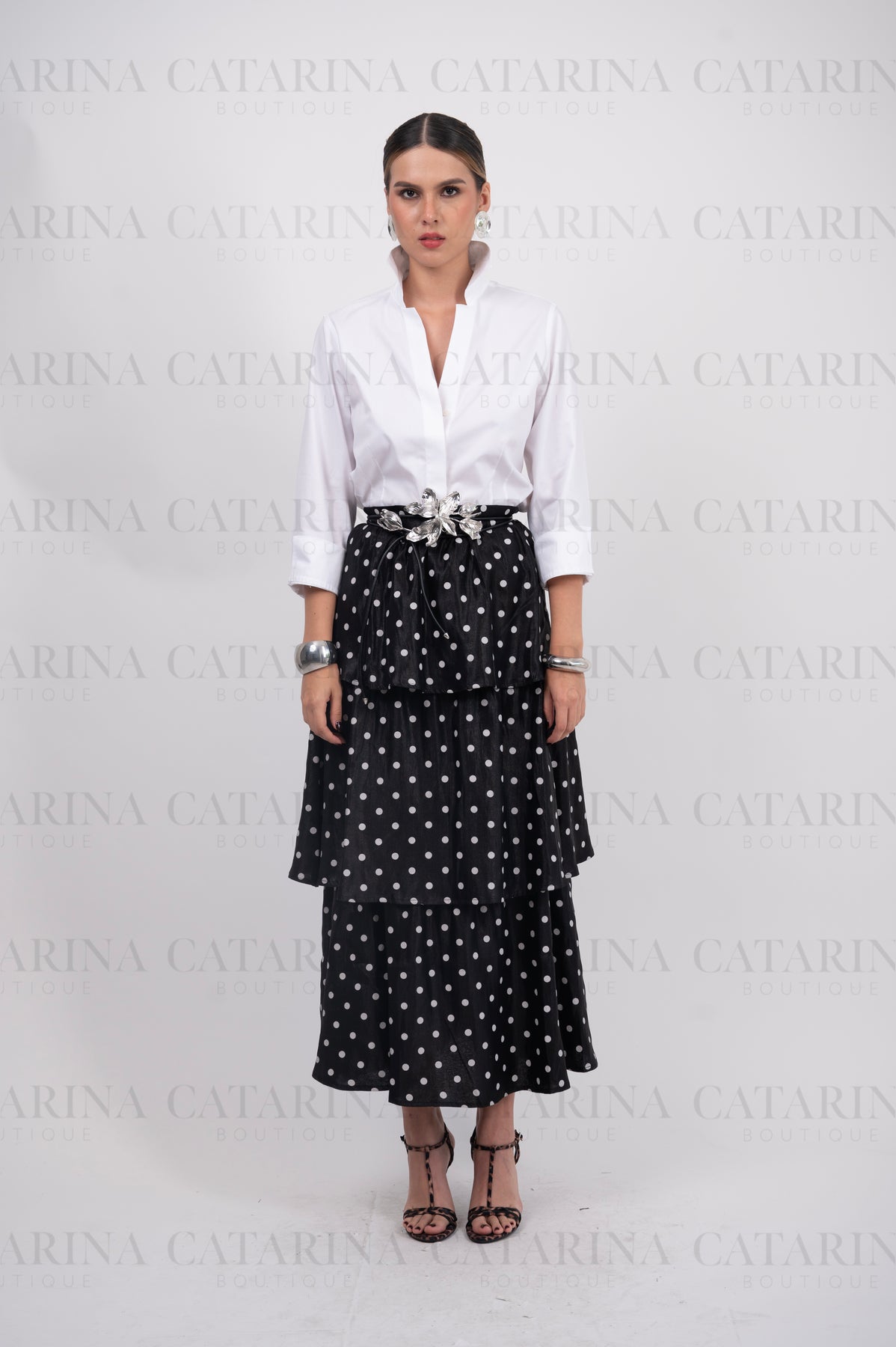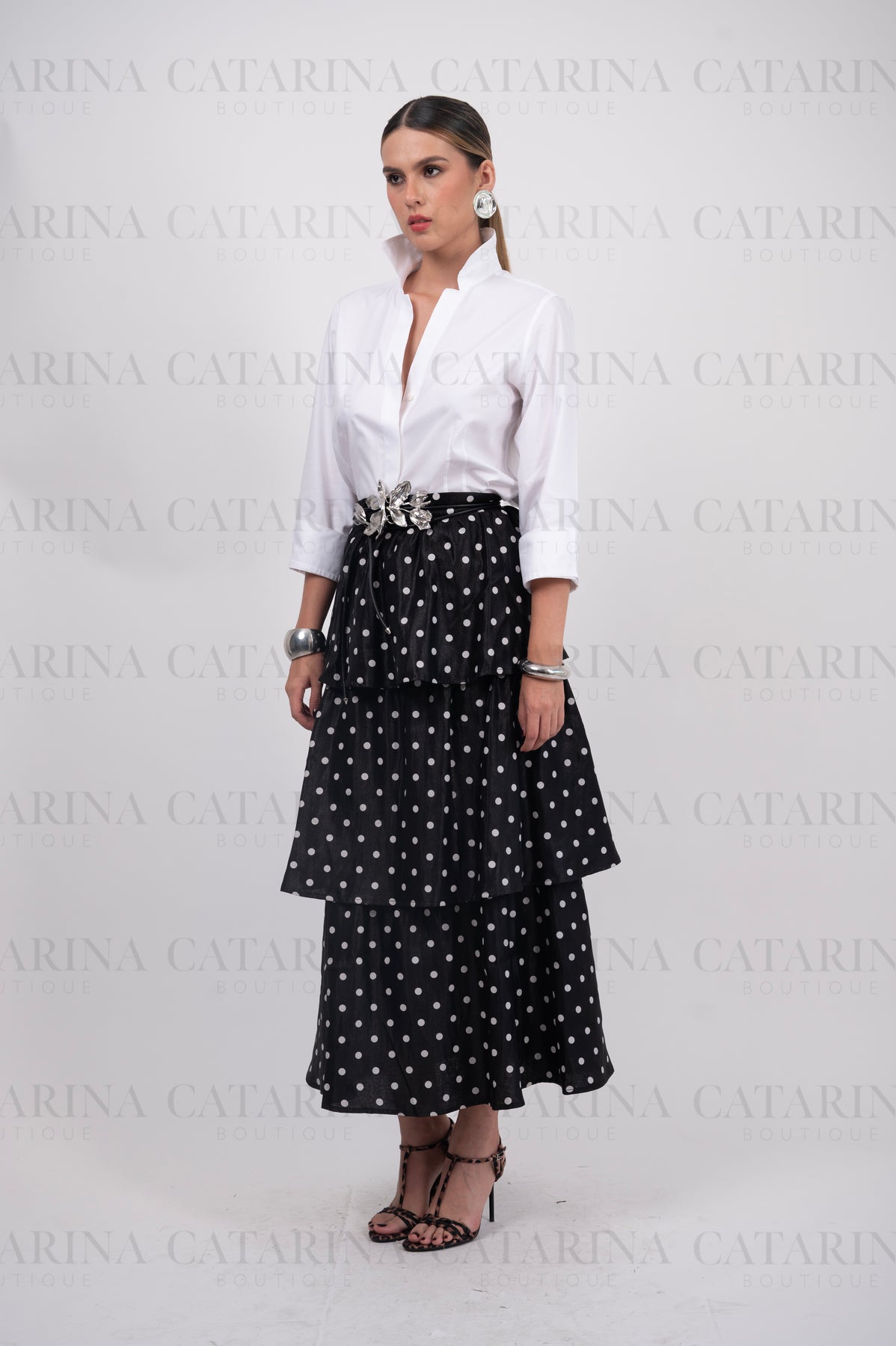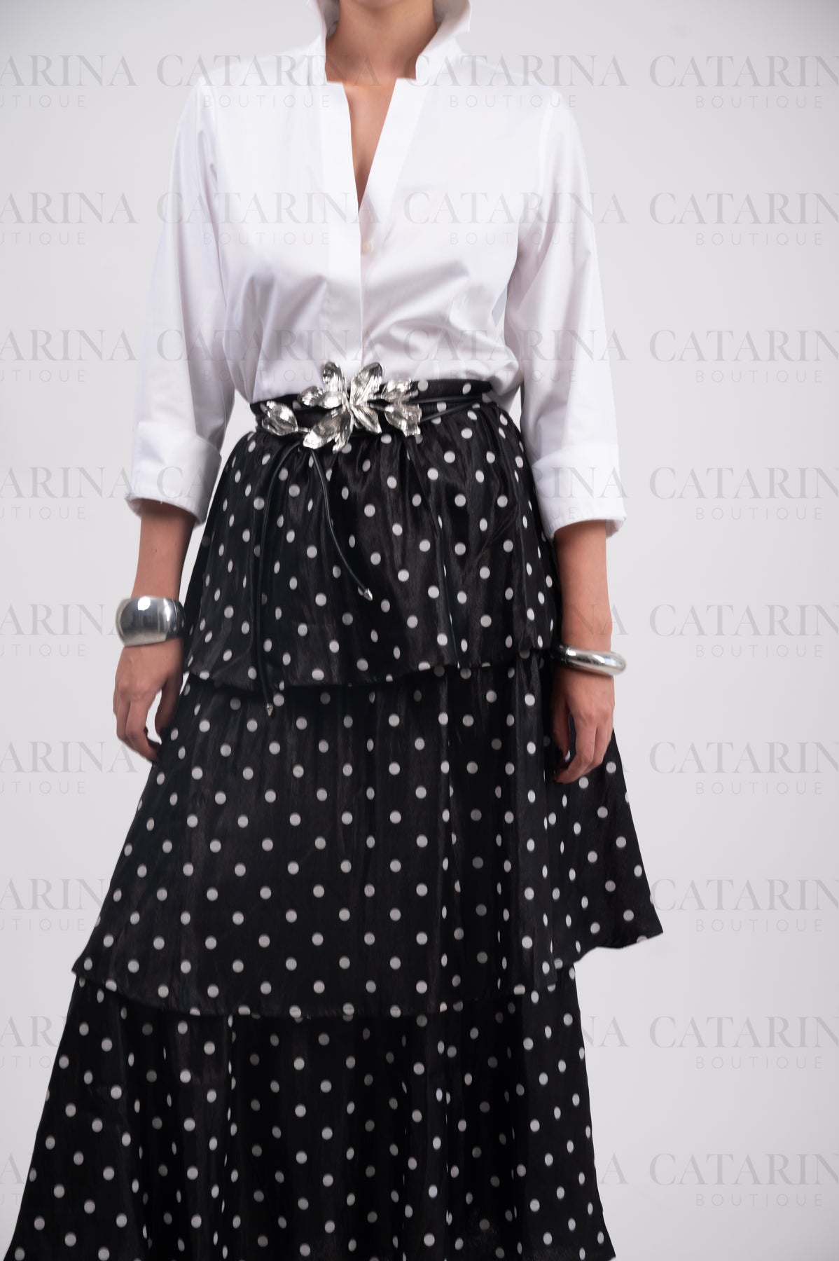 Falda de corte suelto y con vuelo. Estampado de lunares blancos sobre fondo negro. Volantes escalonados. Cintura alta con elástico en espalda, ideal para un ajuste cómodo.