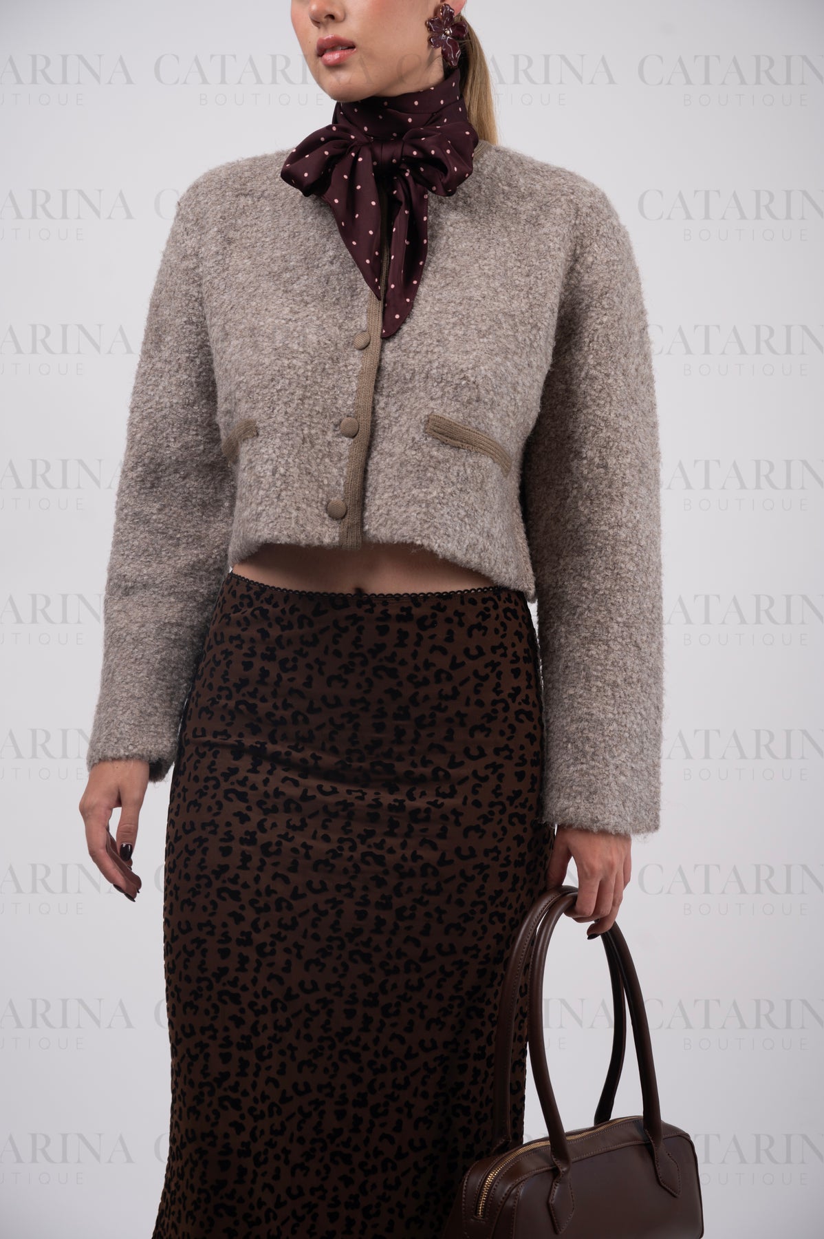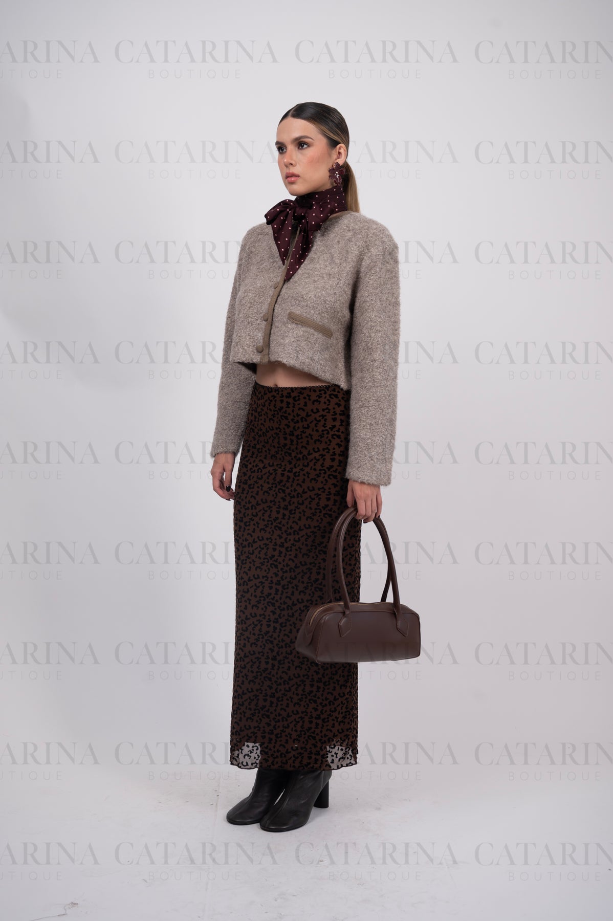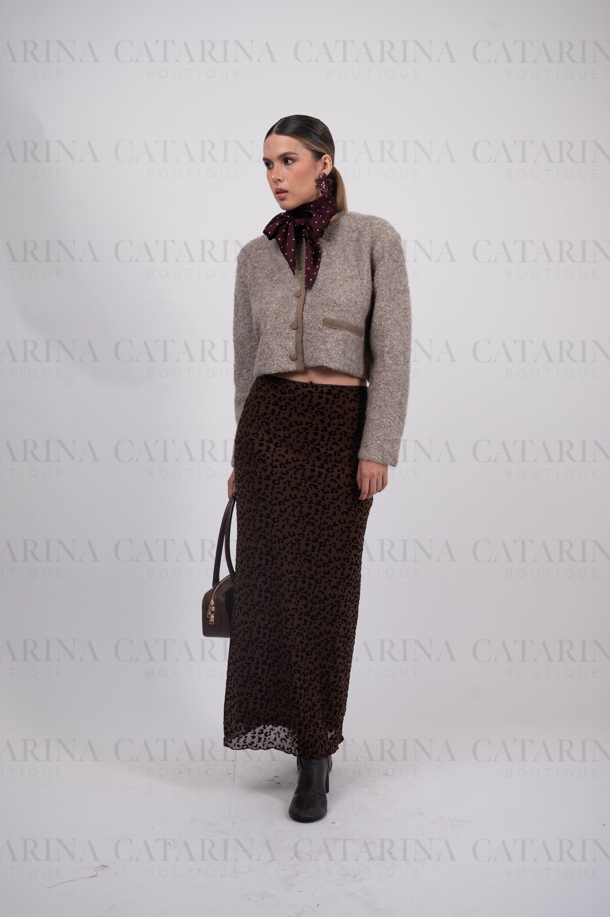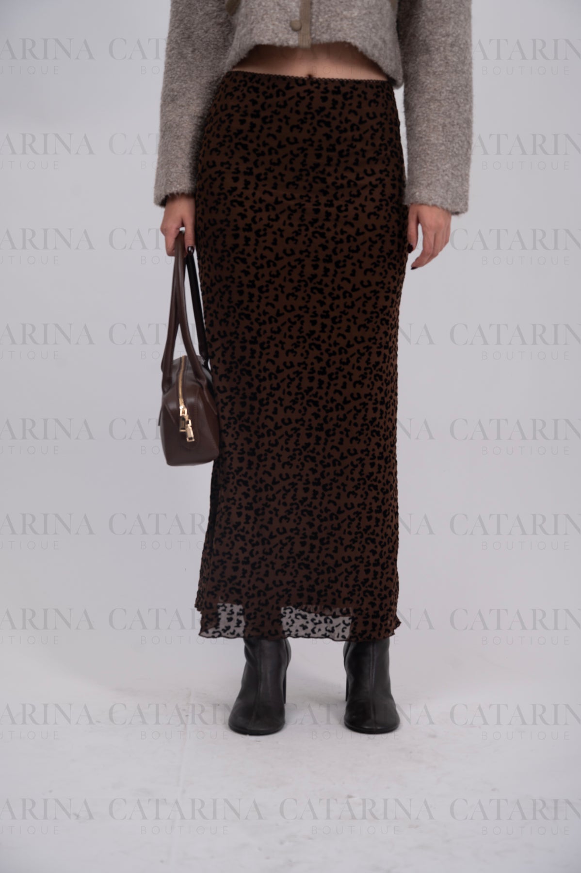 Falda de corte tubo con silueta ajustada. Estampado tipo animal print. Largo midi.