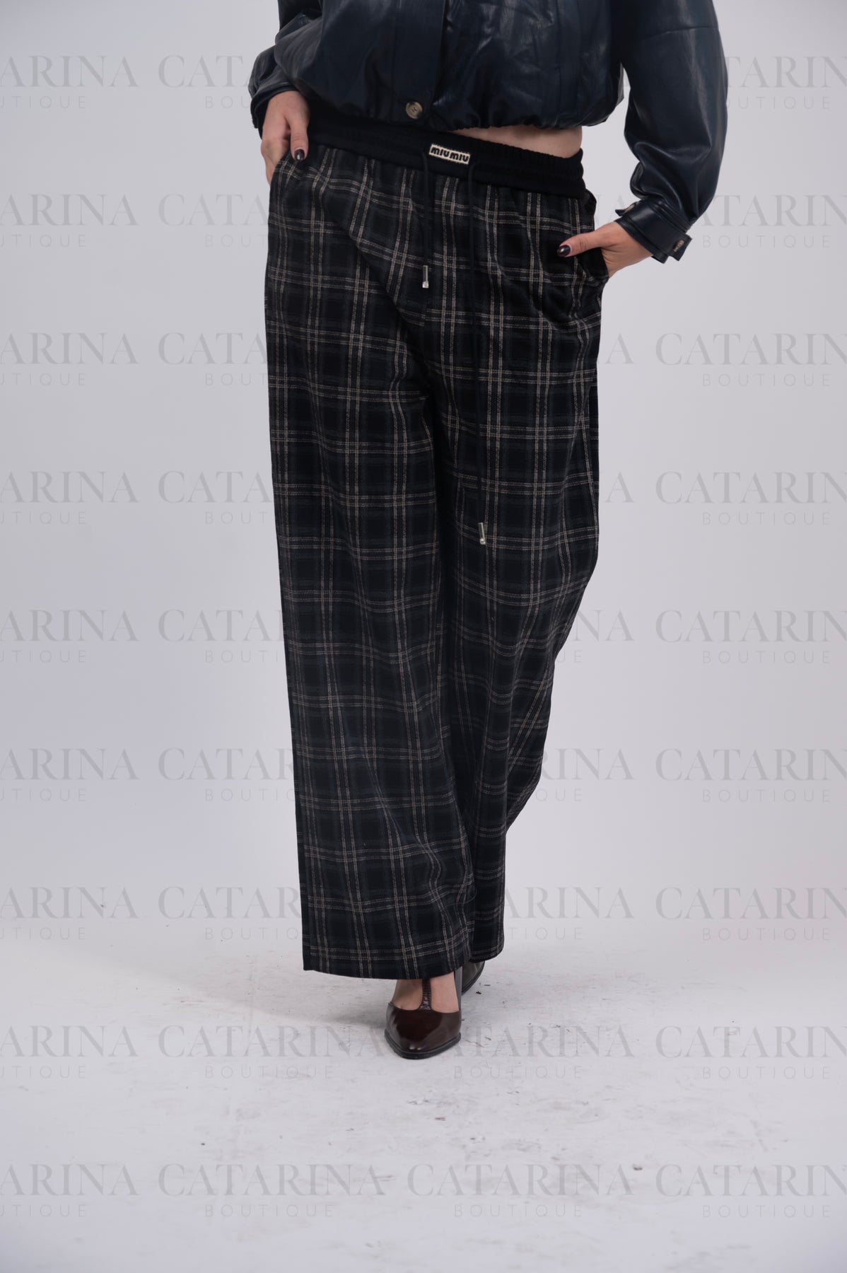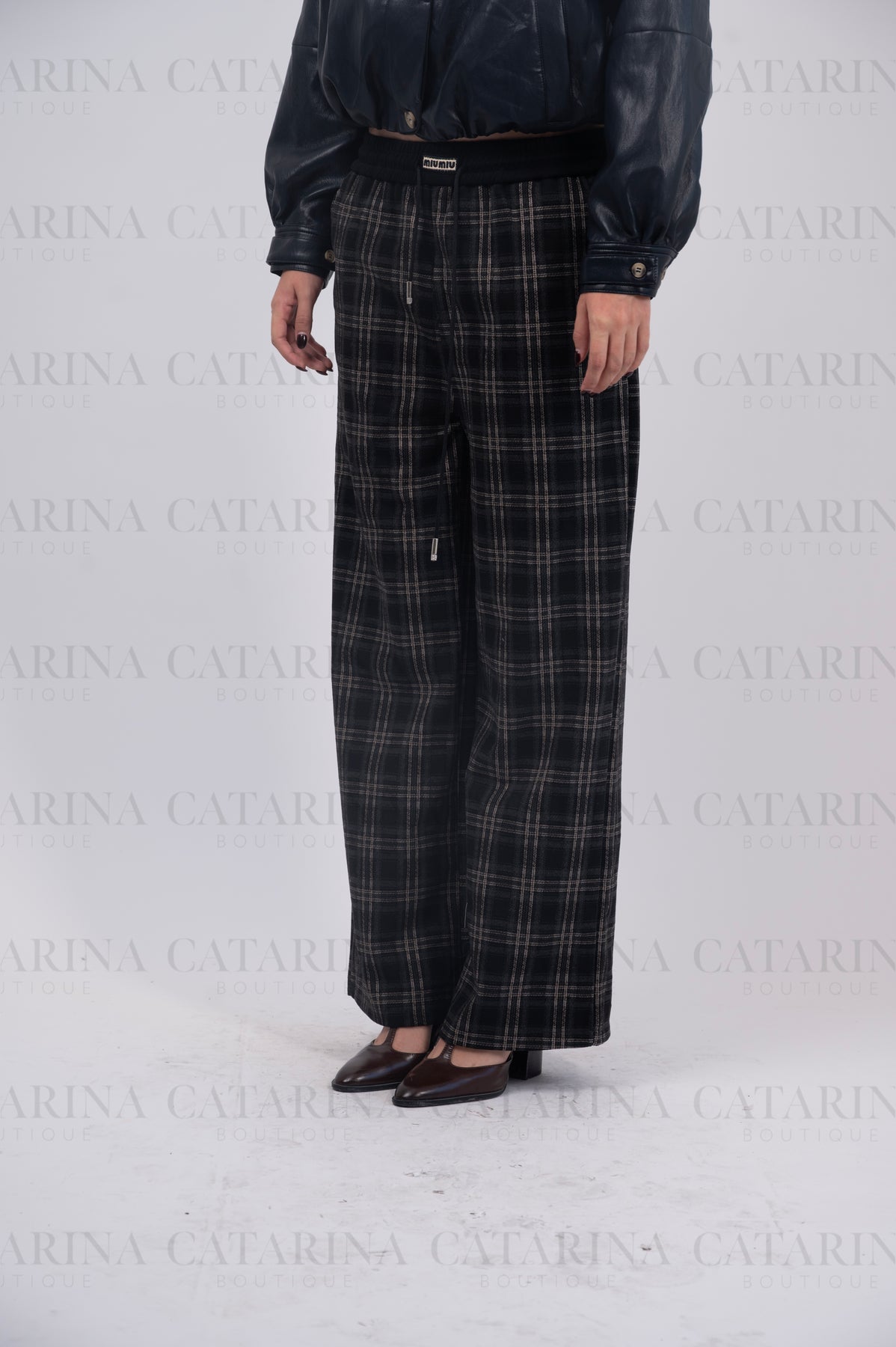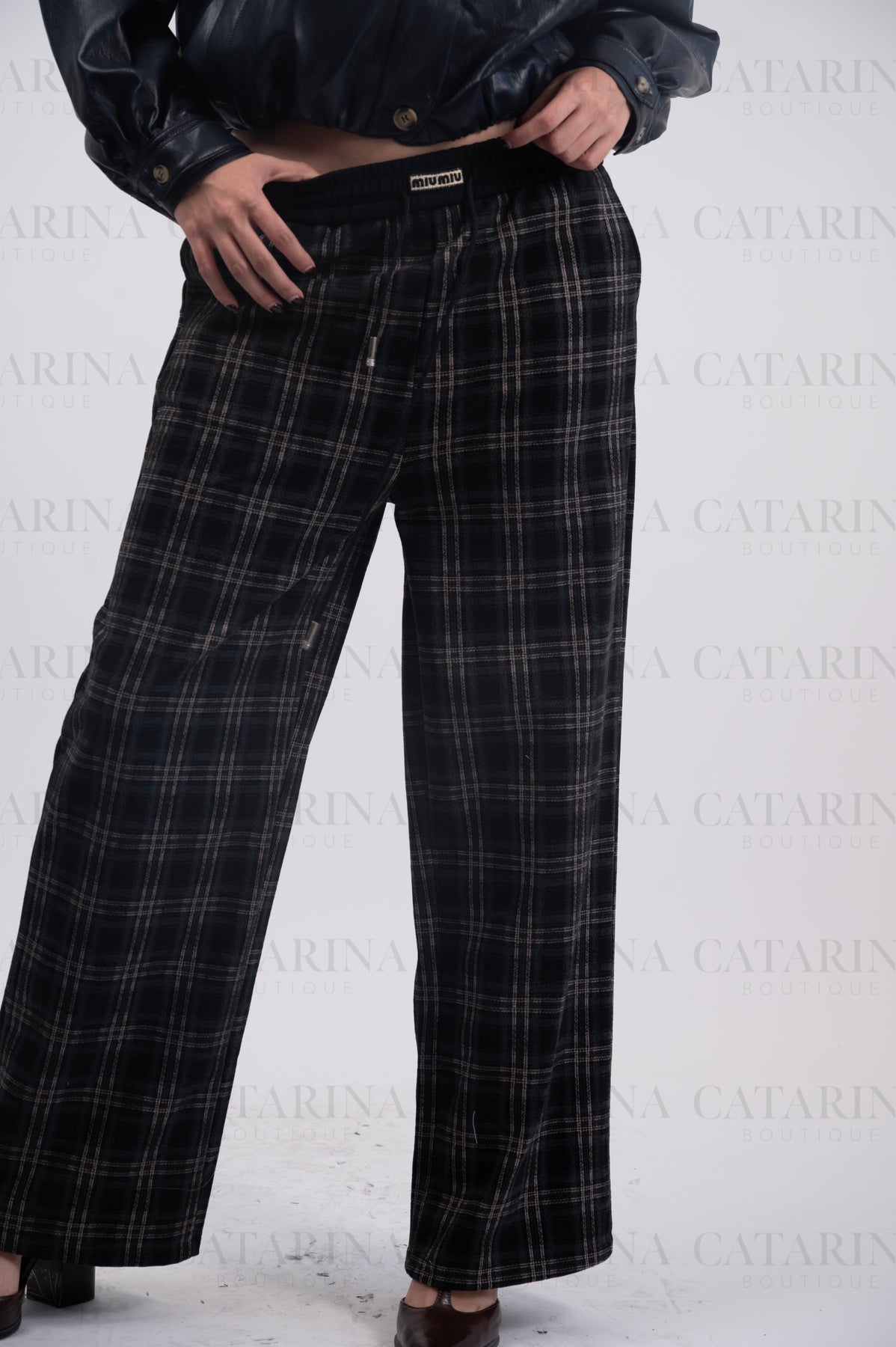 Pantalón con estampado de cuadros. Cintura elástica fruncida y un cordón ajustable en la parte frontal para un ajuste cómodo. Corte suelto y recto.