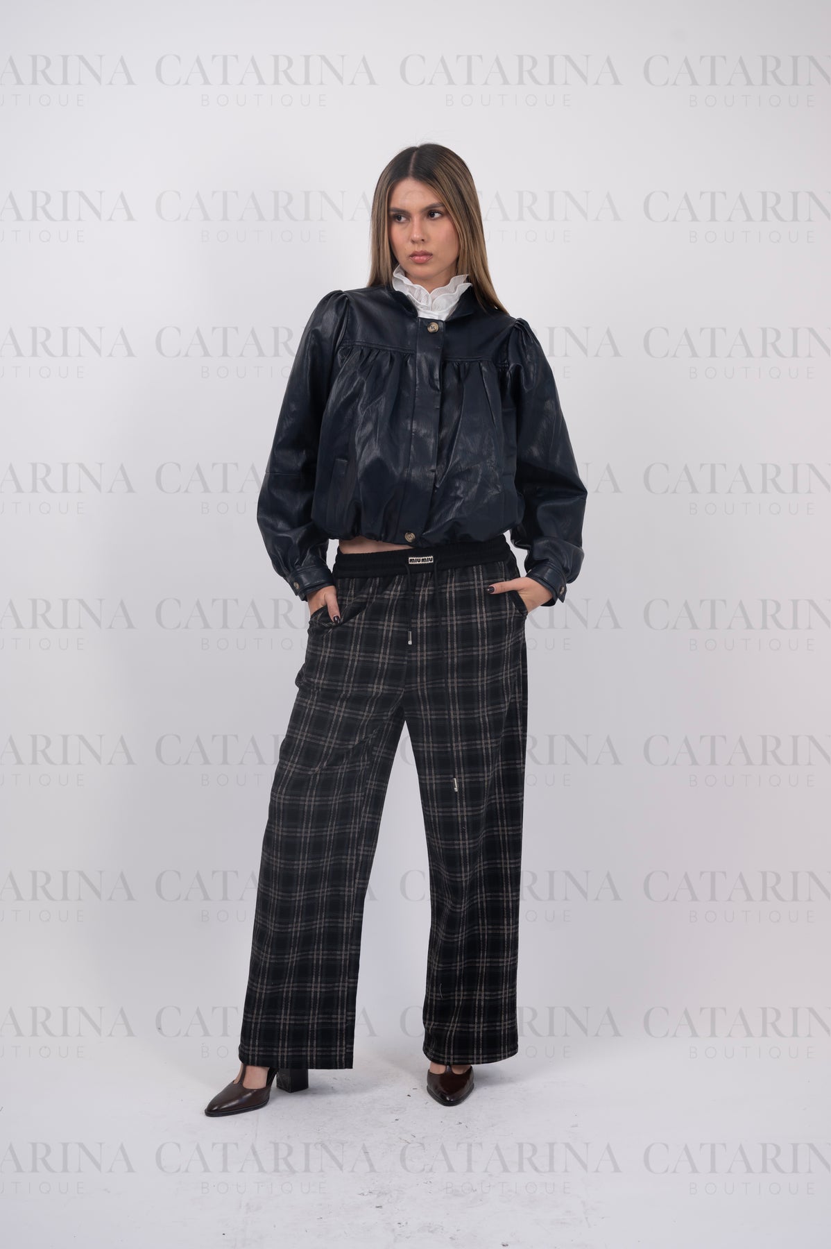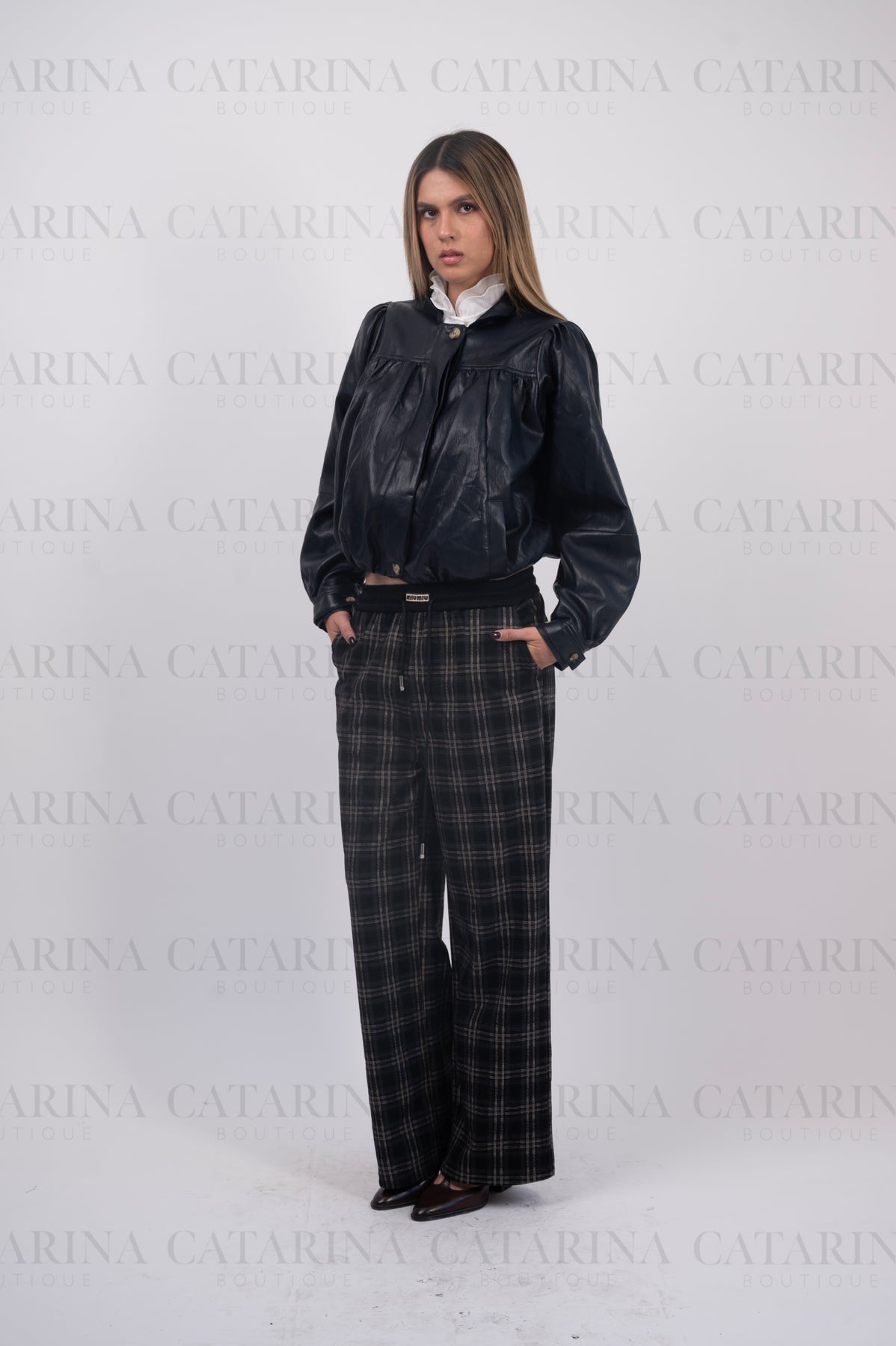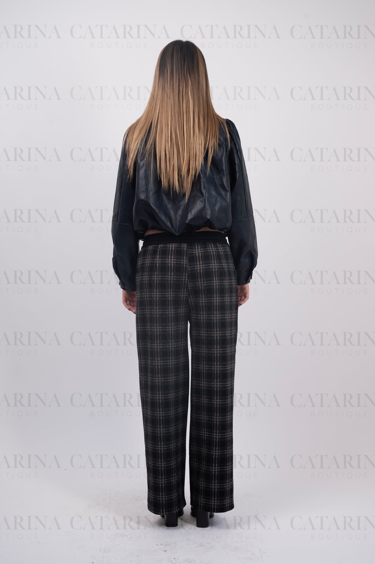 Pantalón con estampado de cuadros. Cintura elástica fruncida y un cordón ajustable en la parte frontal para un ajuste cómodo. Corte suelto y recto.