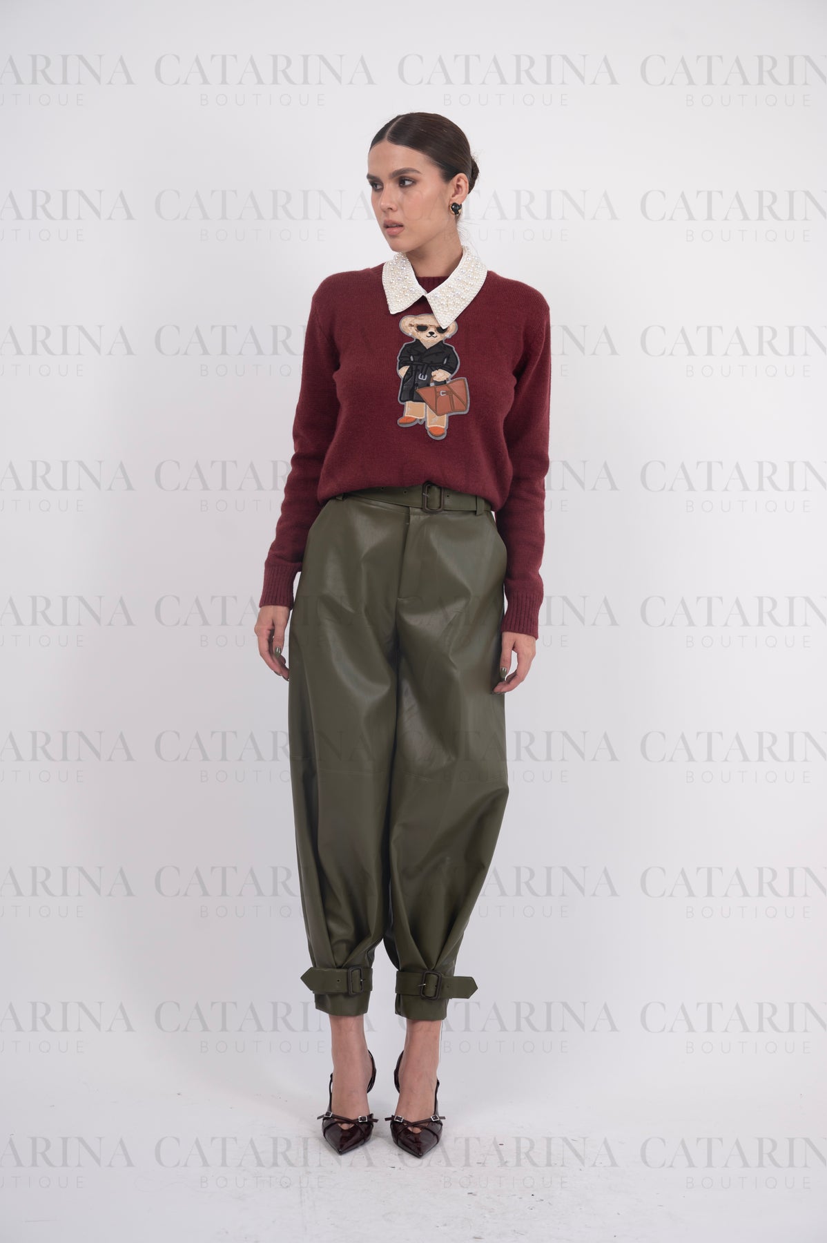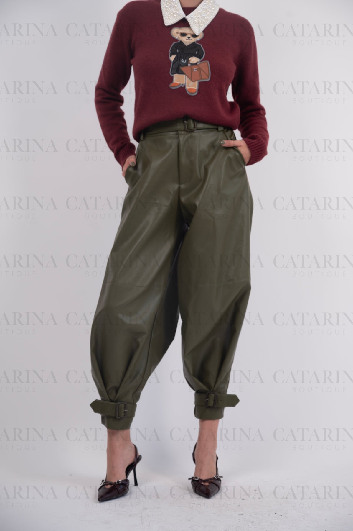 Pantalón de corte suelto y holgado tipo harem. Acabado mate. Presenta una cintura elástica para un ajuste cómodo y un puño en el tobillo, creando un efecto abombado.