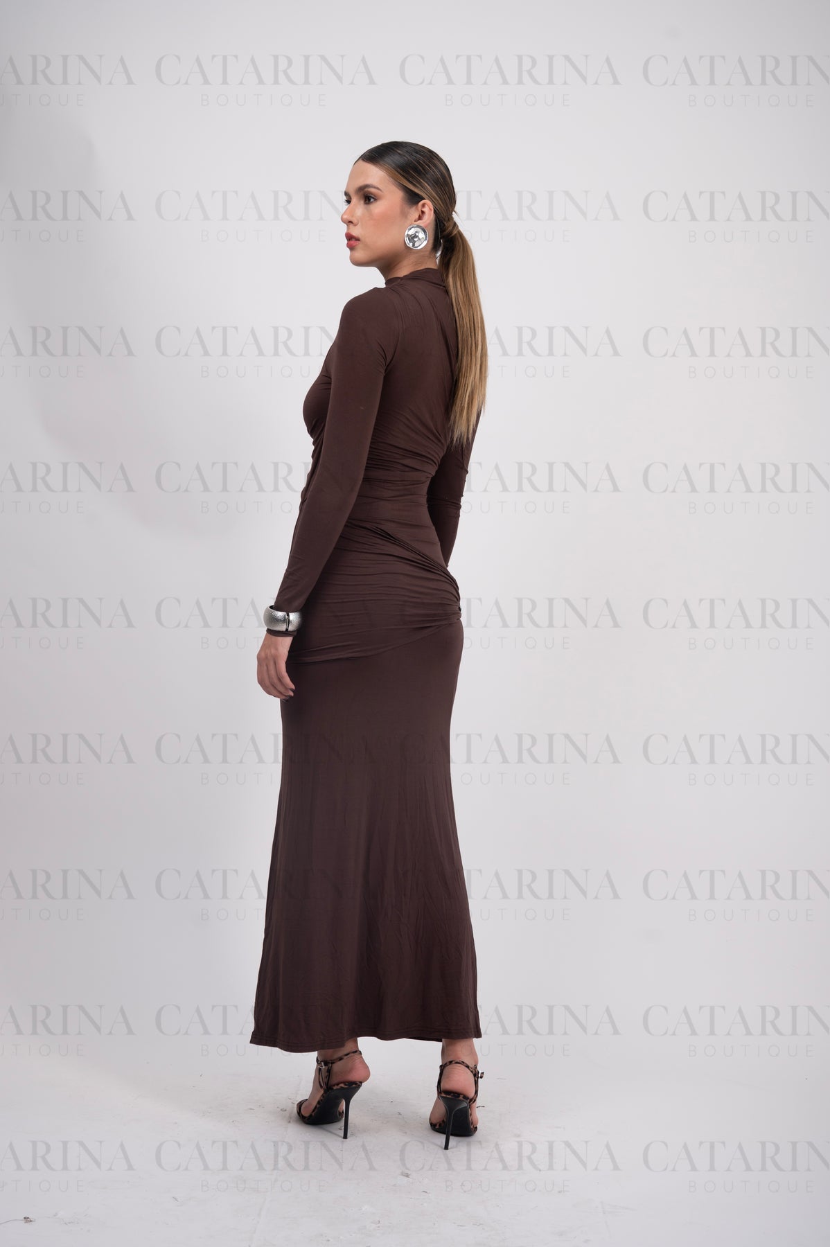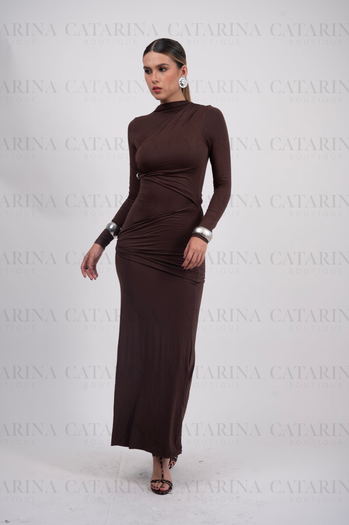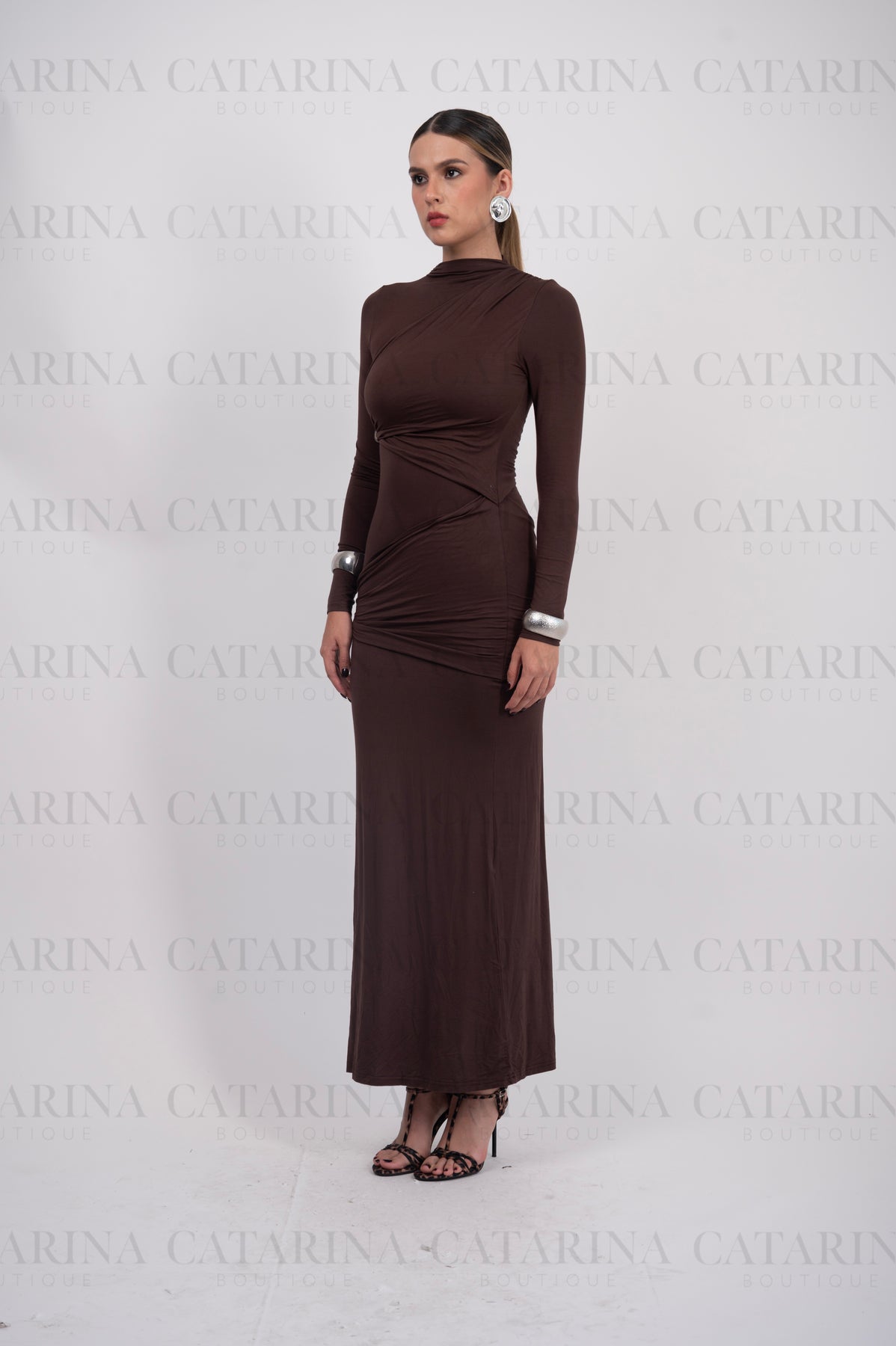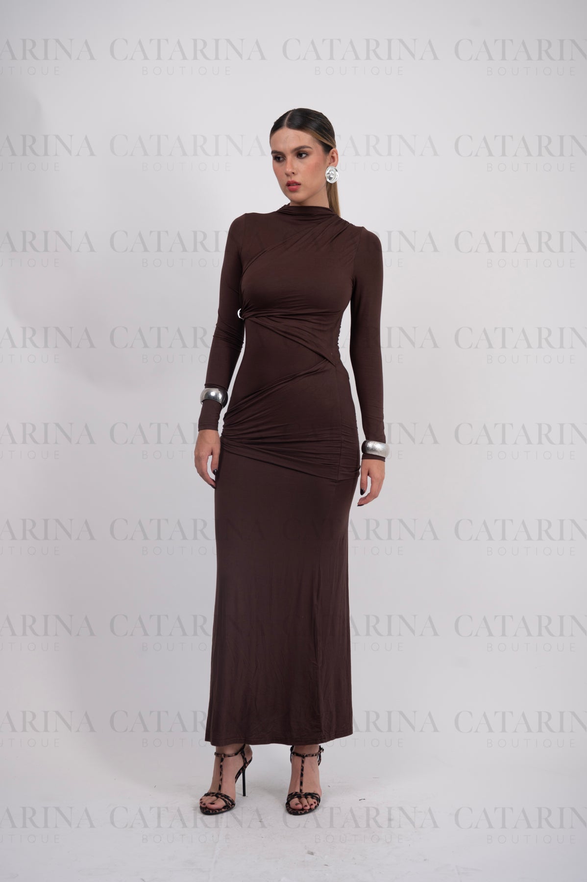 Vestido de color marrón chocolate, de corte ajustado y silueta lápiz. Cuello alto. Manga larga ajustada. Diseño con drapeado frontal y recogido lateral que cruza la cintura. Ideal para estilizar la figura.