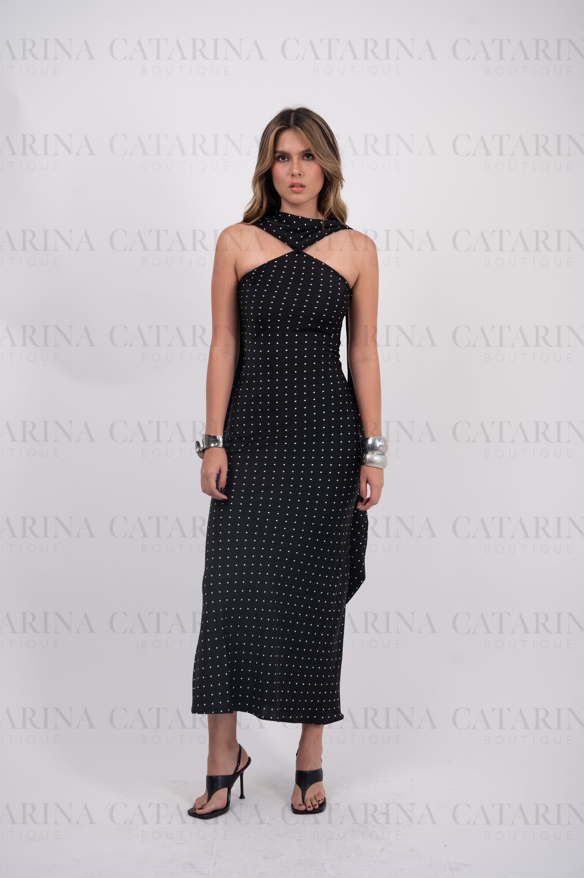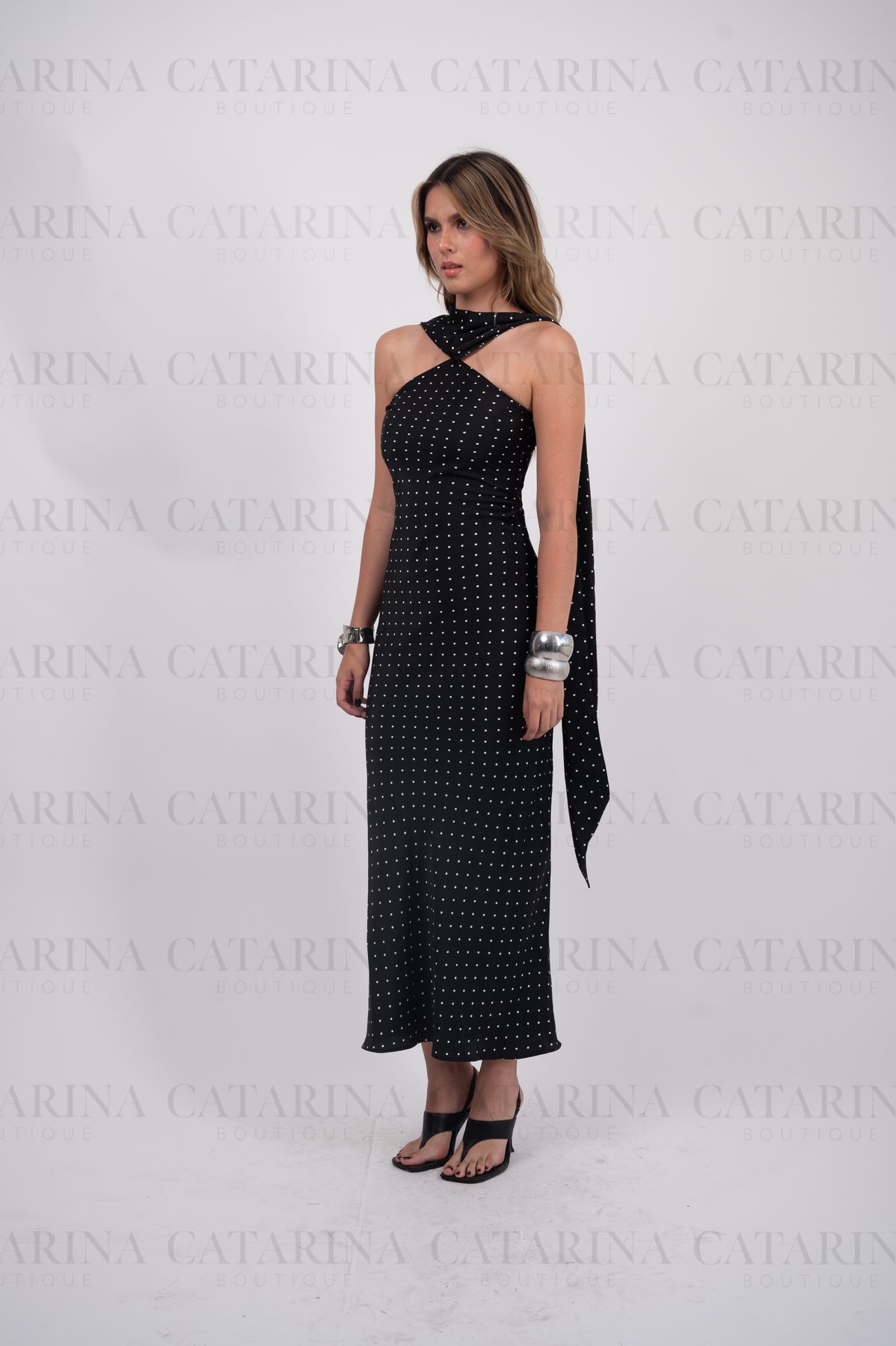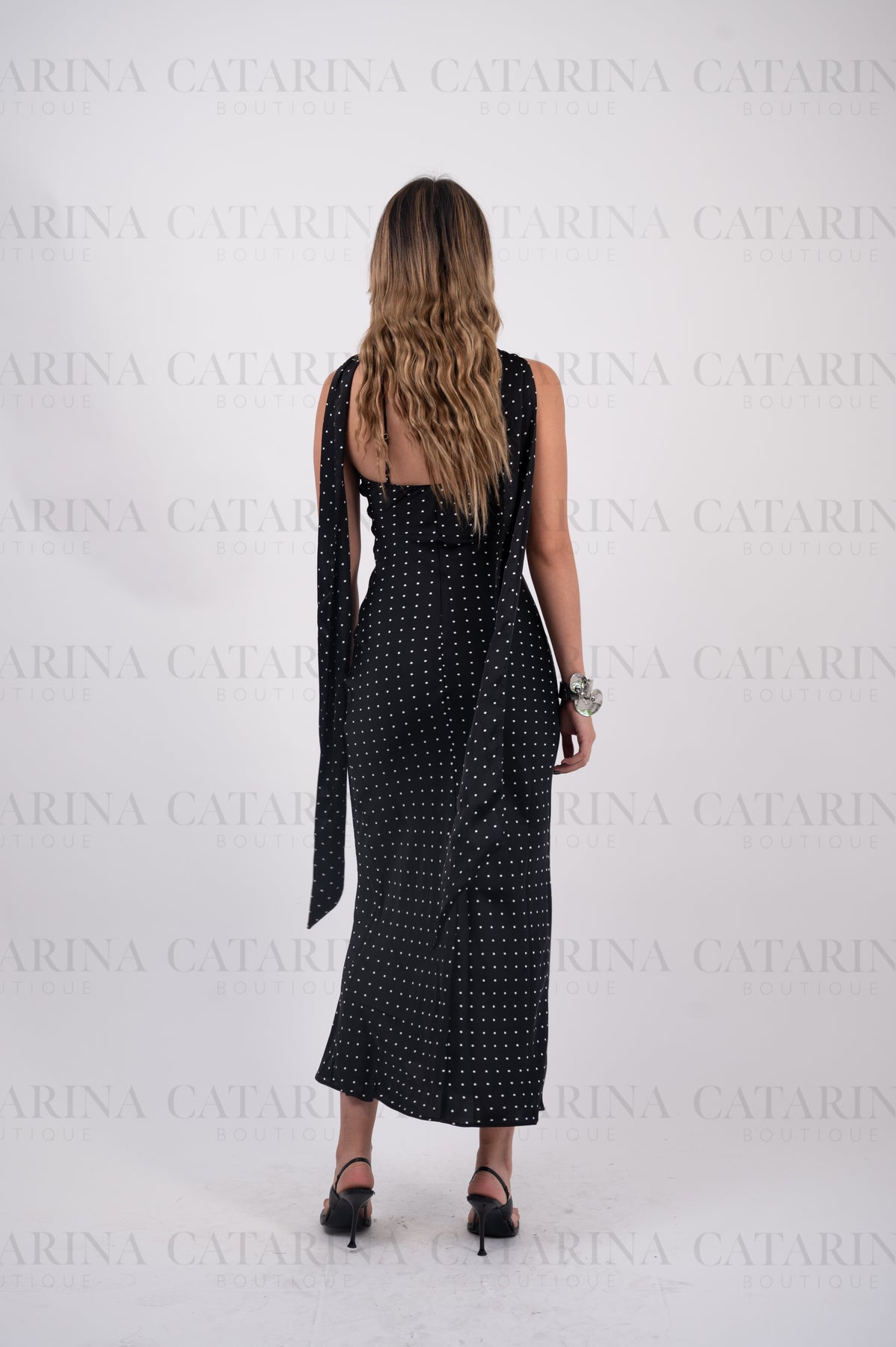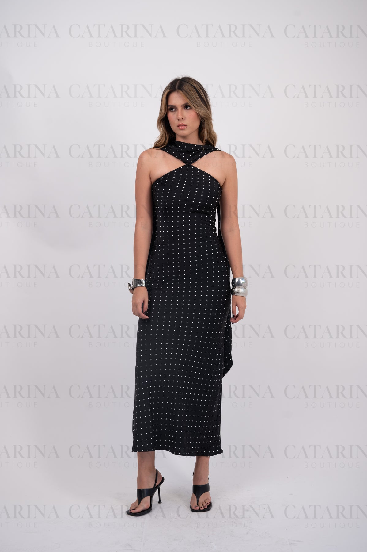 Vestido con estampado de puntos. Tirantes delgados. Lazada en cuello. Bajo acabado recto. Cierre oculto.