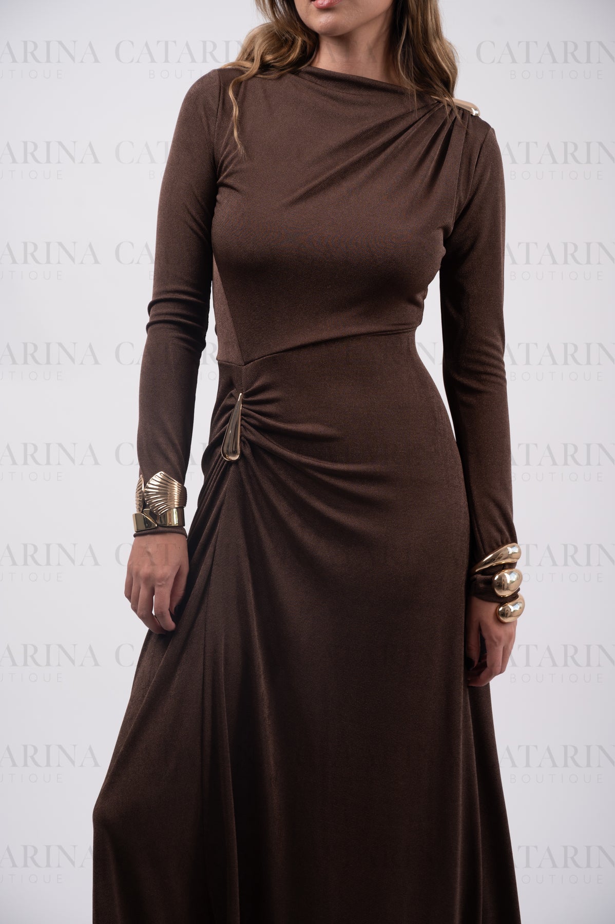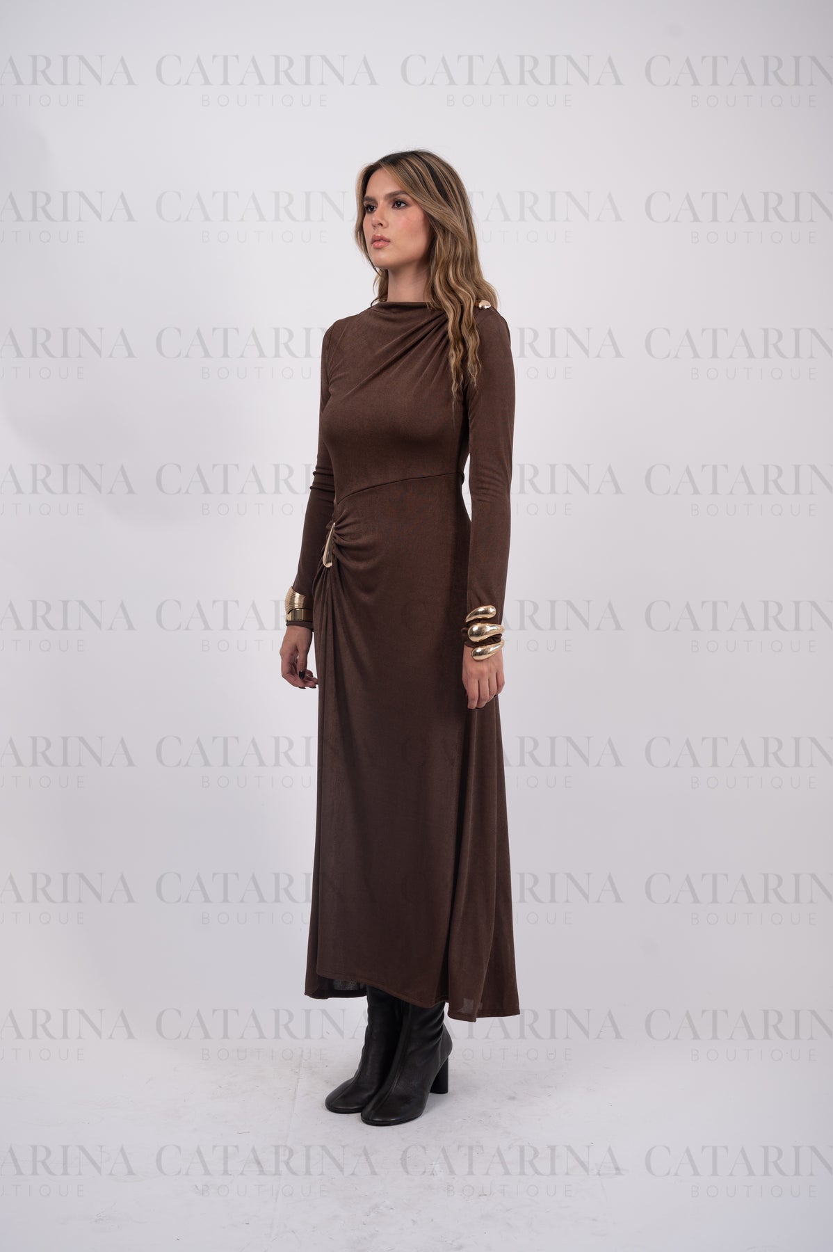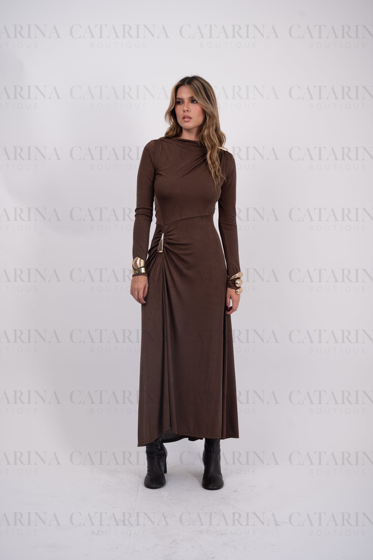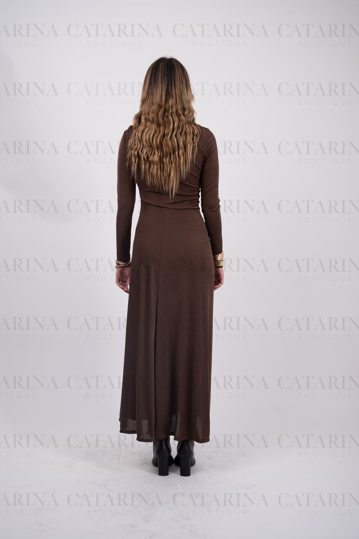 Vestido de color liso. Escote redondo. Manga larga. Bajo acabado en volante. Detalle de plises.