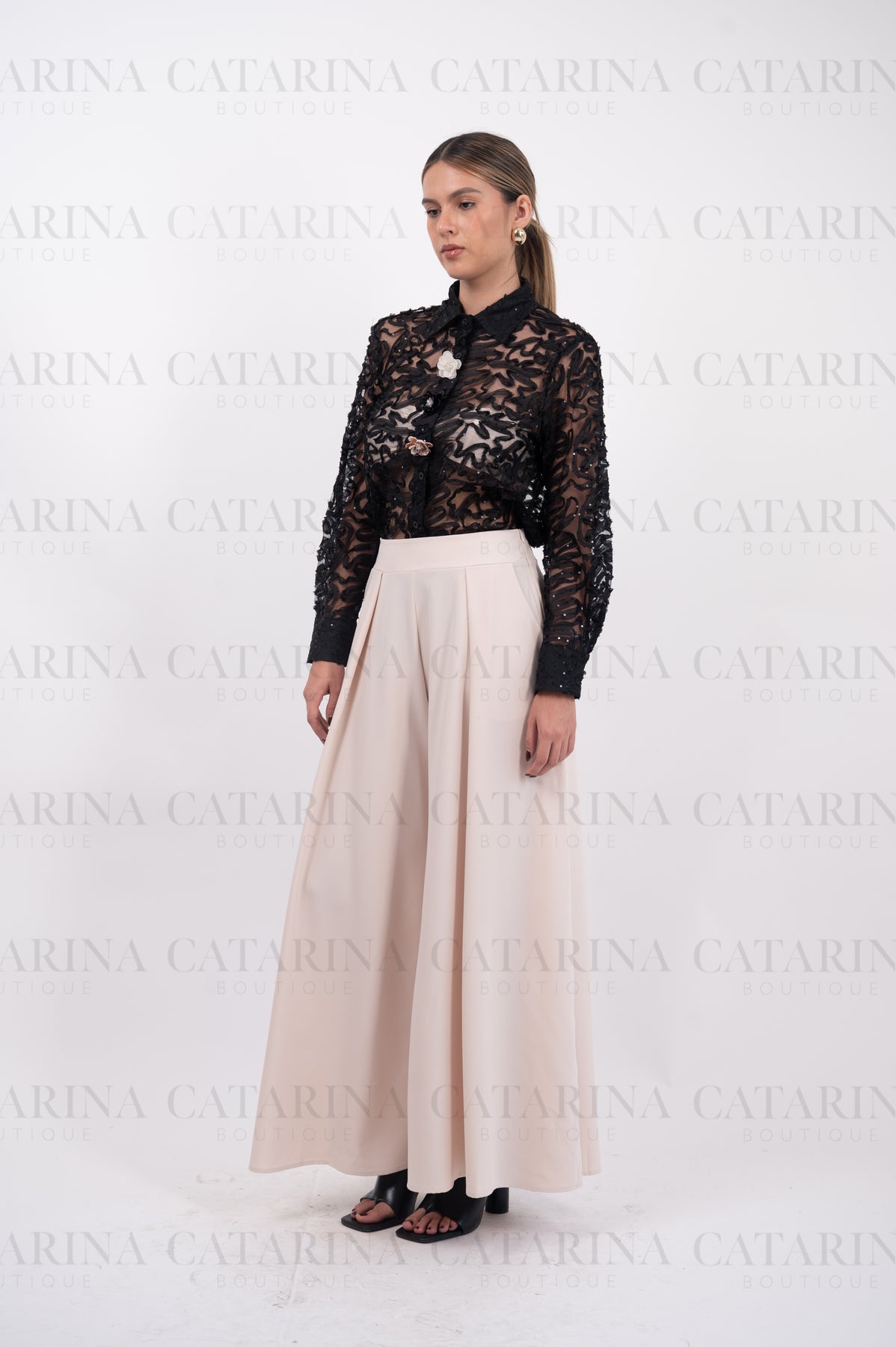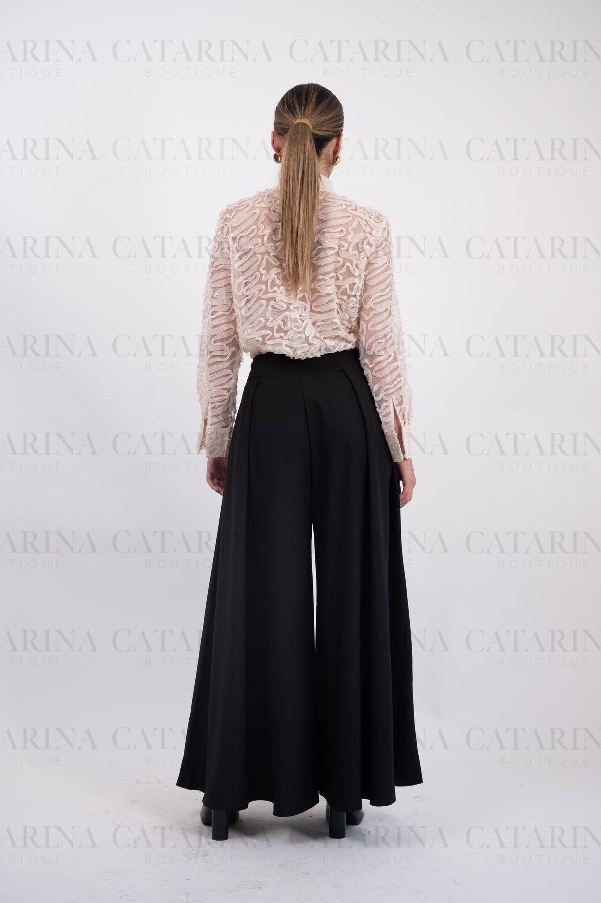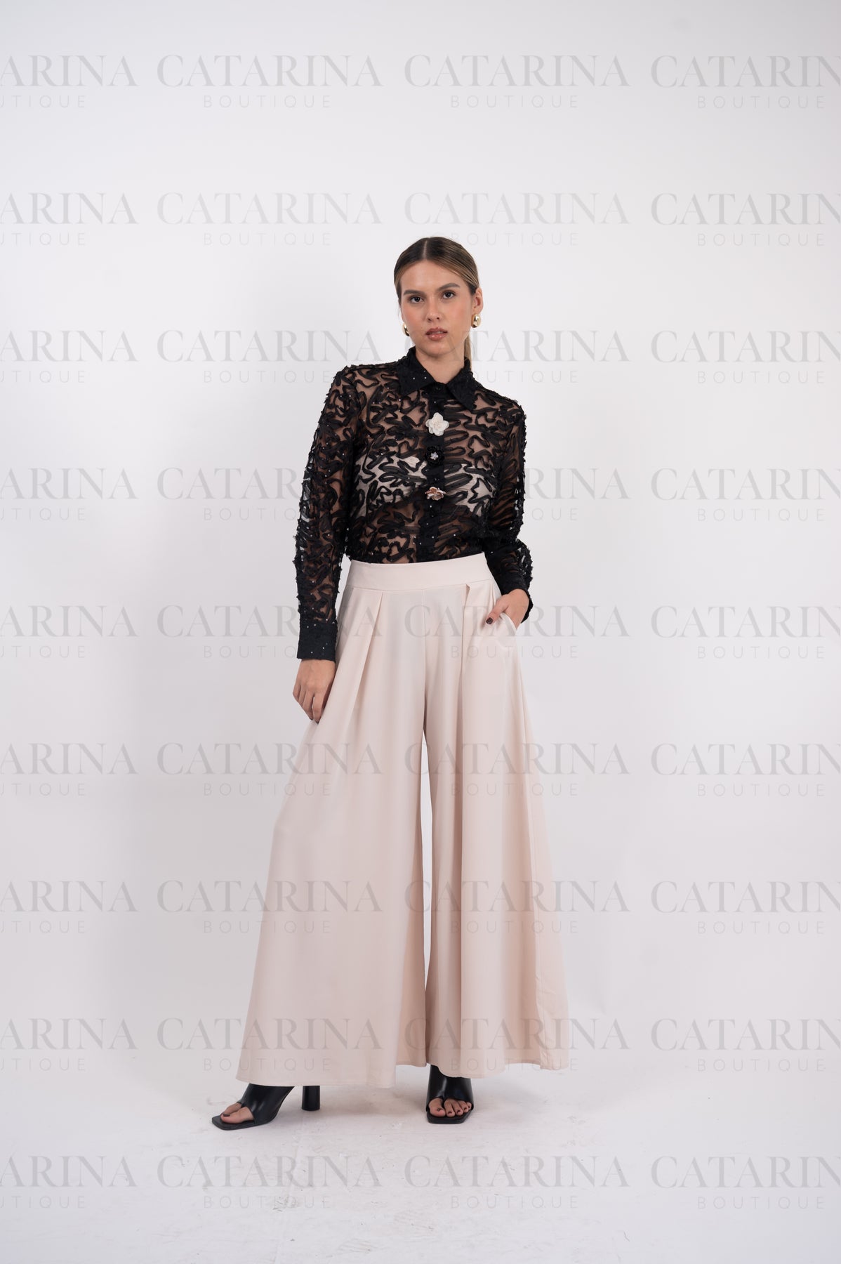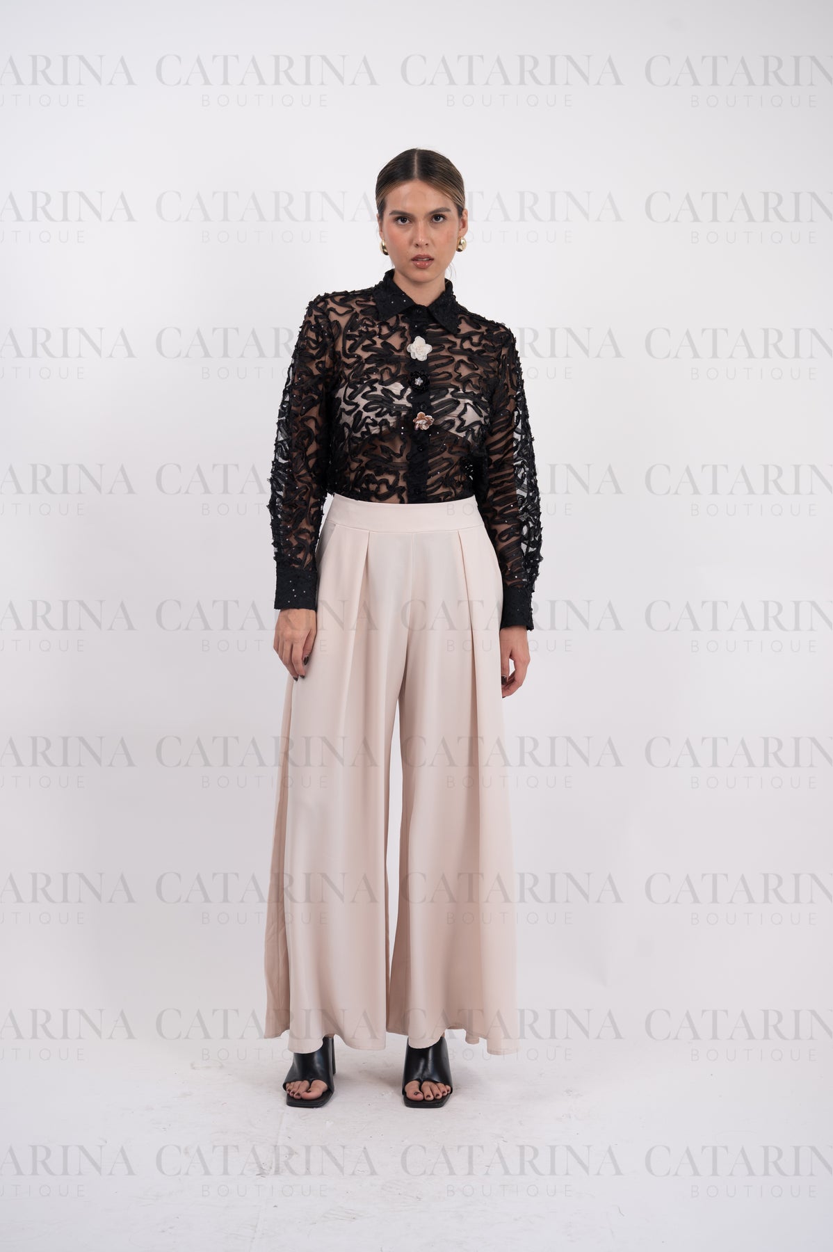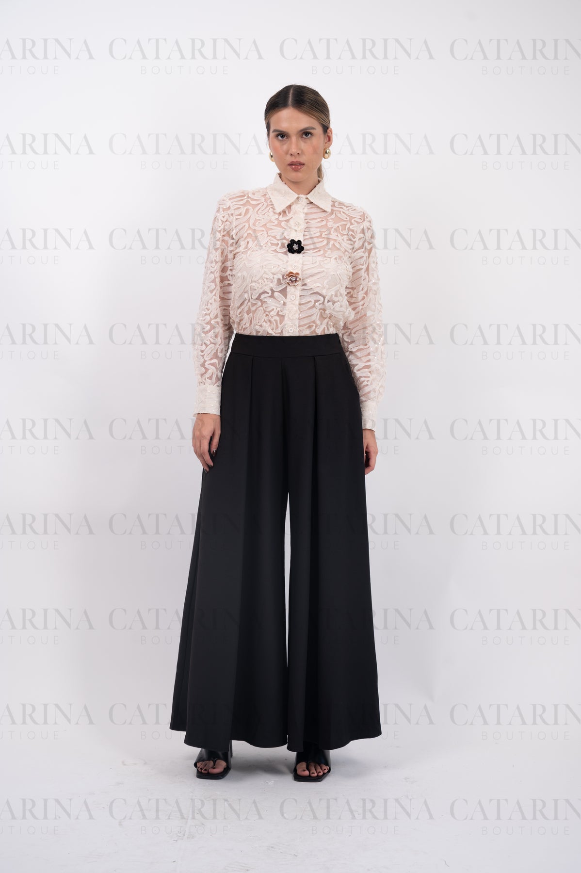 Pantalón liso de tiro alto. Botón y cierre al frente. Bajo acabado en volante.