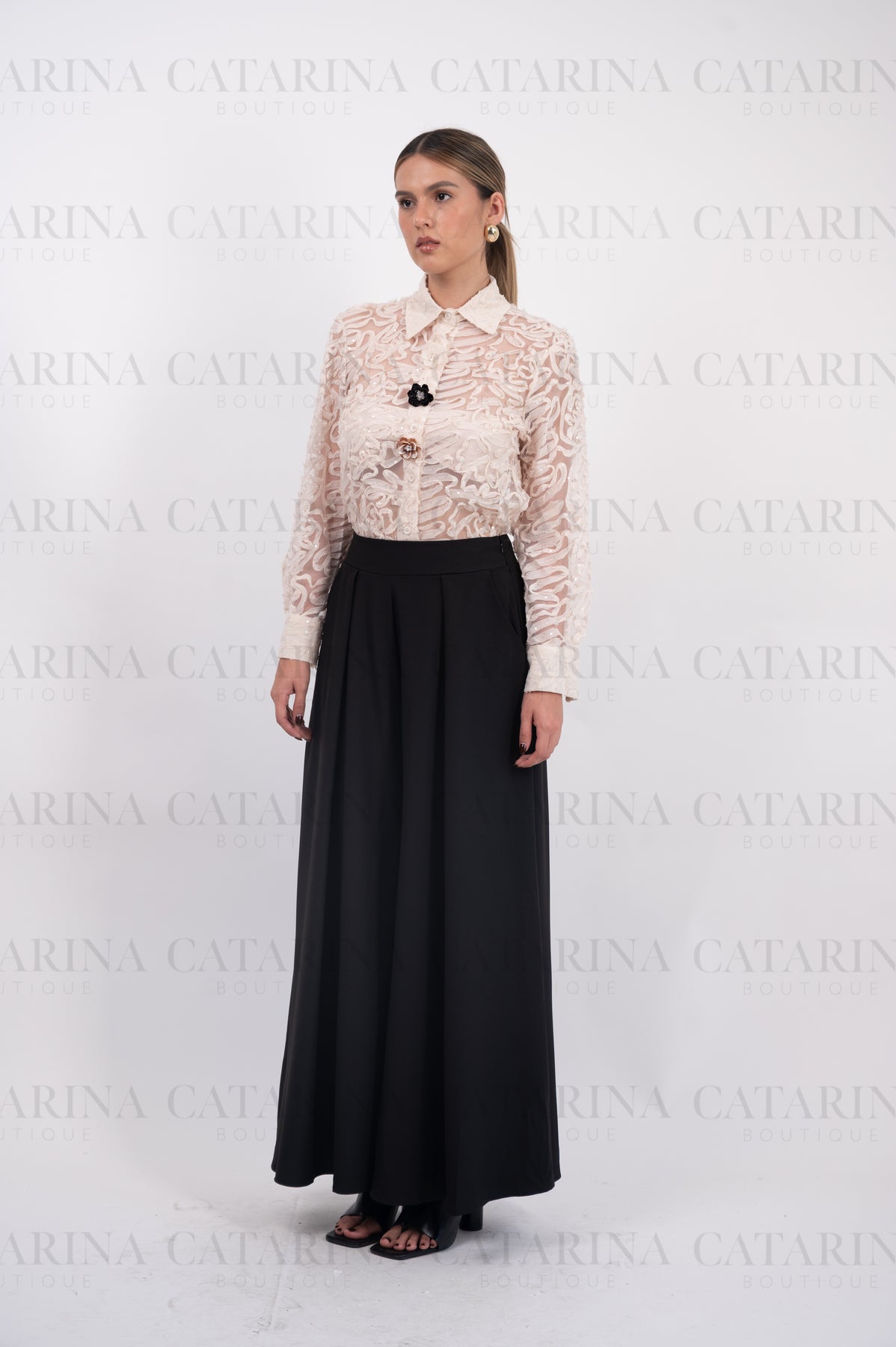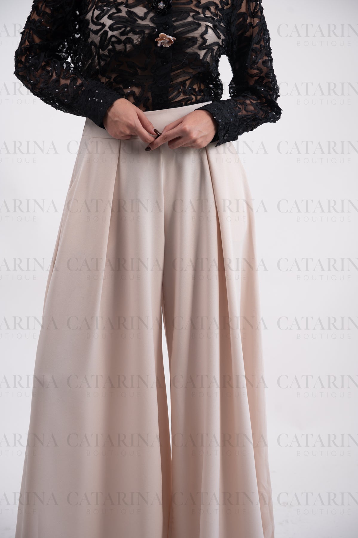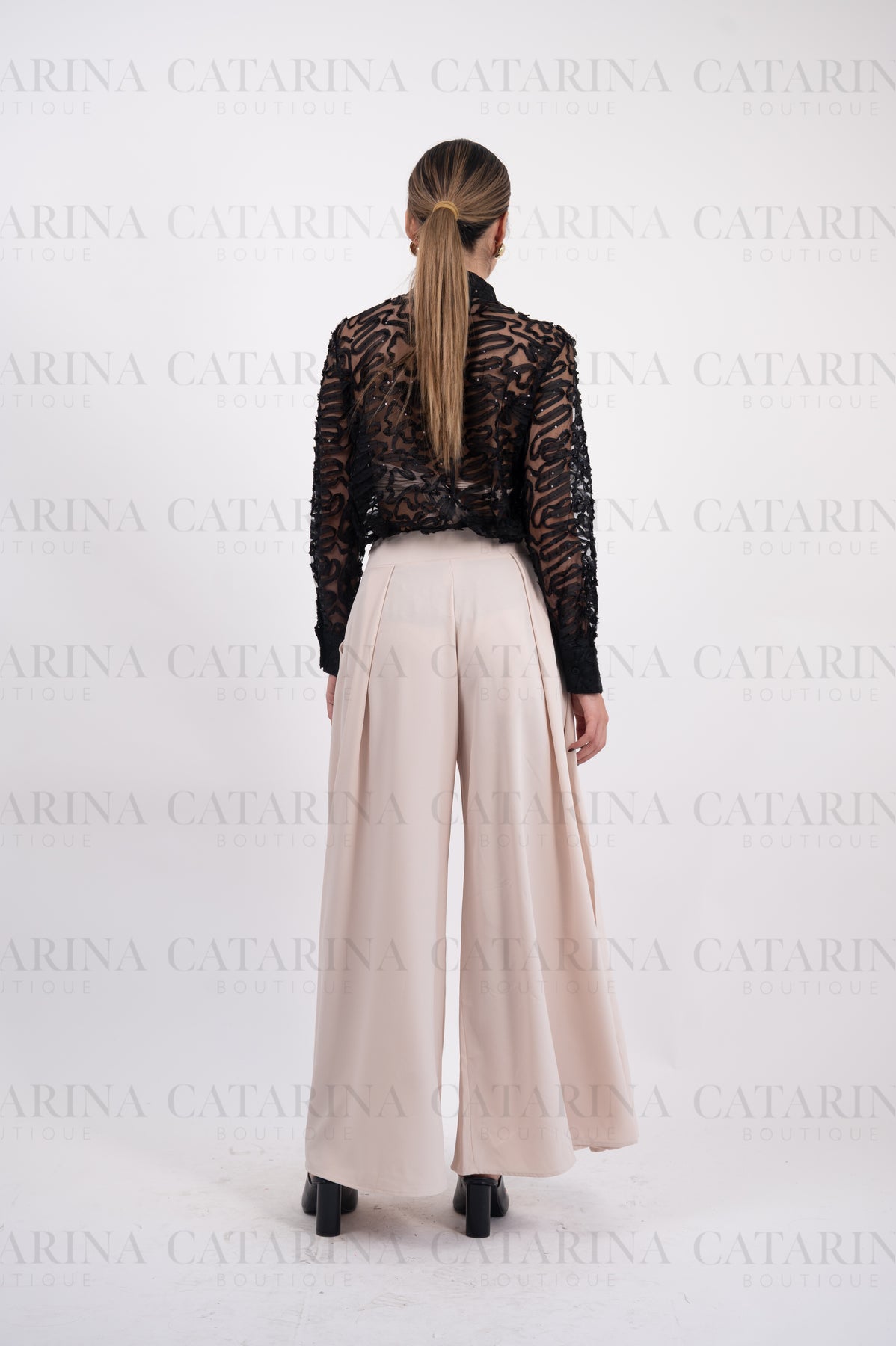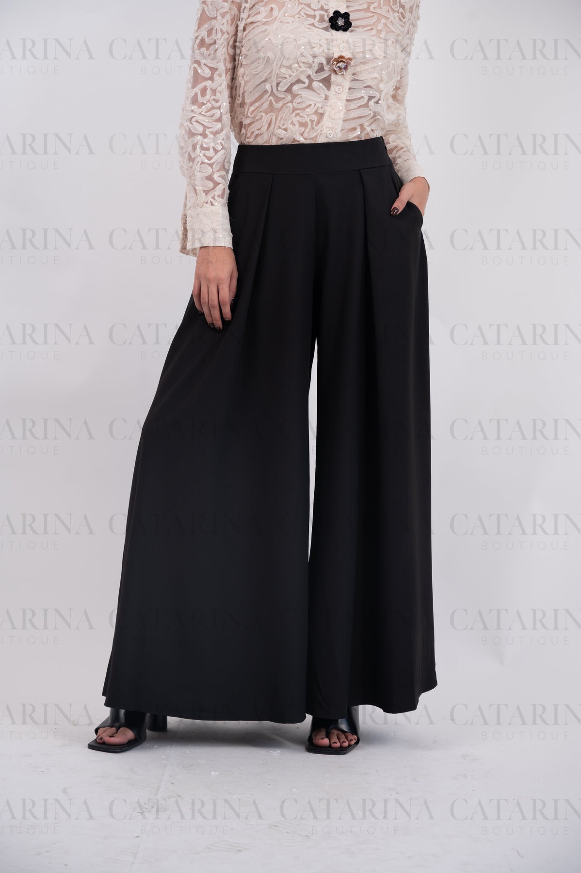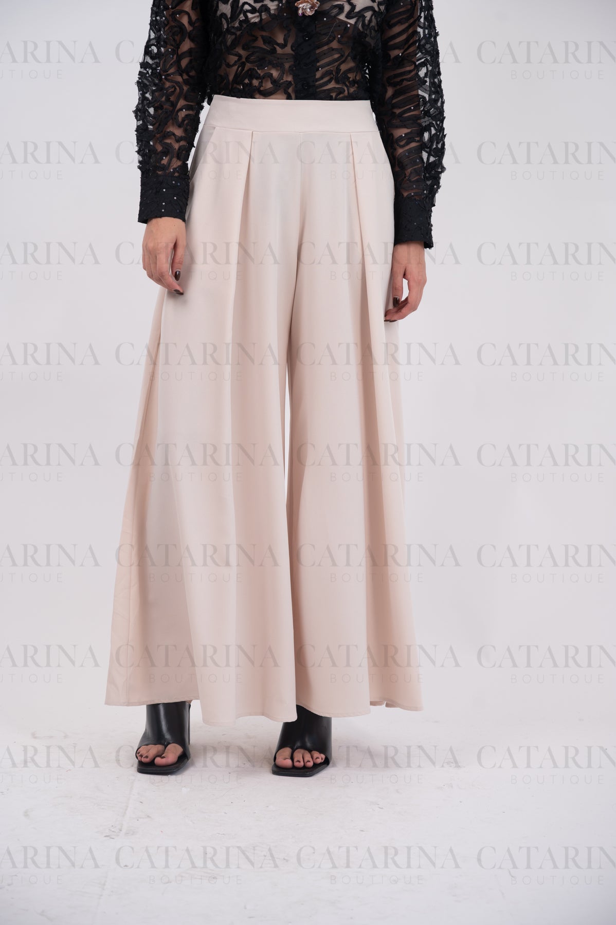 Pantalón liso de tiro alto. Botón y cierre al frente. Bajo acabado en volante.