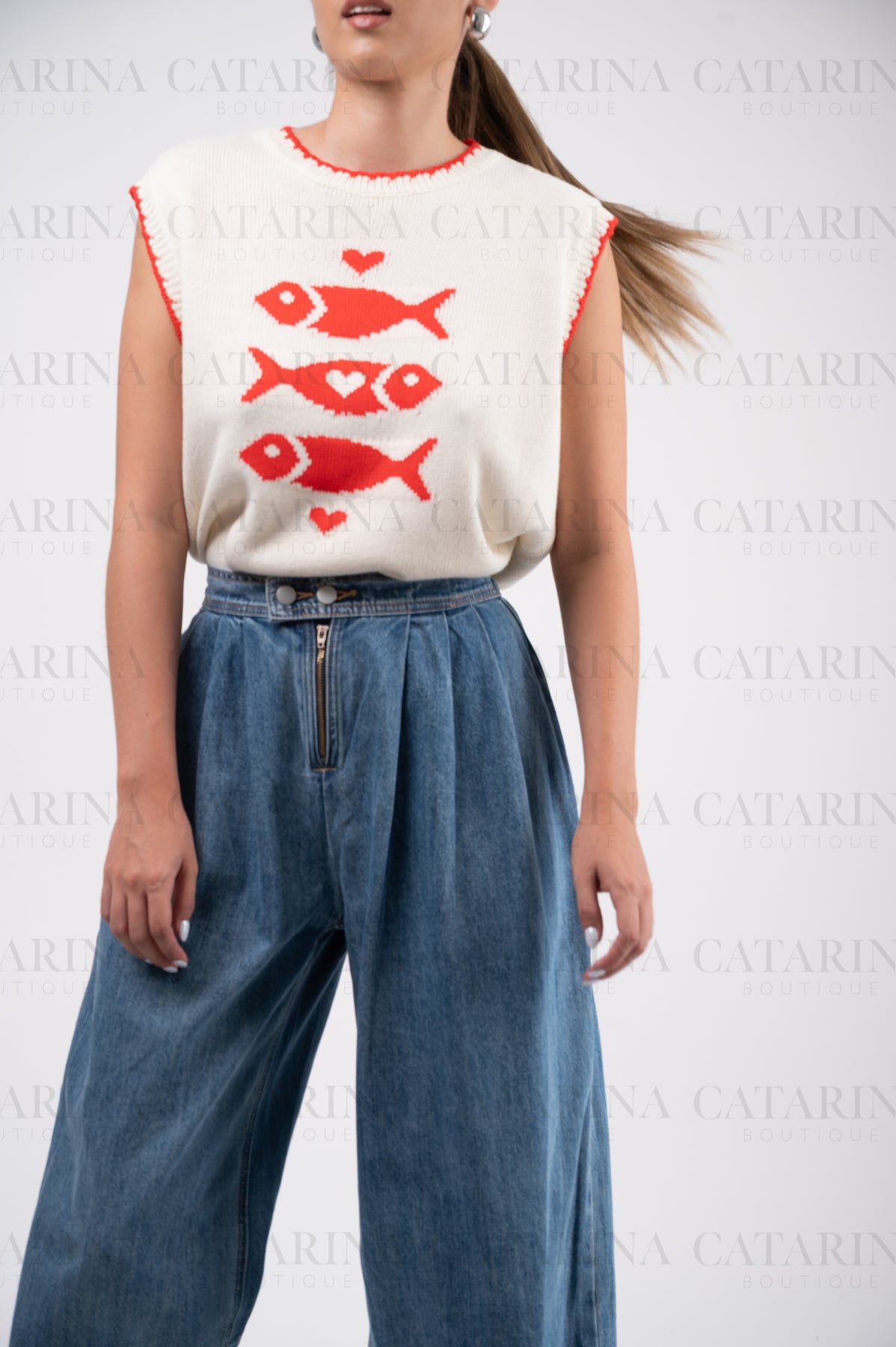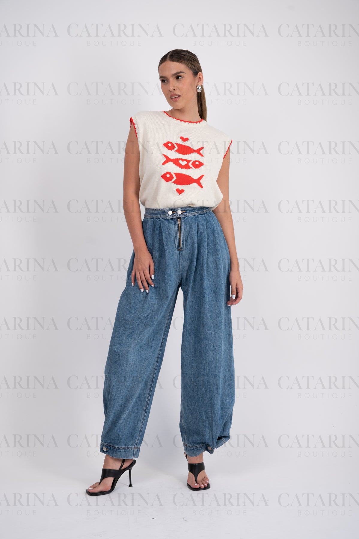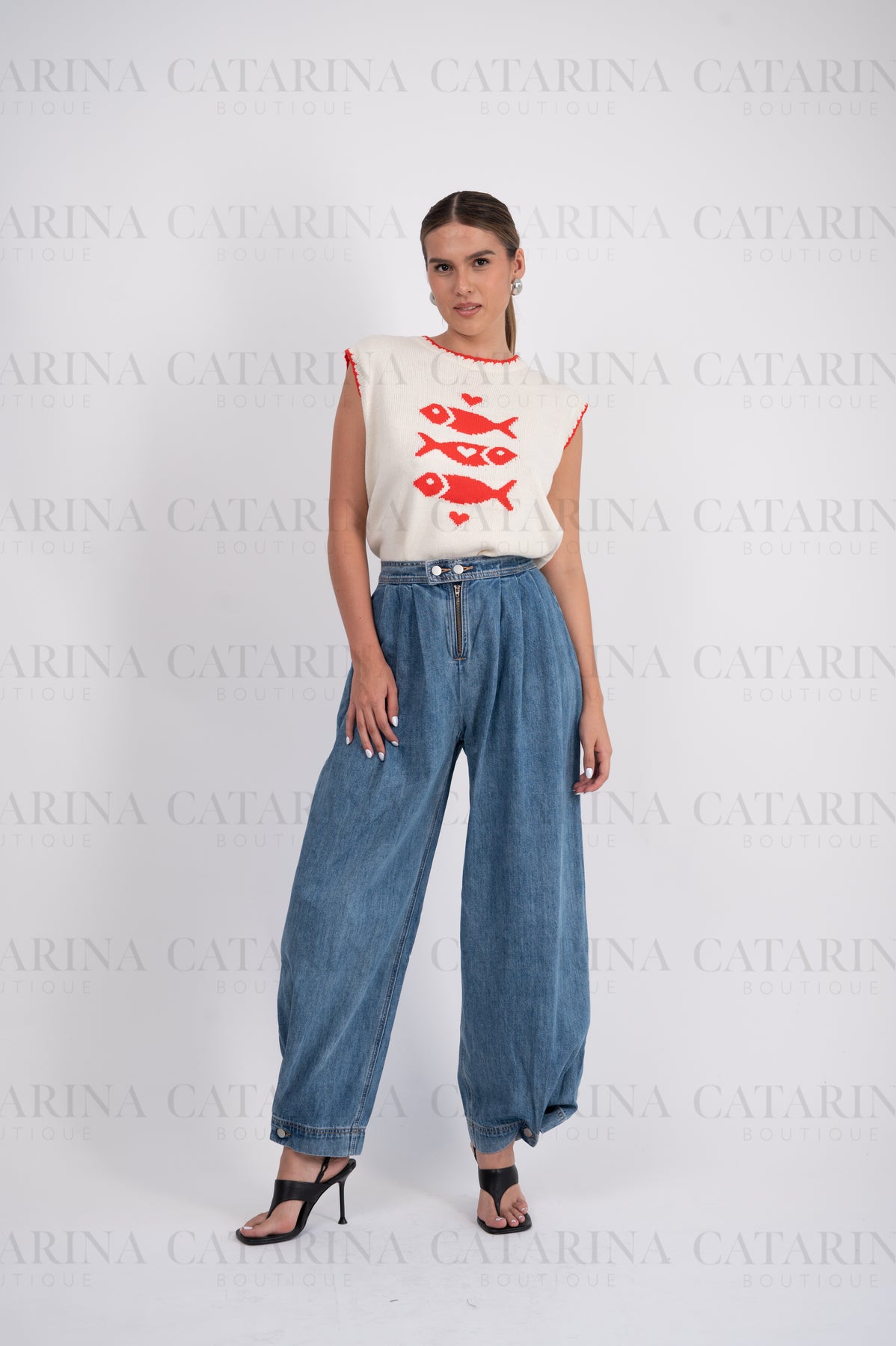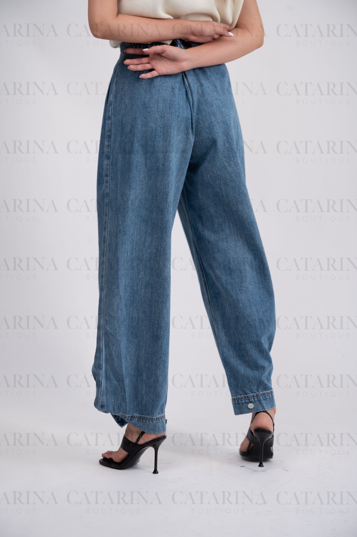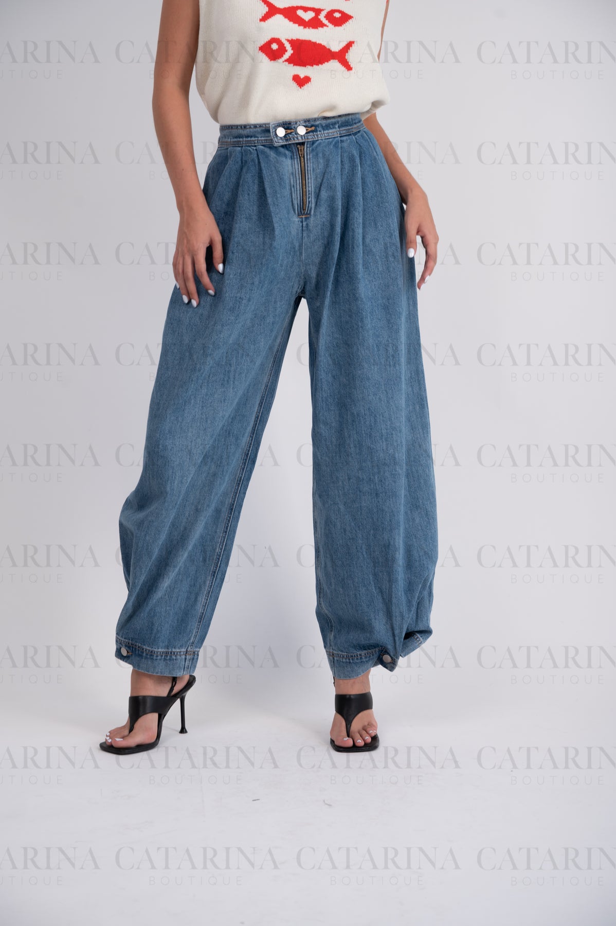 Pantalón de tiro alto. Botones y cierre delantero con cremallera. Bajo acabado recto. Elástico en cintura.