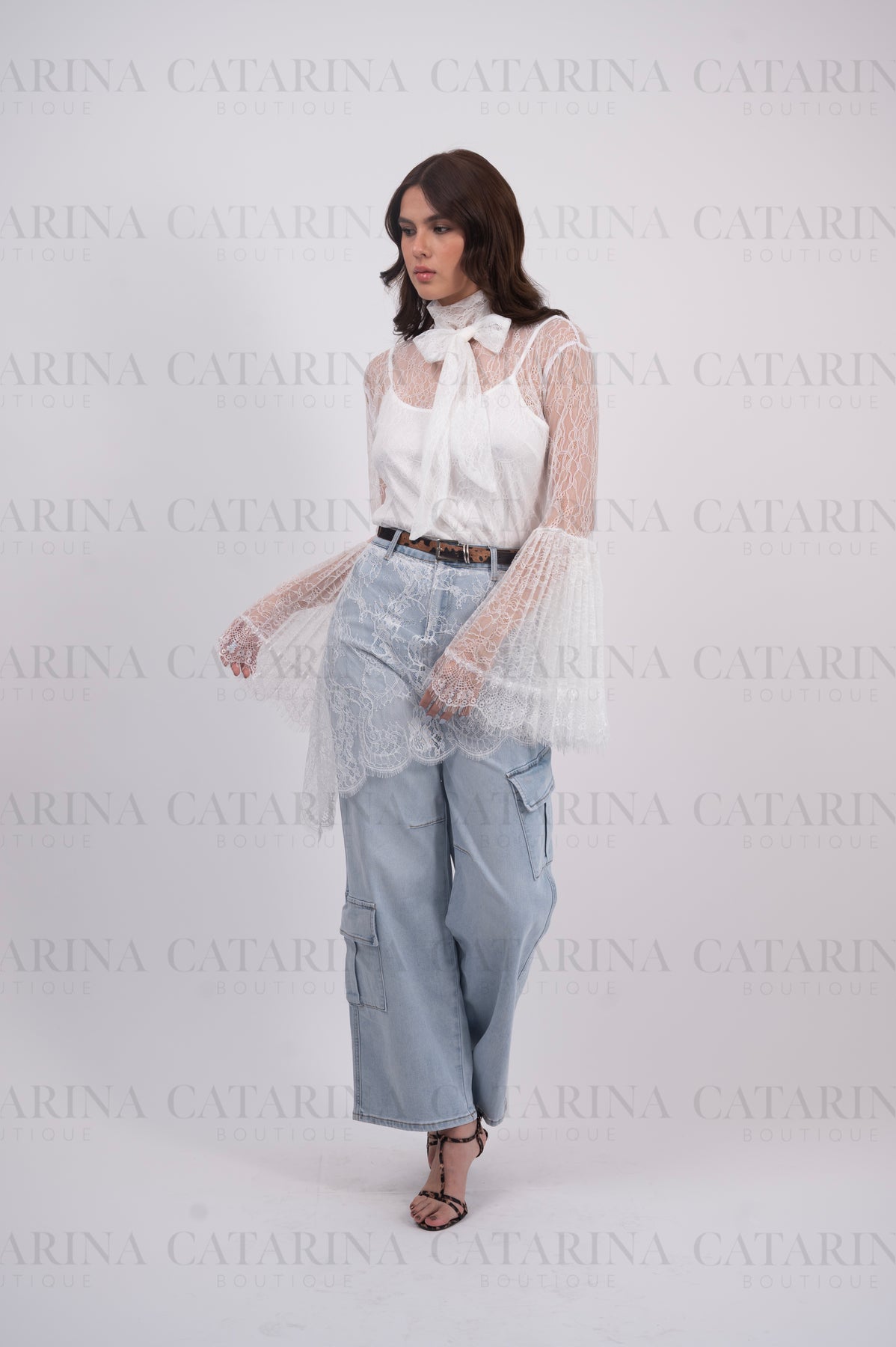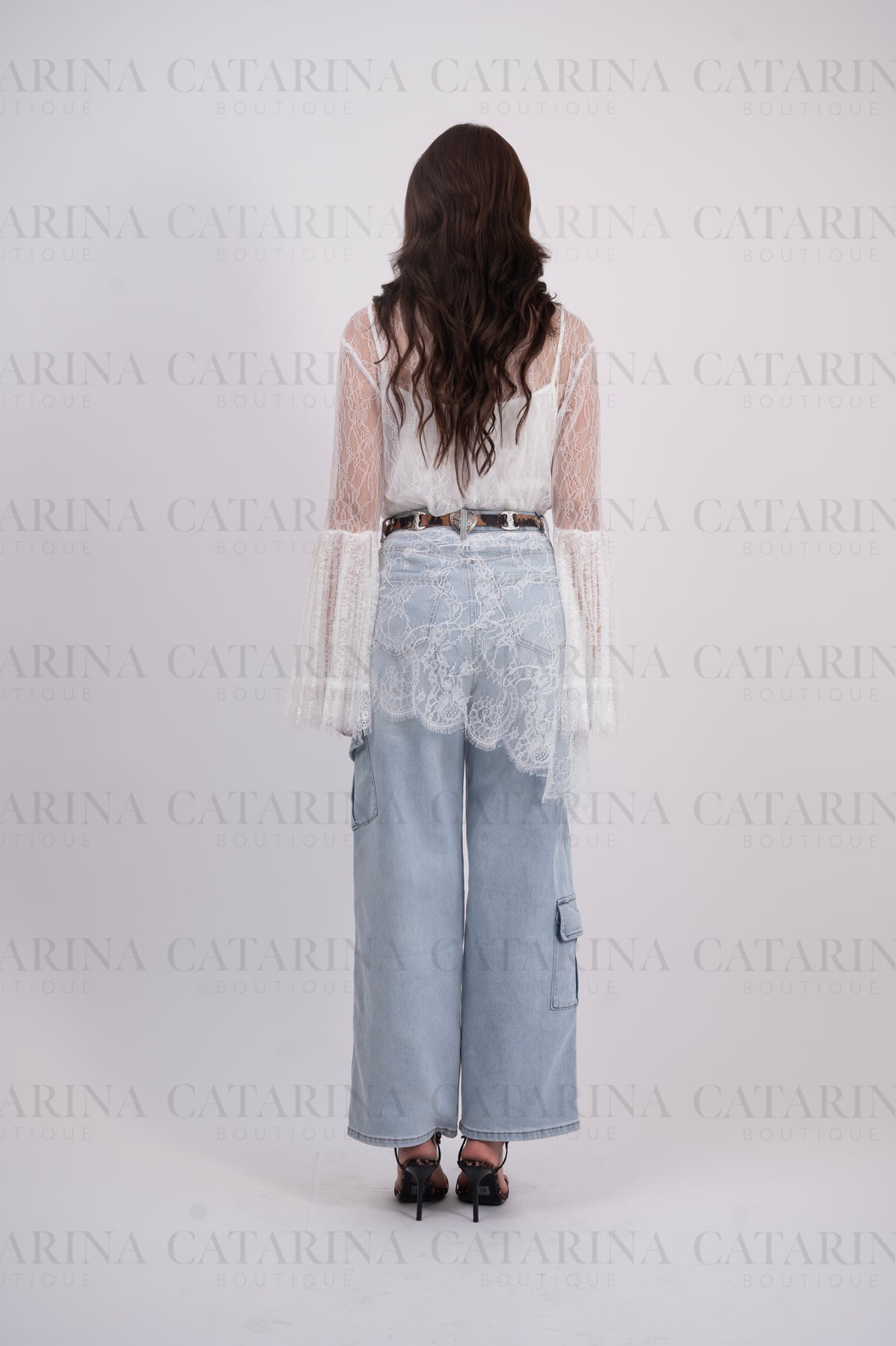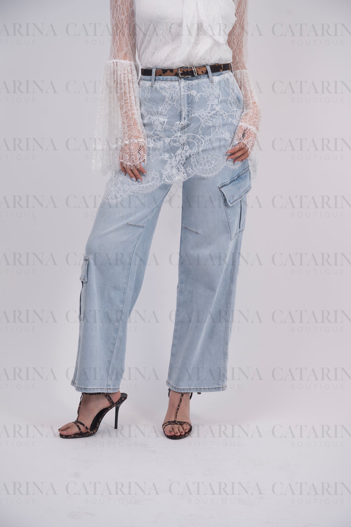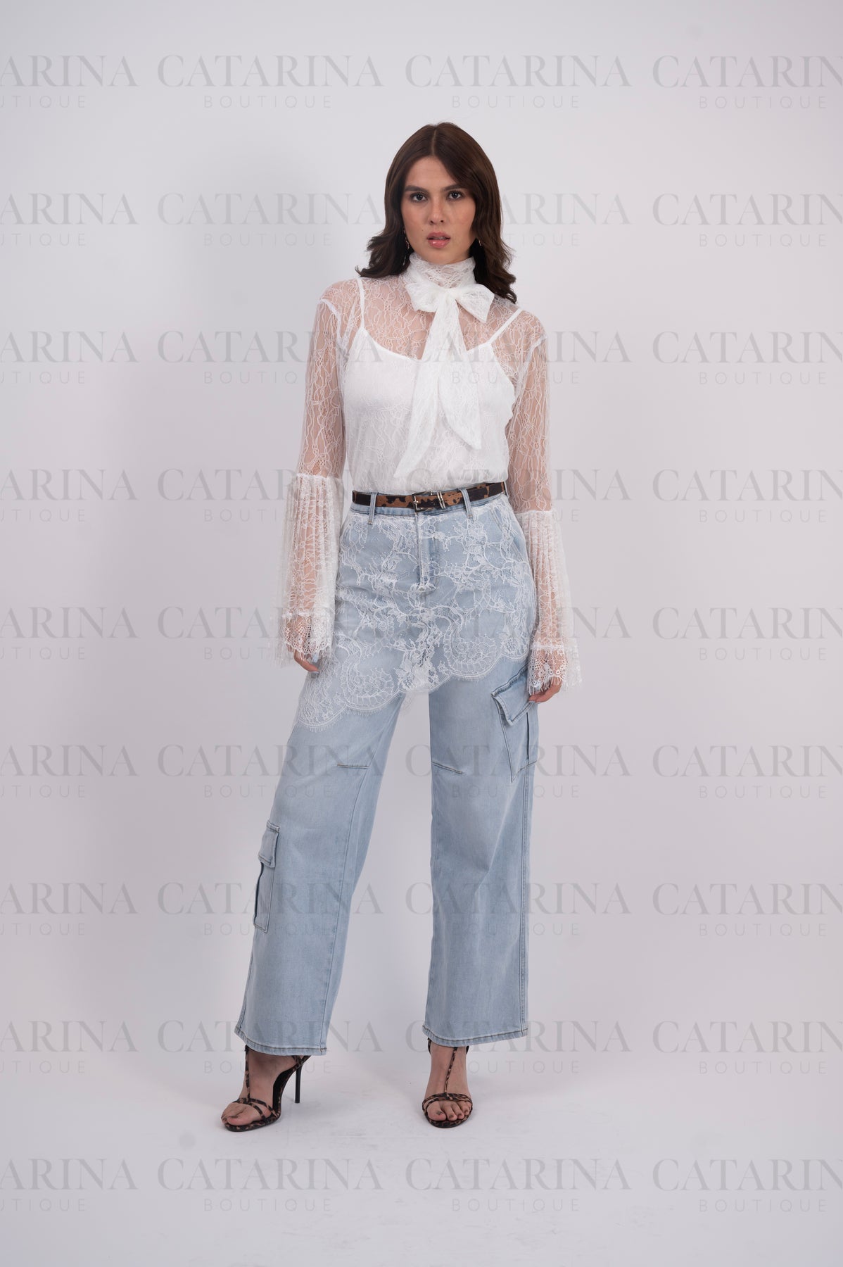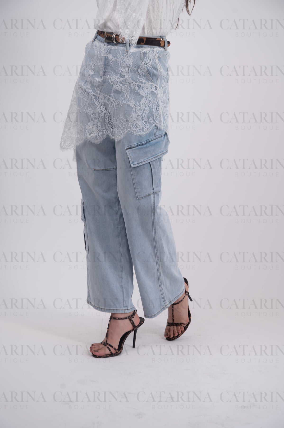 Pantalón de tiro alto. Bolsillos delanteros. Botón y cierre delantero con cremallera. Bajo acabado recto. Detalle de encaje.