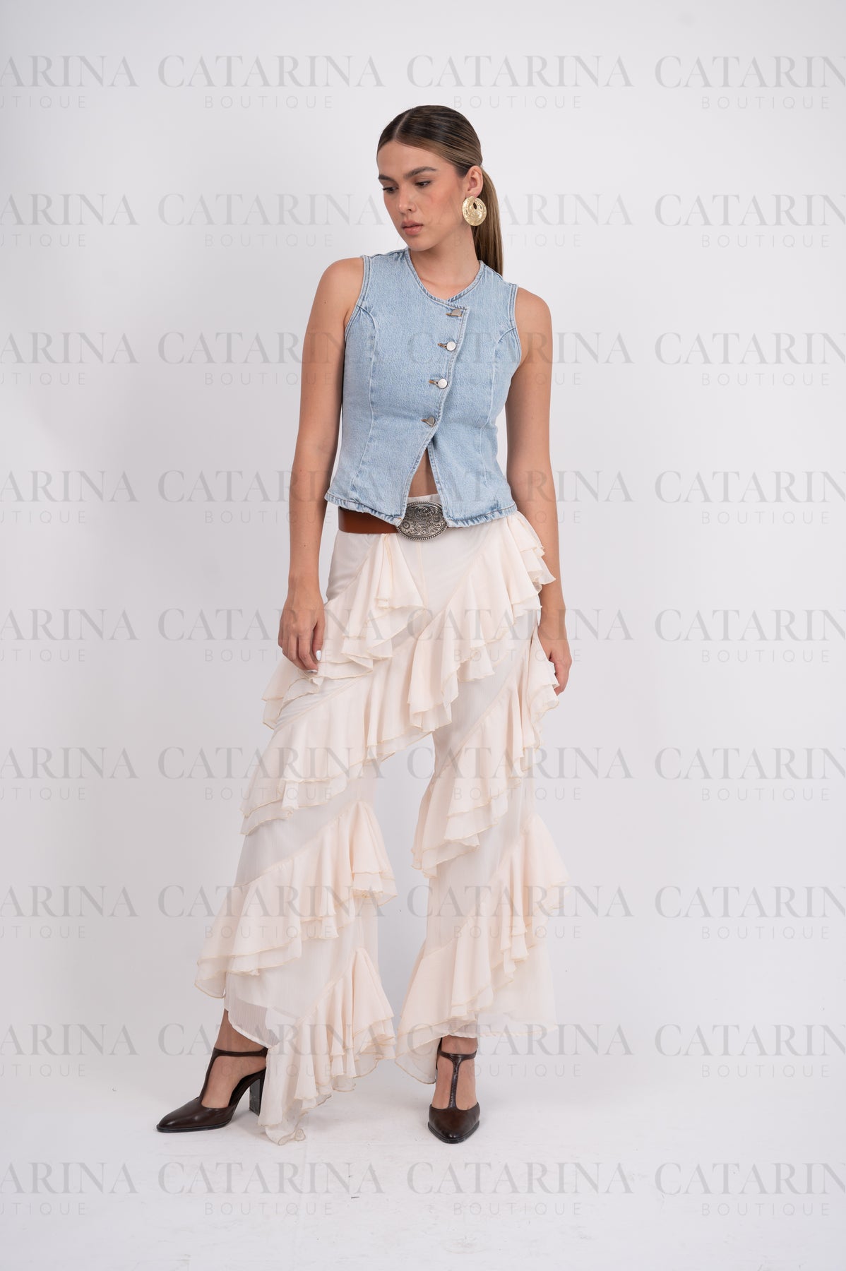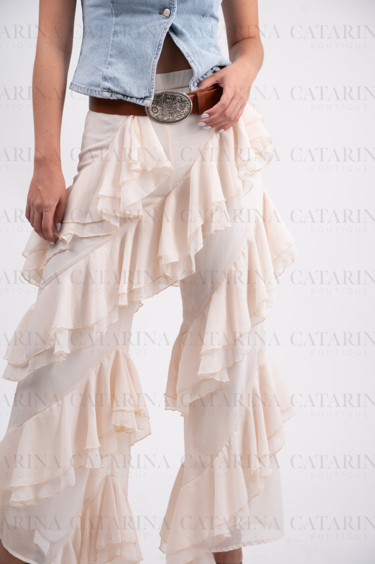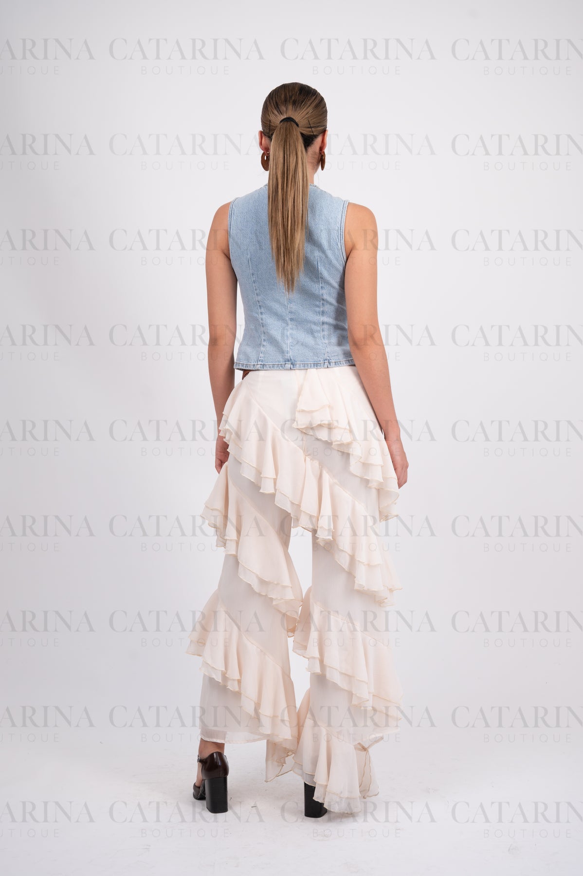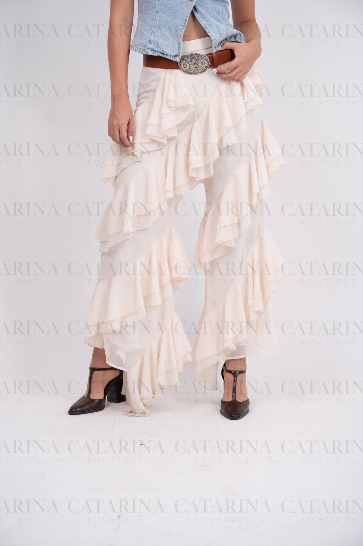 Pantalón liso de tiro alto. Elástico en cintura. Bajo acabado en volante. Detalle de olanes.COMPOSICIÓN:96% Poliéster.Material que no se estira ni se encoge.4% Spandex.Materia elástico, ligero y resistente.*NO INCLUYE ACCESORIOS*
