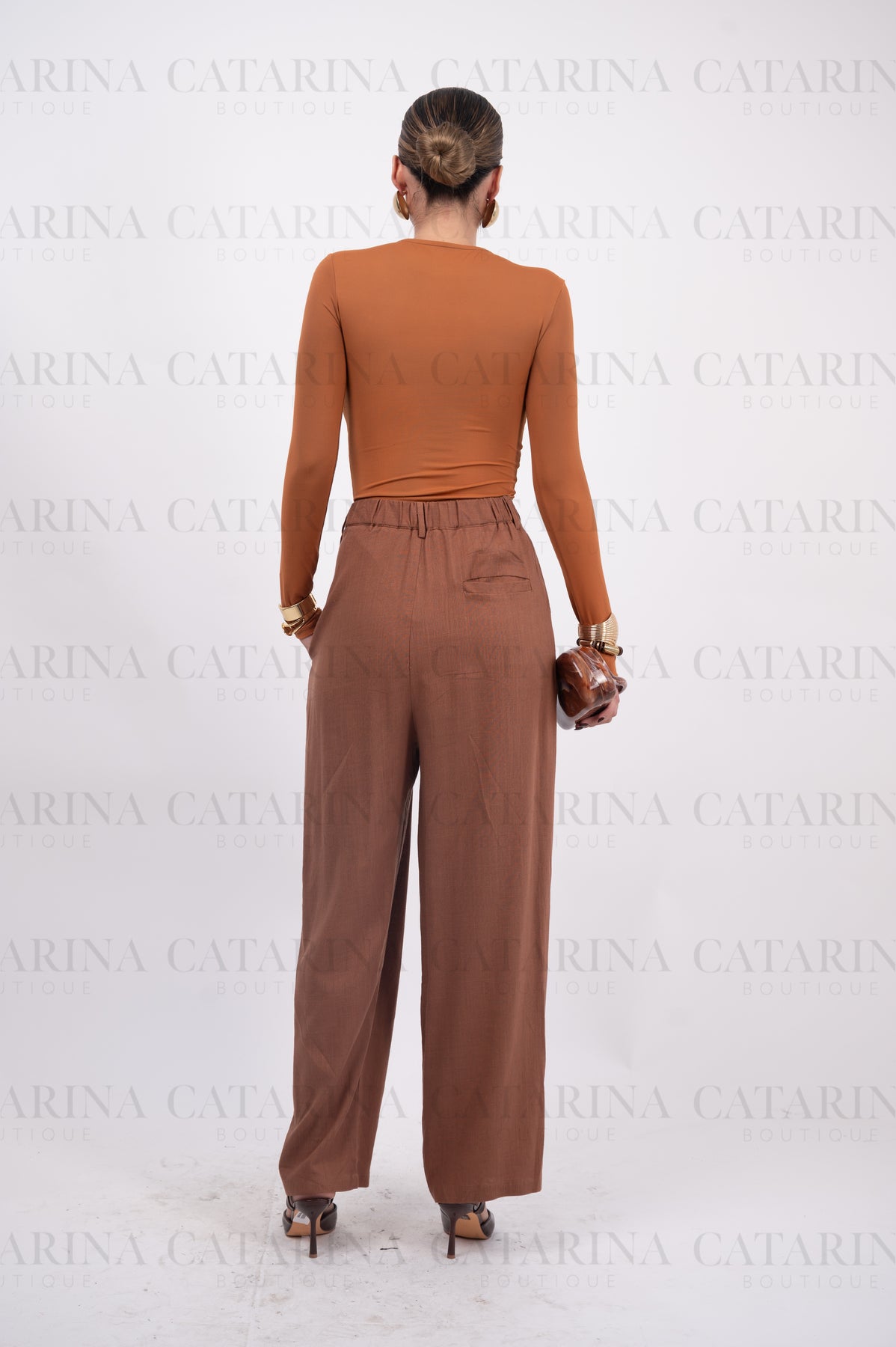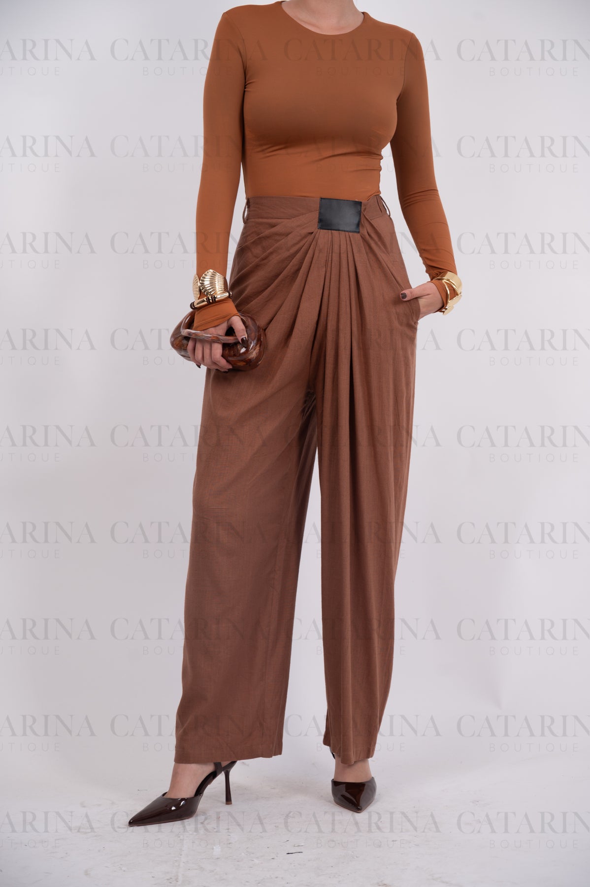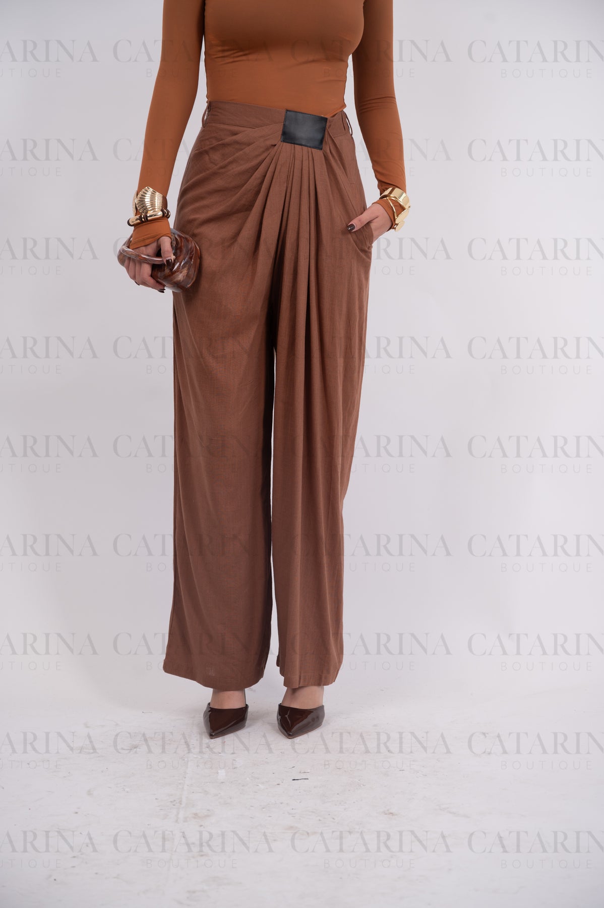 Pantalón de tiro alto. Detalles de pliegues al frente. Bolsillos a los costados. Bajo acabado recto.COMPOSICIÓN:100% POLIESTER Material que no se estira ni se encoge.NO INCLUYE ACCESORIOS