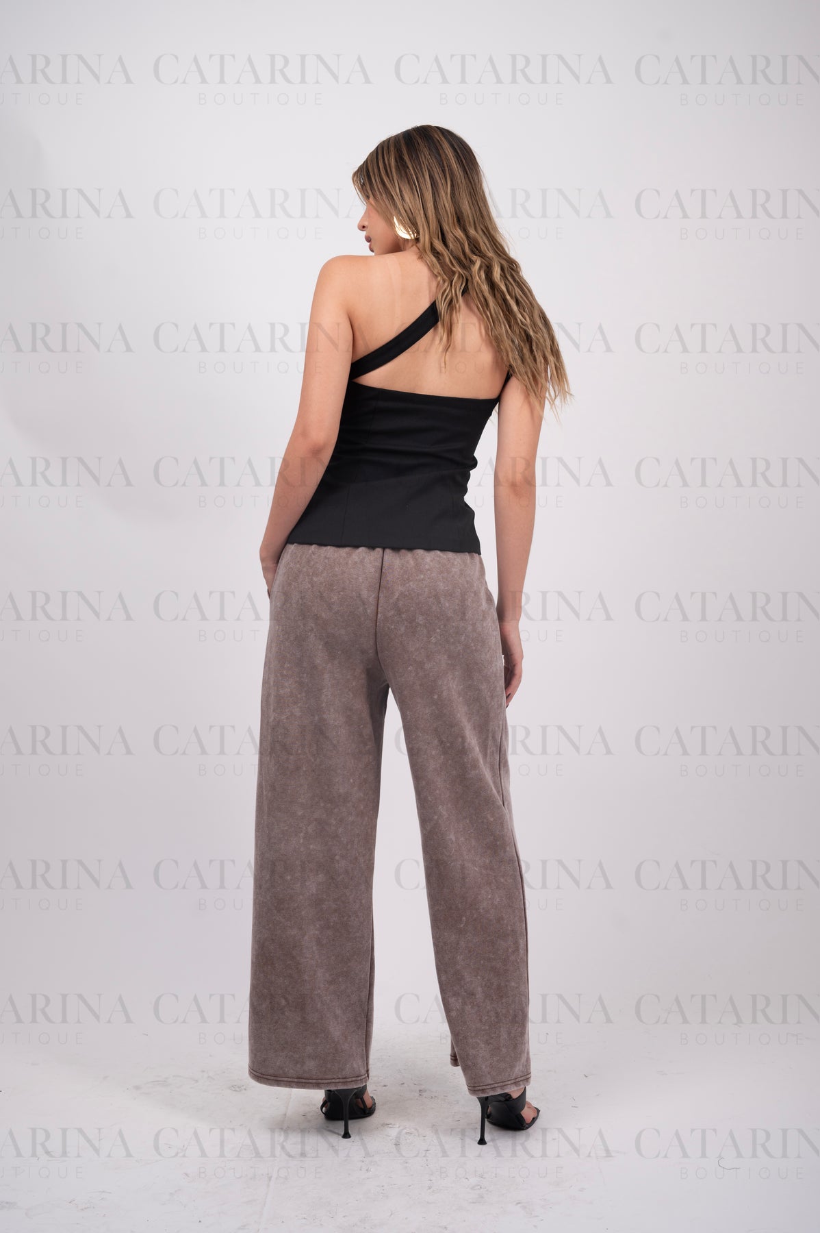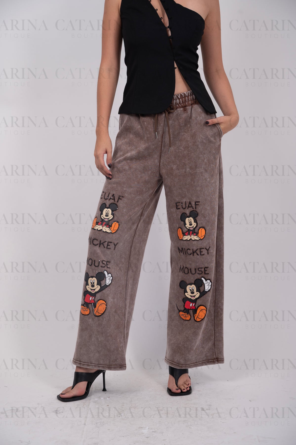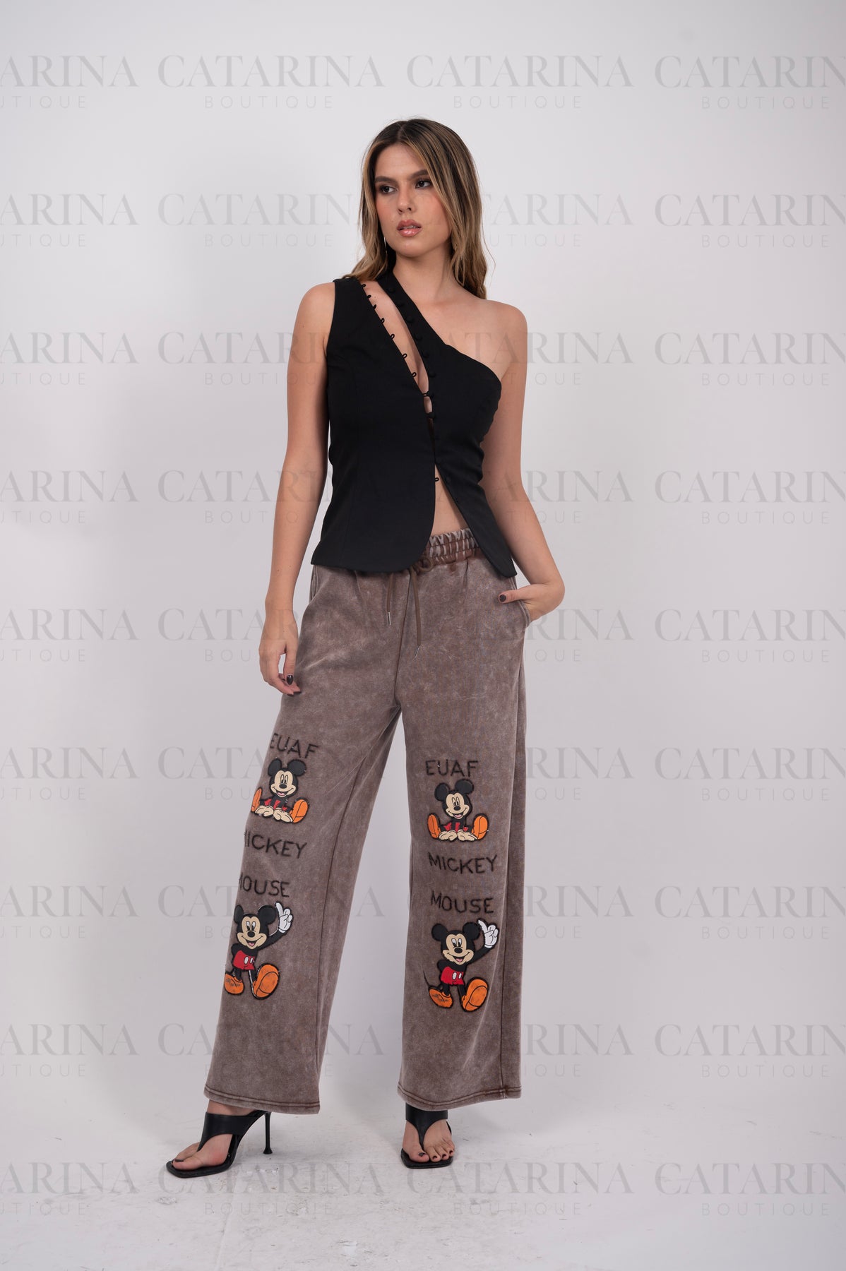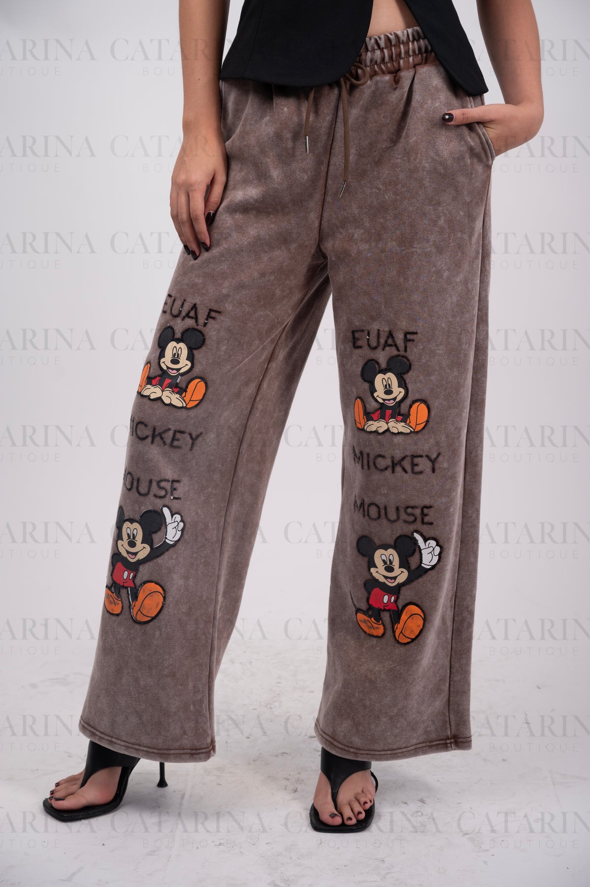 Pantalón de corte recto, tipo jogger.  Acabado tie-dye. Cintura elástica y fruncida con cordón ajustable.  Estampado de caricaturas en las piernas.