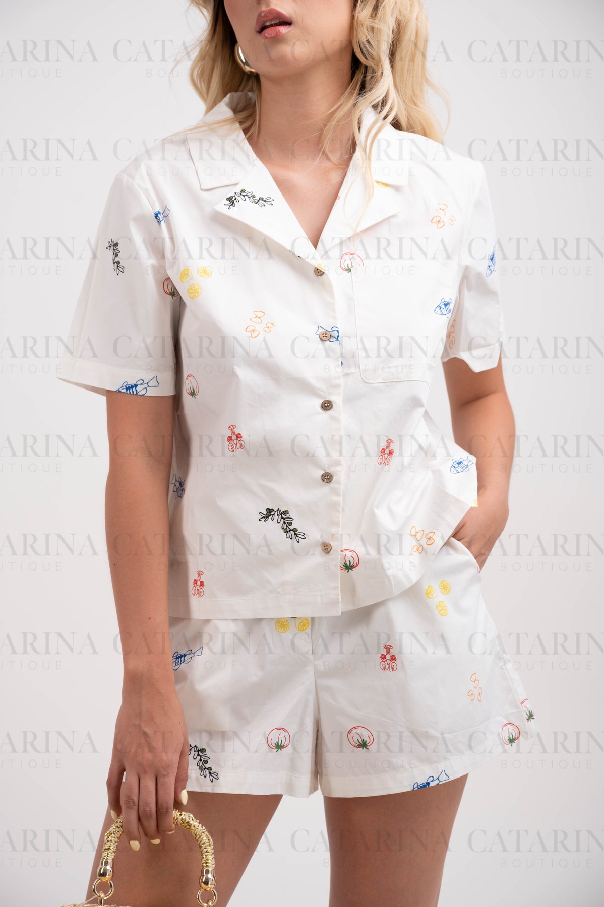 Conjunto de camisa y short. Camisa manga corta. Cuello tipo americano. Botones y bolsillos al frente.  Short de tiro alto. Elástico en la cintura. Bajo acabado en volante.