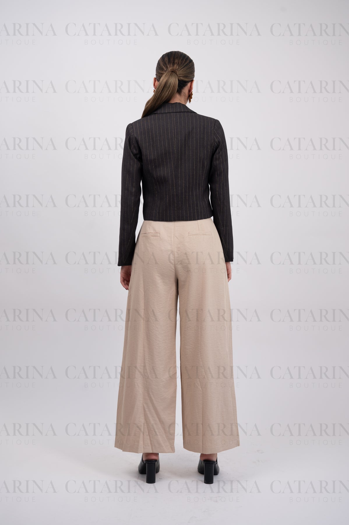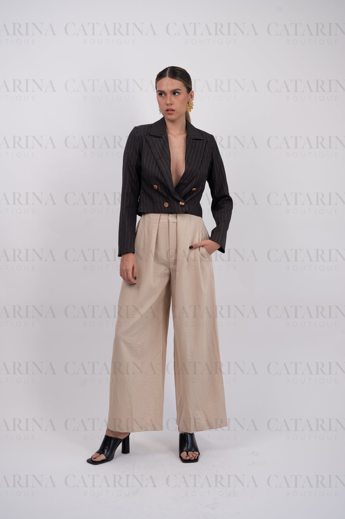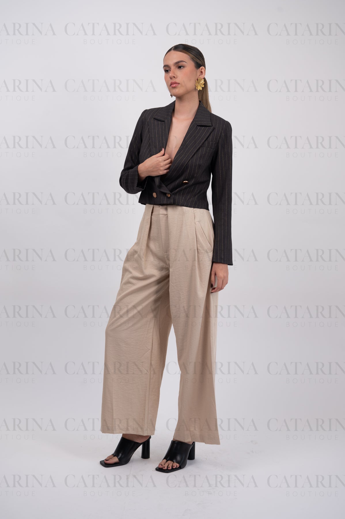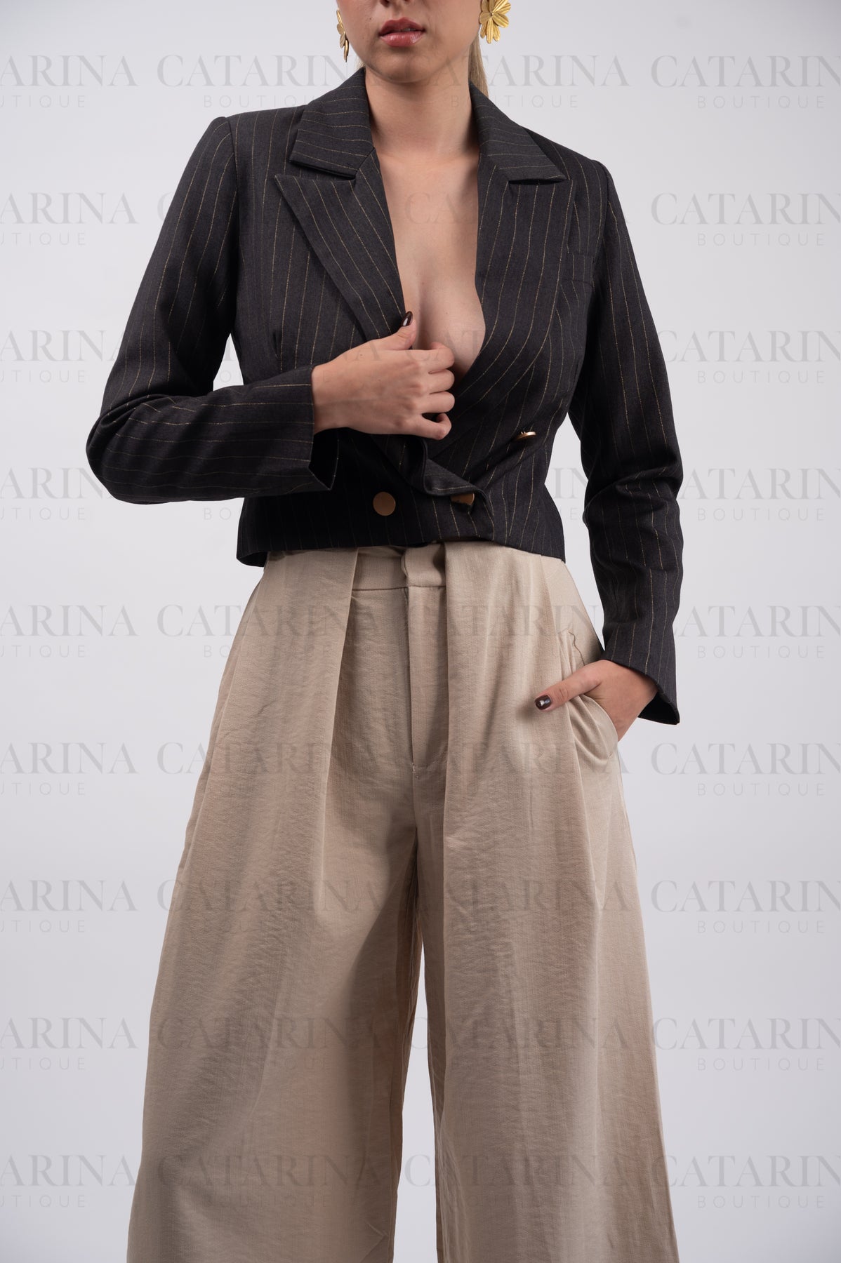 Saco de cuello y solapa con manga larga.  Bajo acabado recto. Botón y bolsillos falsos al frente. Detalle de lineas.