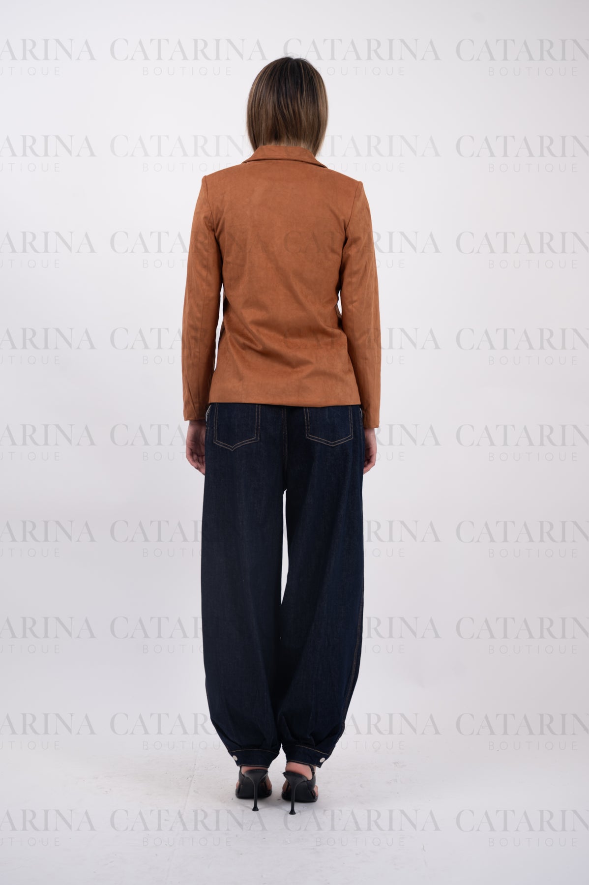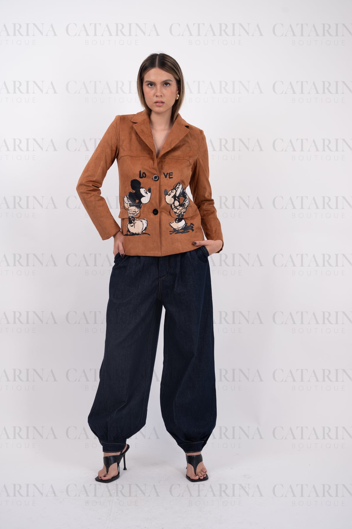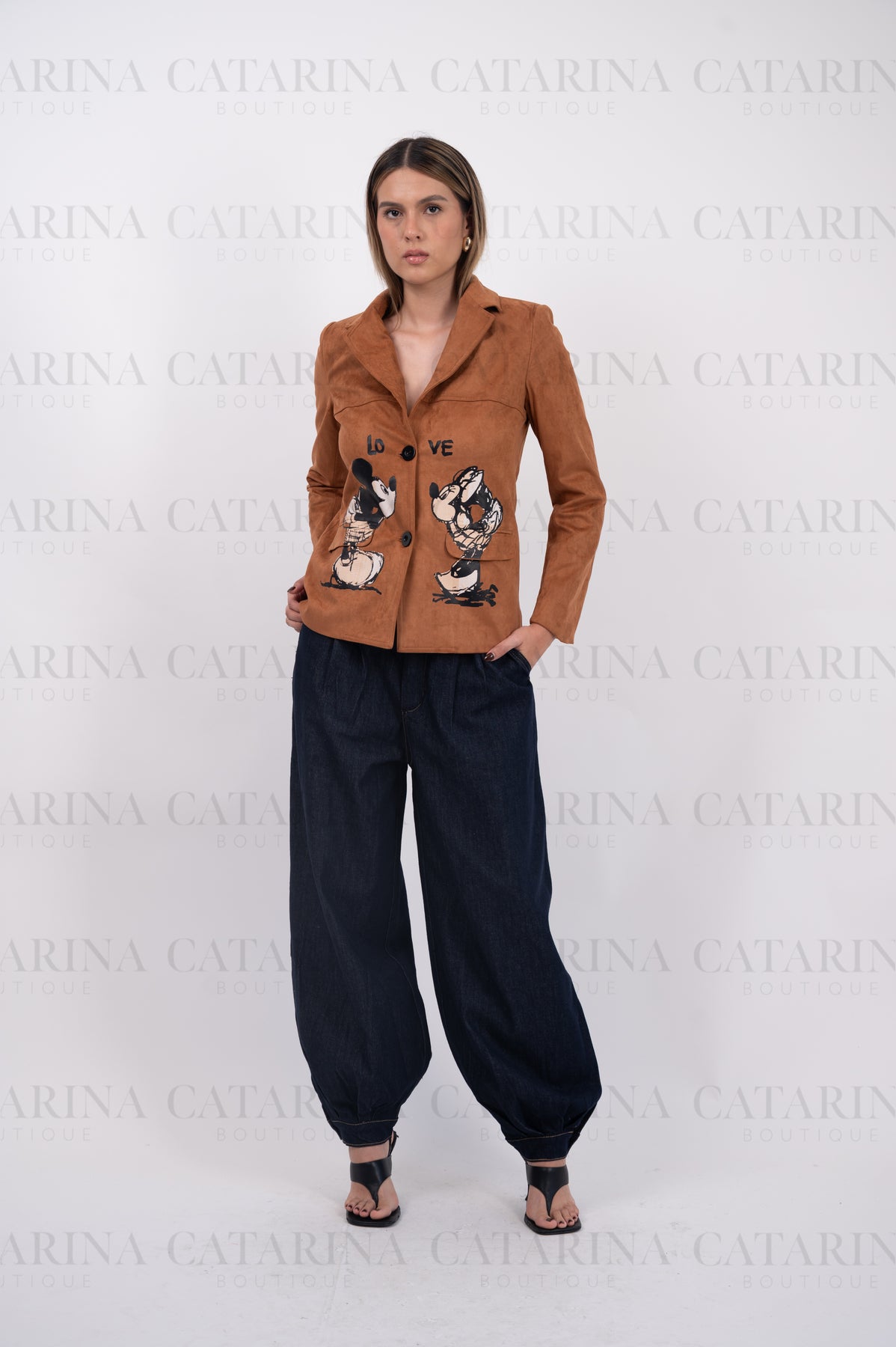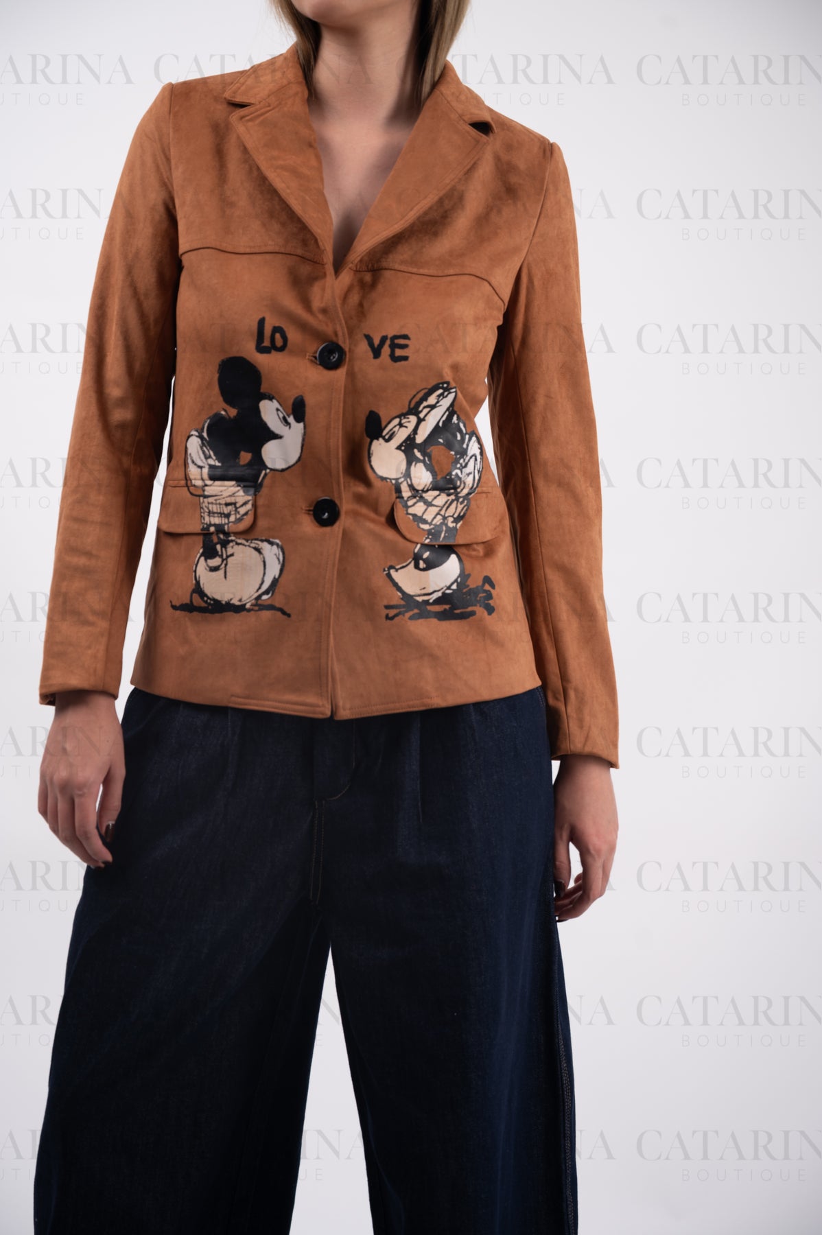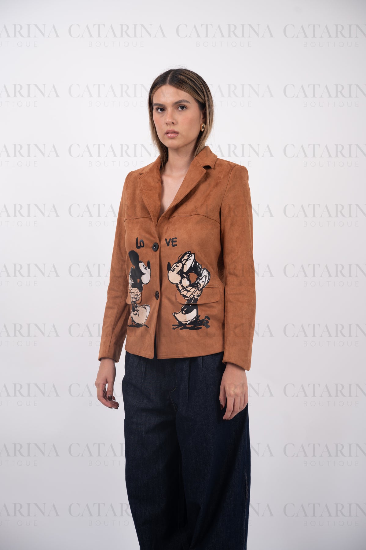 Saco de cuello y solapa con manga larga. Bajo acabado recto. Botón y bolsillos falsos al frente. Detalle de ilustración.