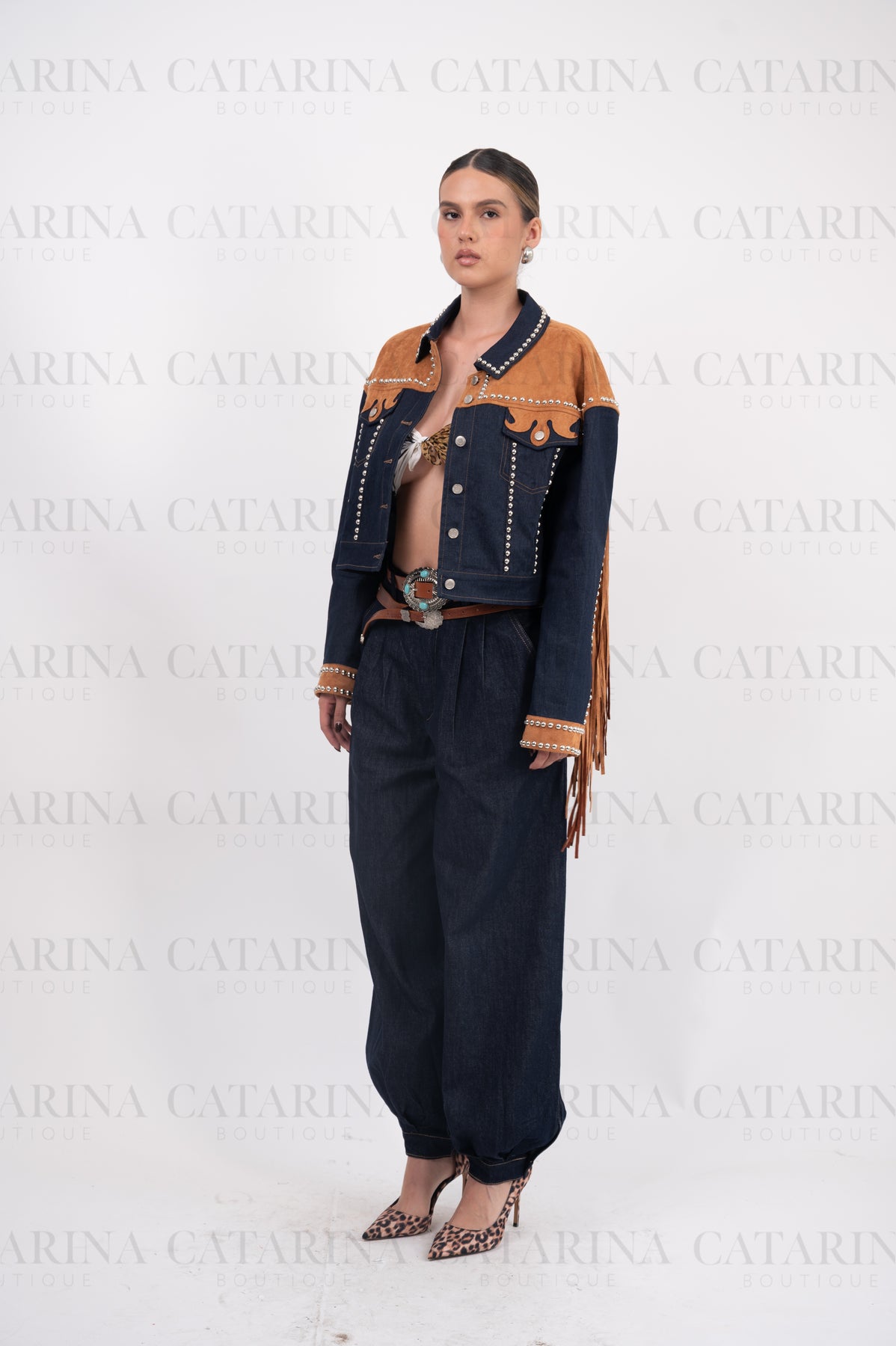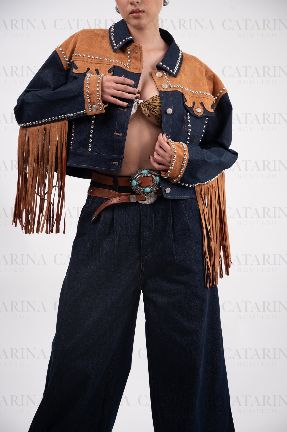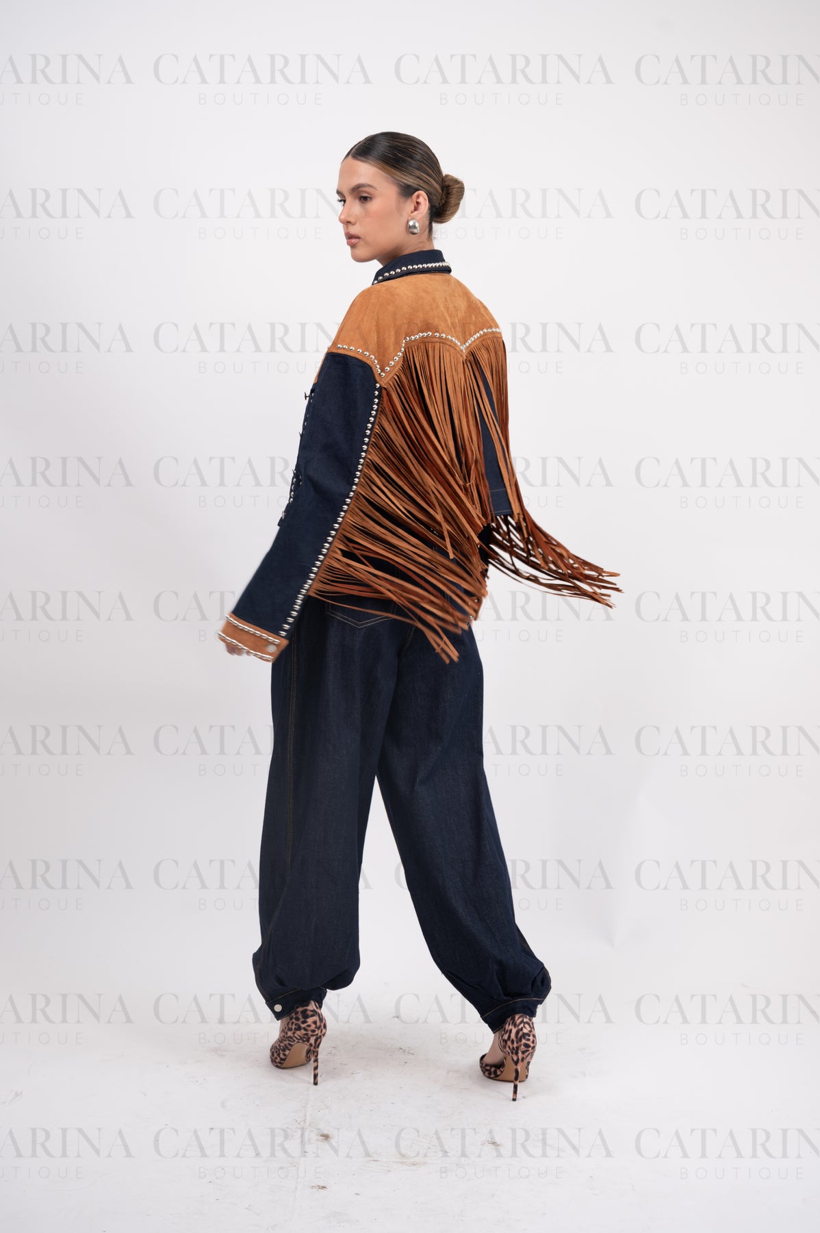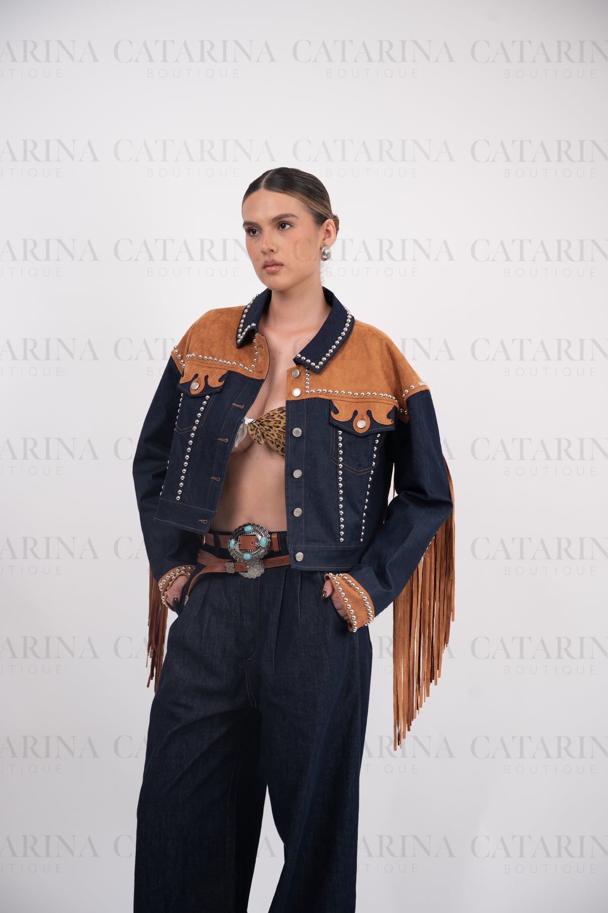 Chamarra de cuello y solapa manga larga. Botones delanteros. Bicolor. Detalle de flequillos y estoperoles. Bajo acabado recto. COMPOSICIÓN:100% Poliéster.Material que no se estira ni se encoge.NO INCLUYE ACCESORIOS