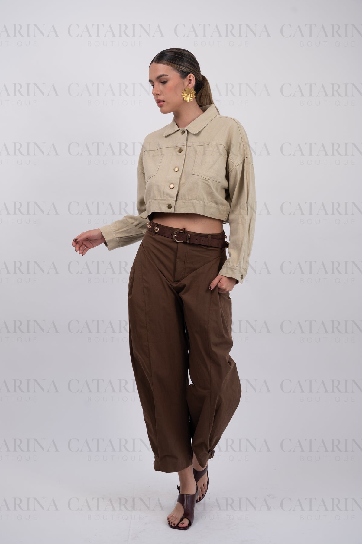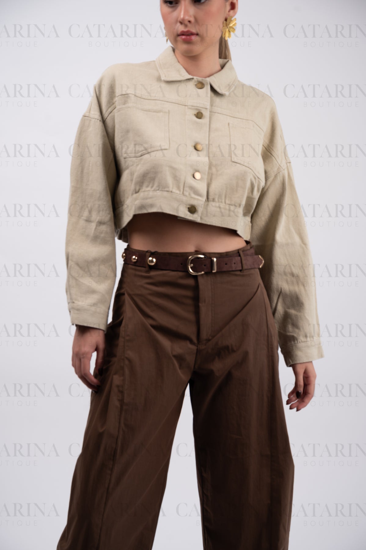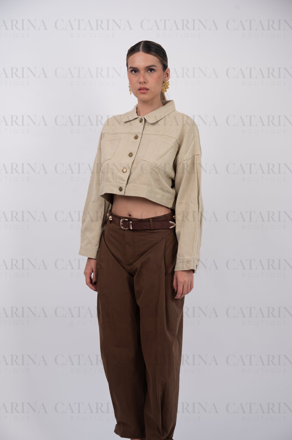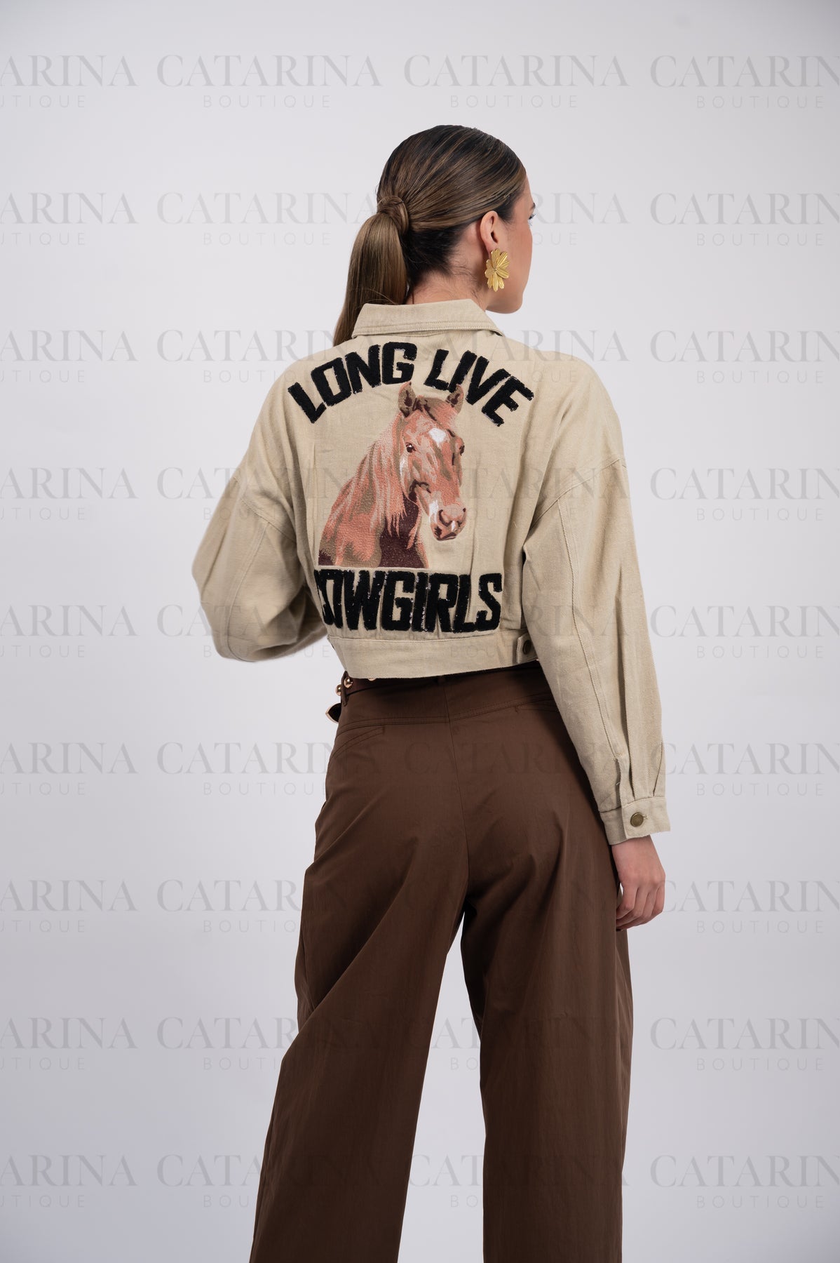 Chamarra de cuello y solapa manga larga. Detalle de ilustración en espalda. Botones y bolsillos al frente. Bajo acabado recto.