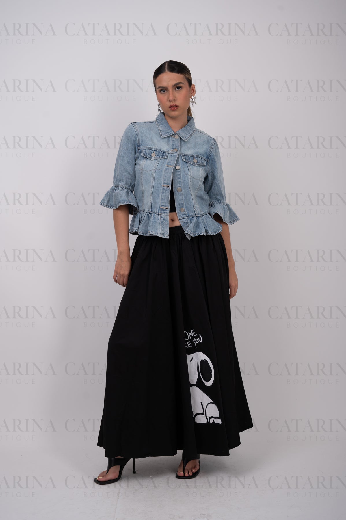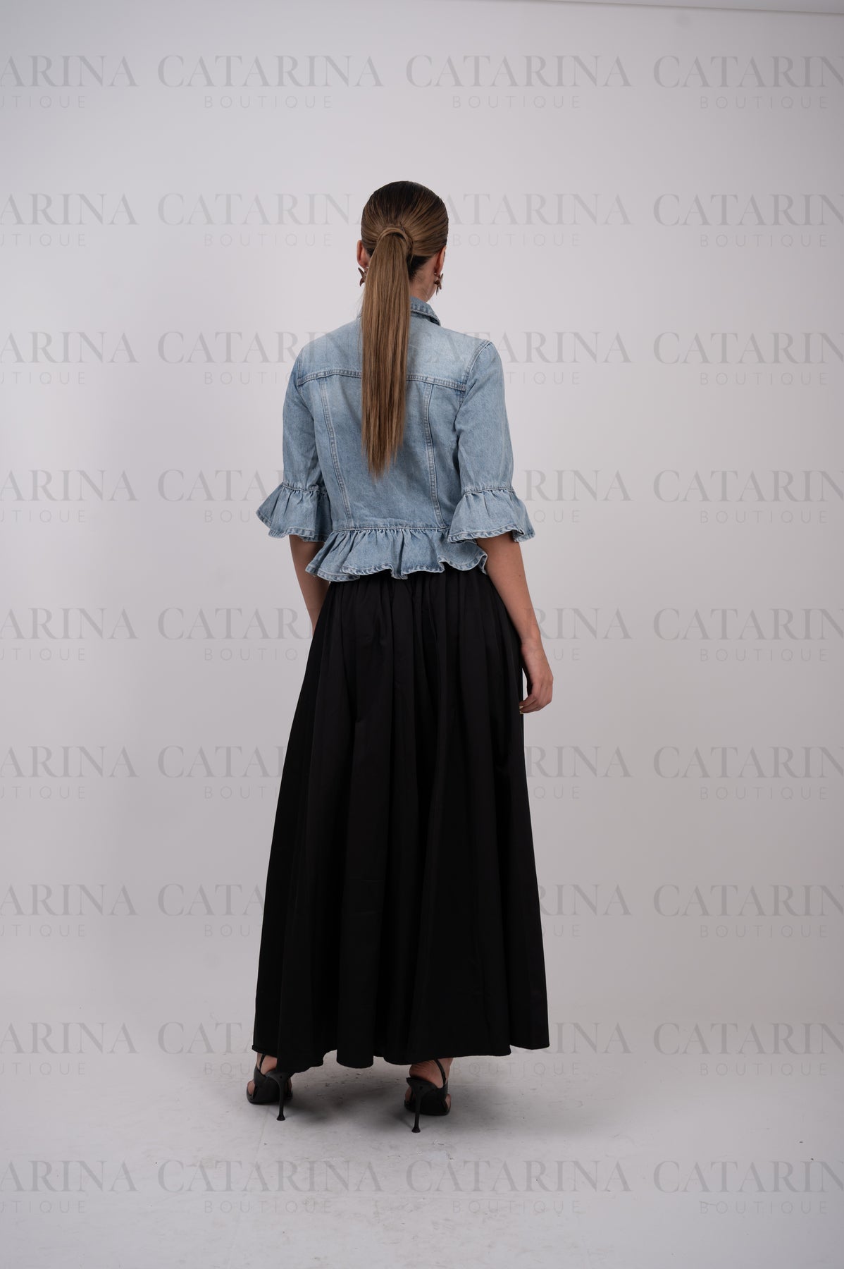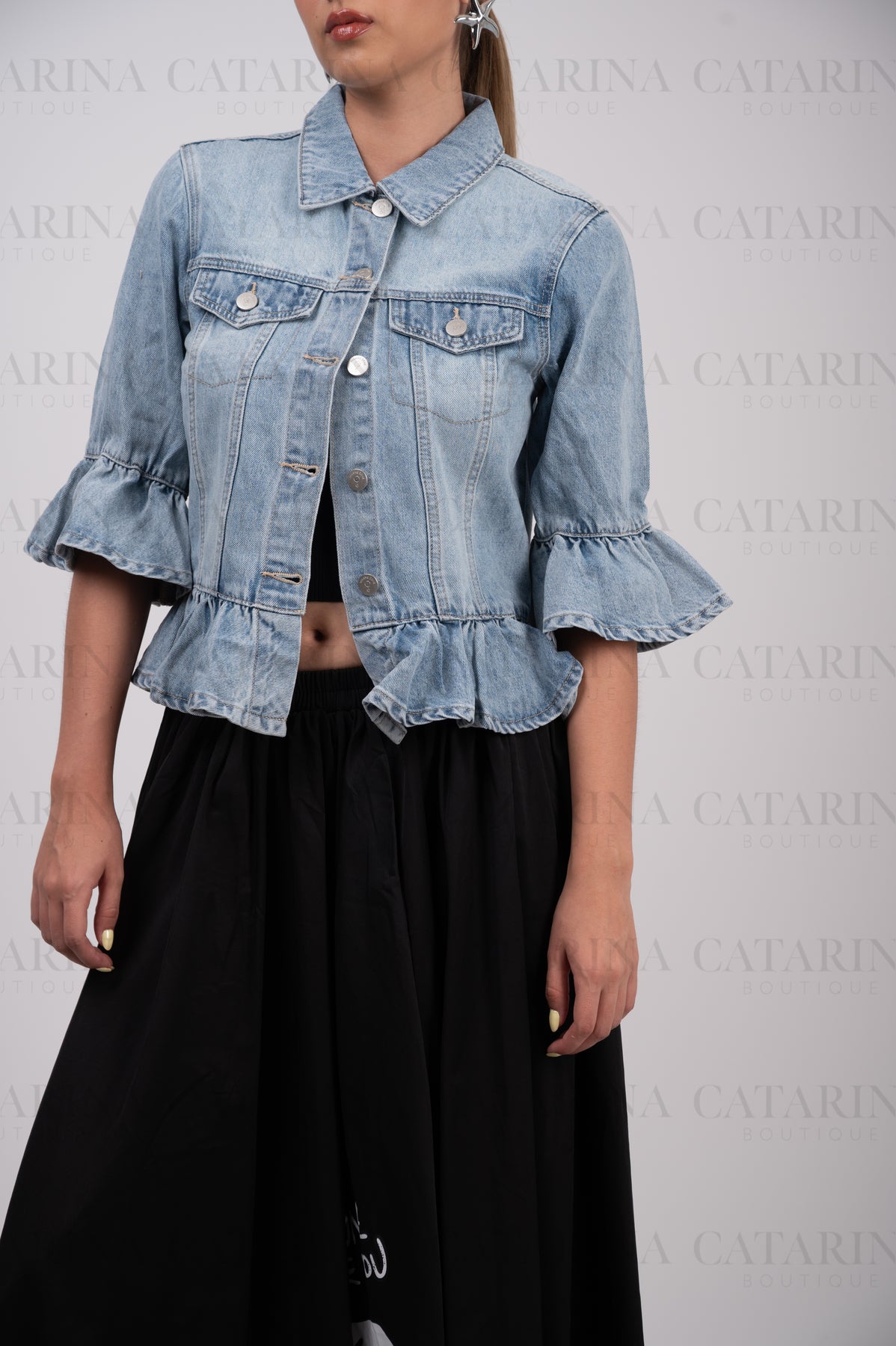 Chamarra de cuello y solapa manga larga. Botones y bolsillos delanteros. Color liso. Bajo acabado con olanes. COMPOSICIÓN:100% Poliéster.Material que no se estira ni se encoge.NO INCLUYE ACCESORIOS
