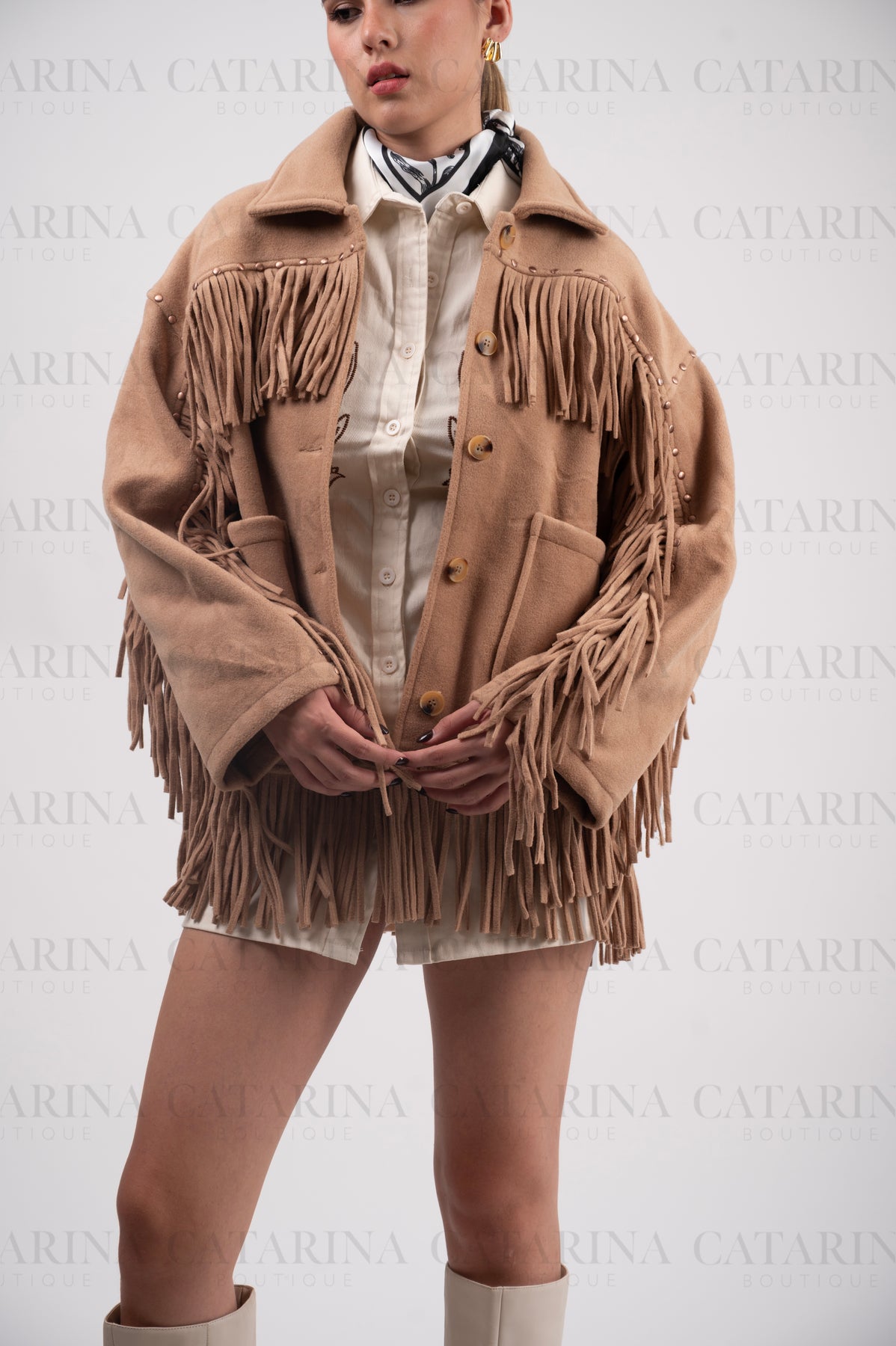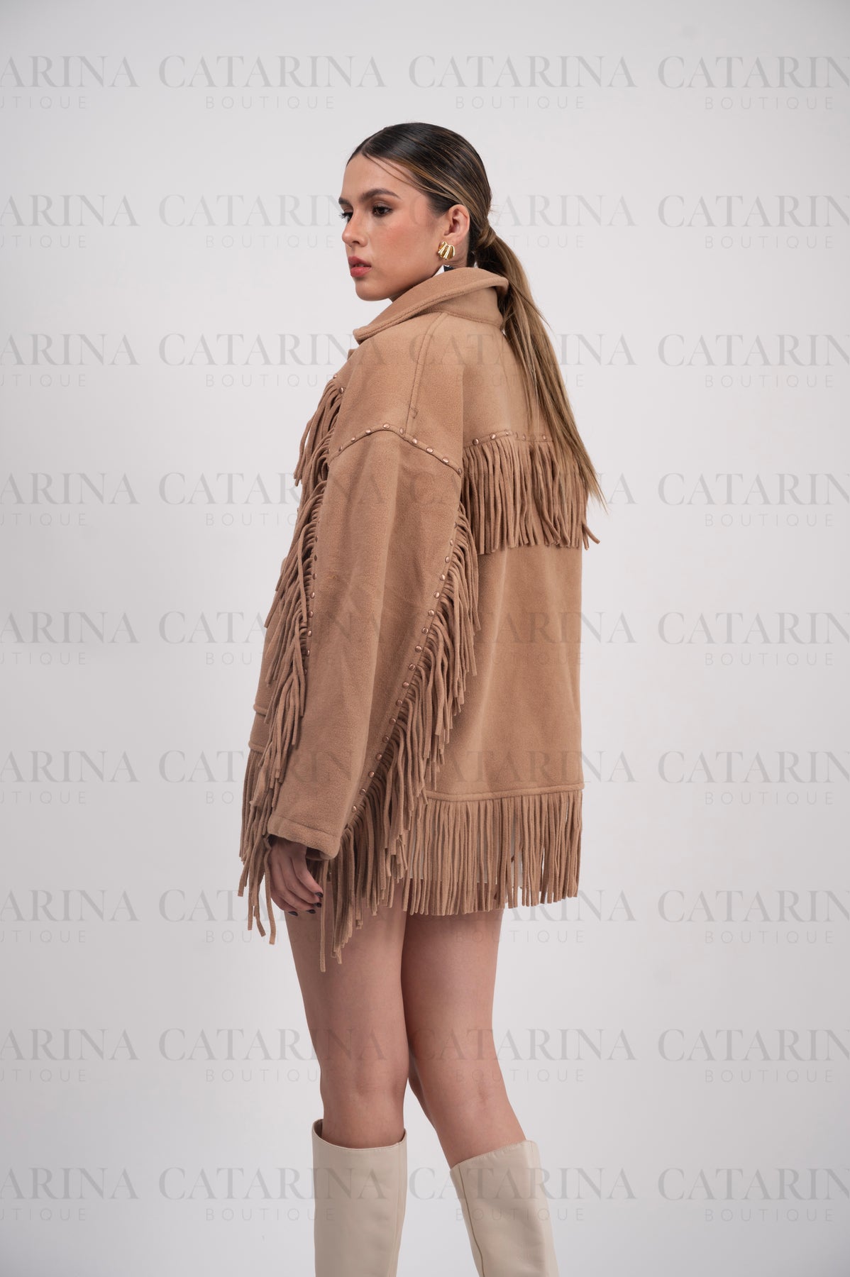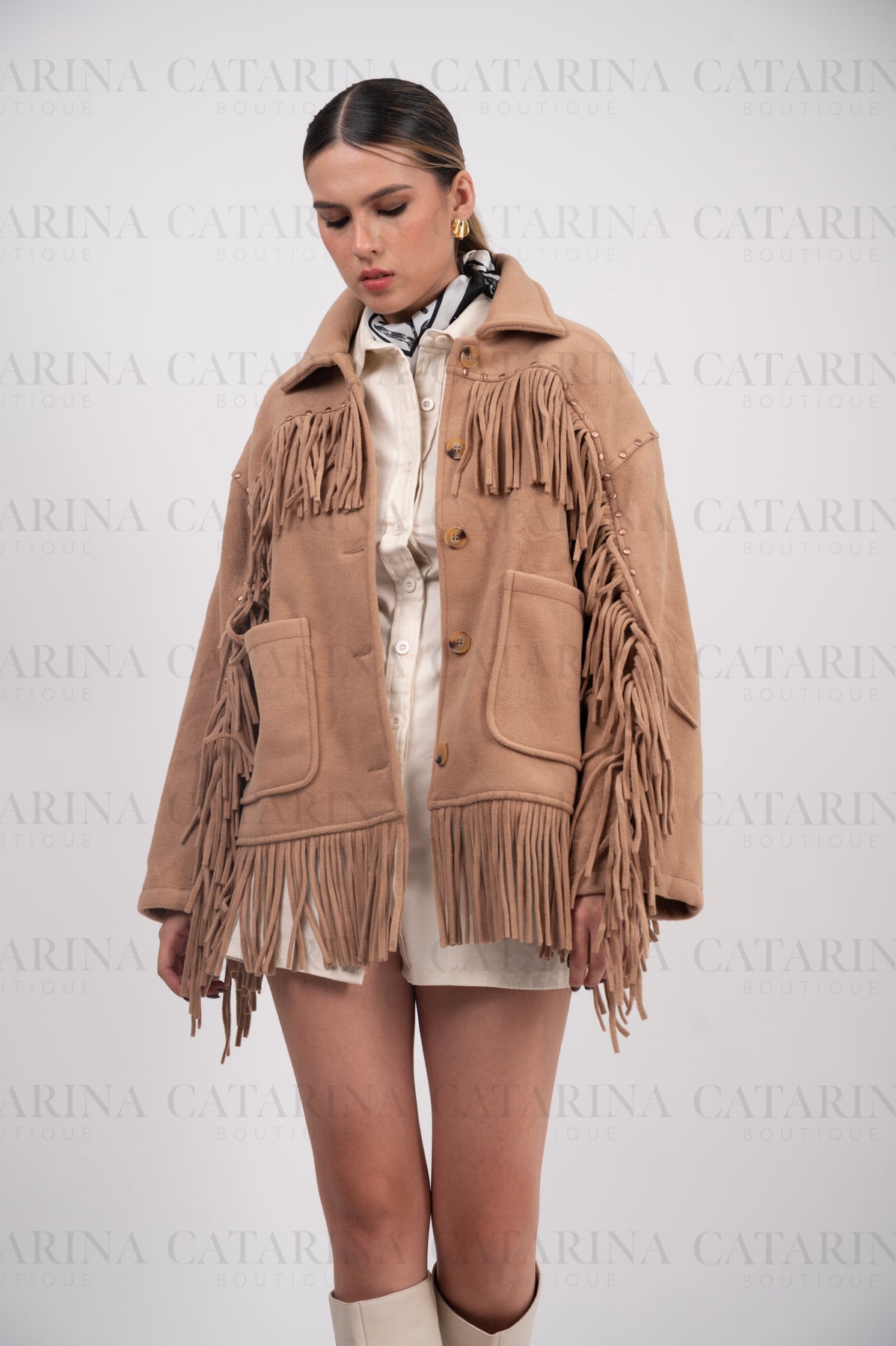 Chaqueta de estilo western. Diseño de corte recto con un cuello de solapa clásico y cierre frontal de botones. Detalle de flecos largos que adornan el pecho, los hombros y el bajo de la chaqueta. Bolsillos de parche frontales.
