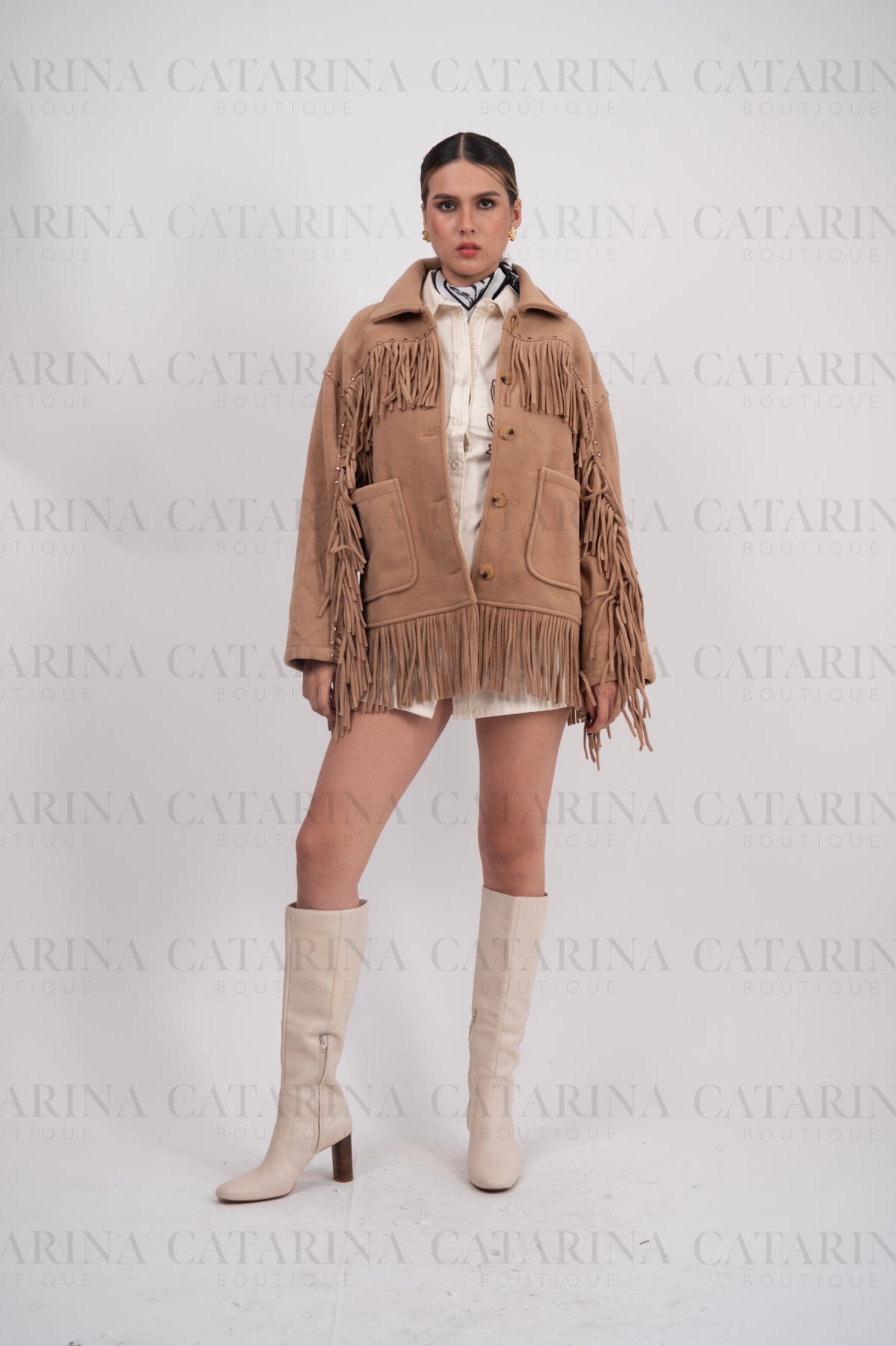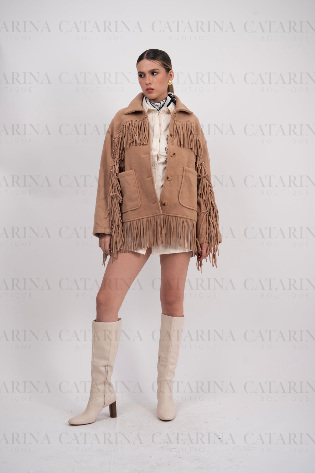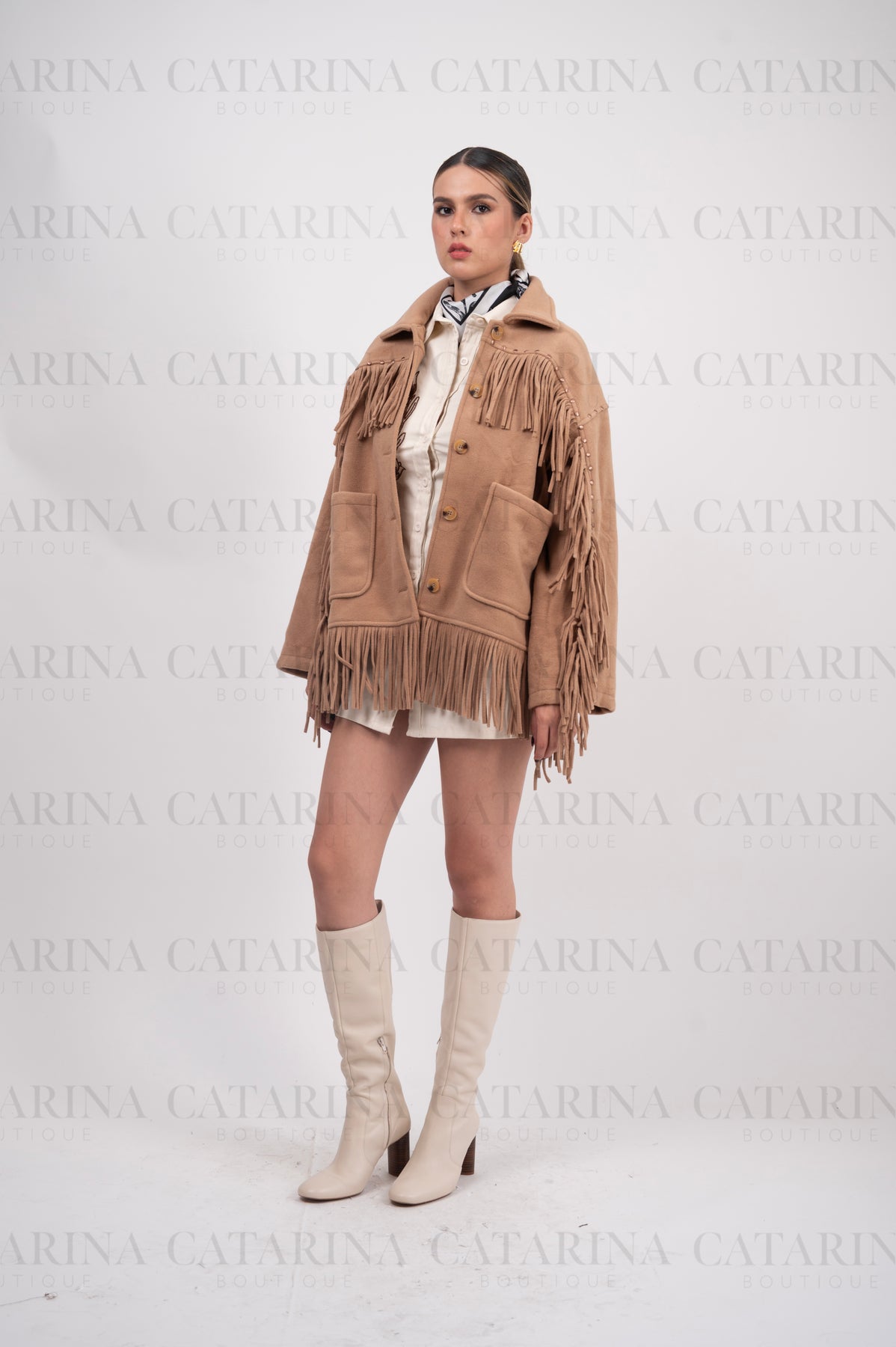 Chaqueta de estilo western. Diseño de corte recto con un cuello de solapa clásico y cierre frontal de botones. Detalle de flecos largos que adornan el pecho, los hombros y el bajo de la chaqueta. Bolsillos de parche frontales.