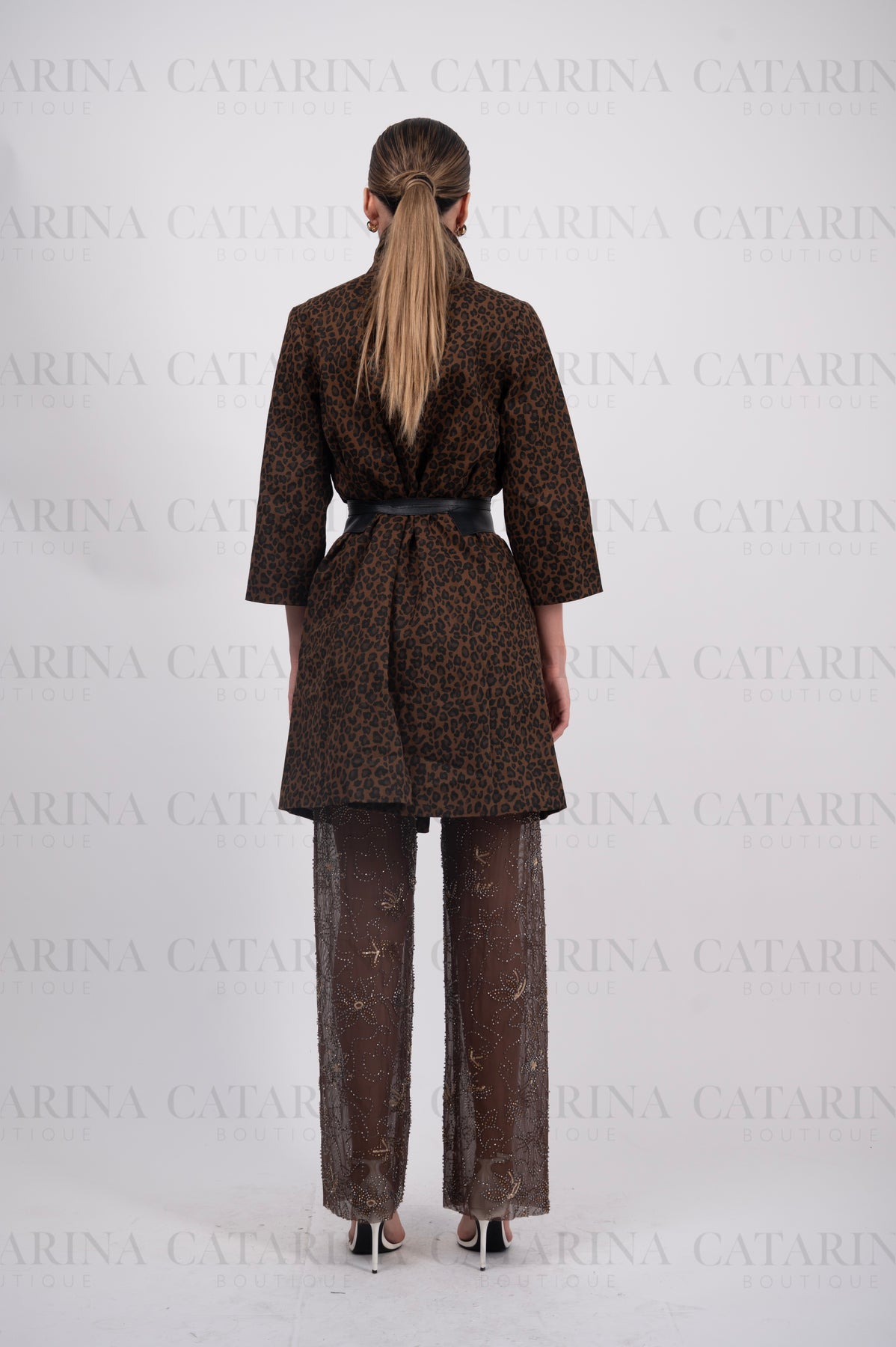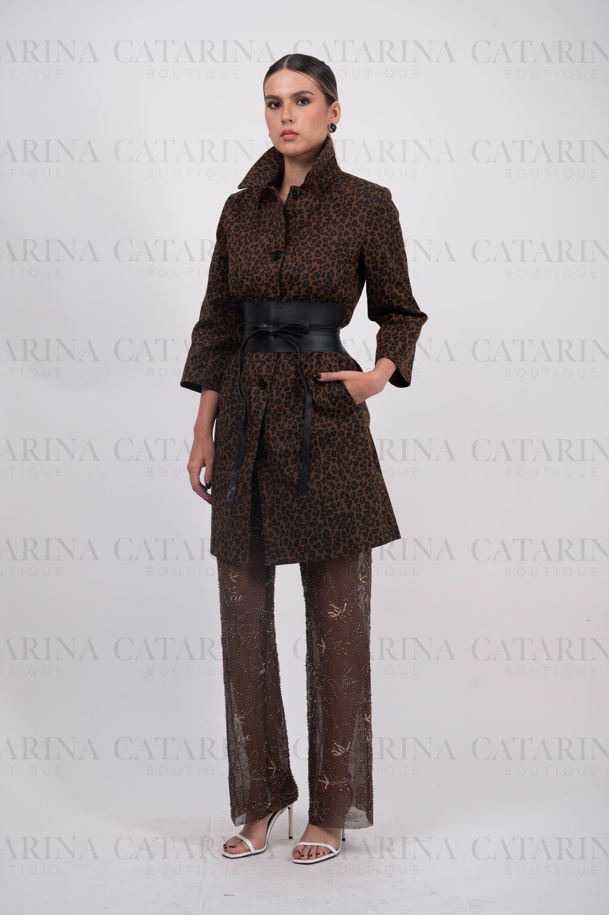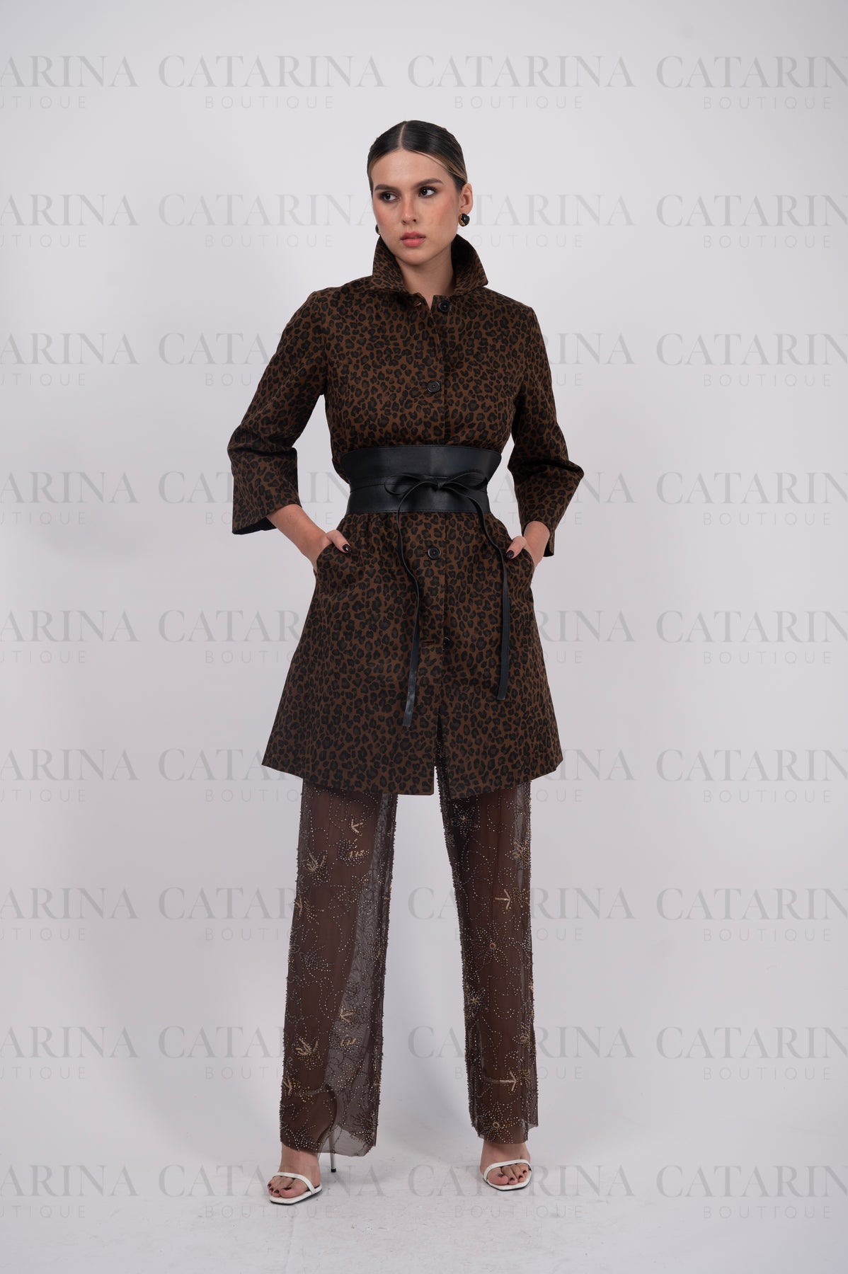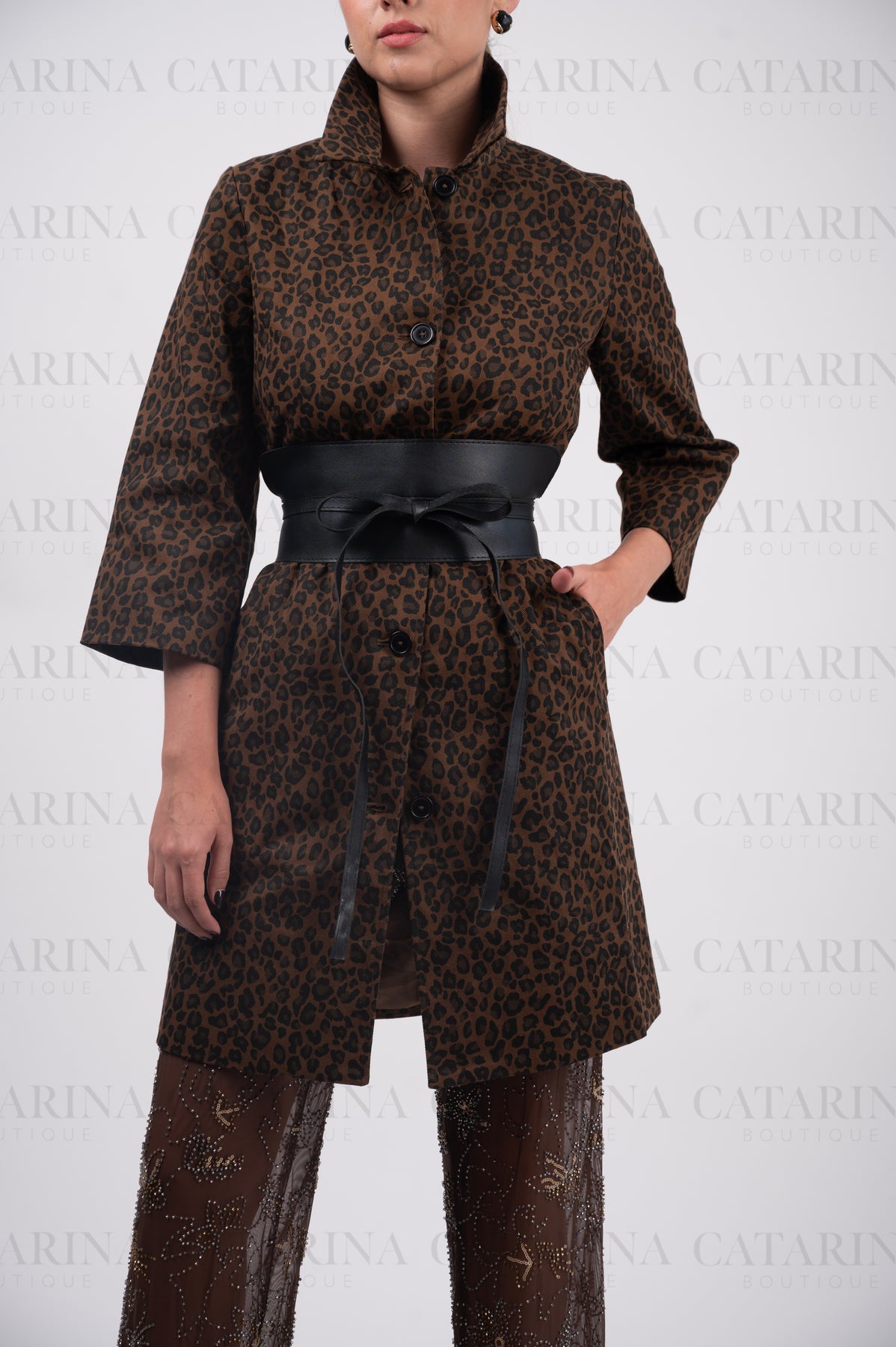 Gabardina de cuello y solapa con manga larga. Cierre  con botones. Bajo acabado recto. Detalle de estampado de animal print.