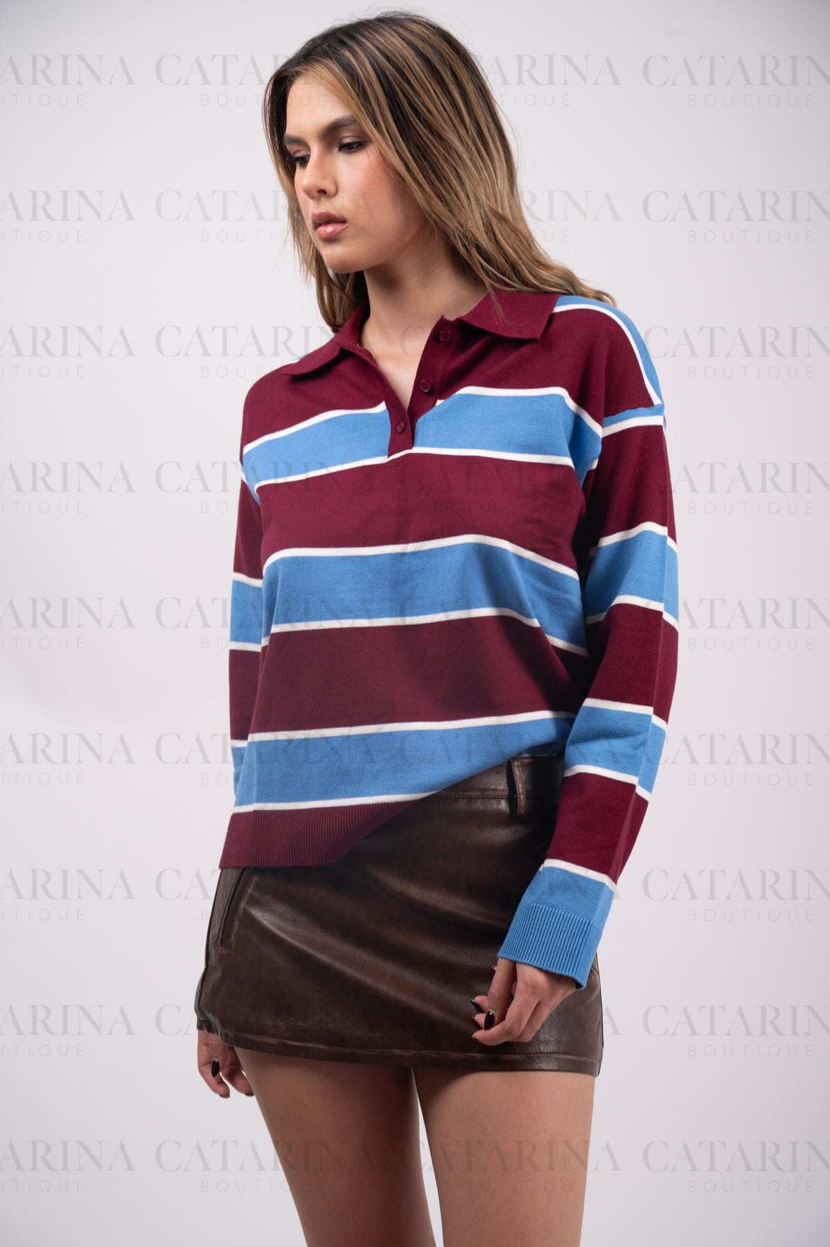 Suéter de corte recto con un cuello tipo polo. Estampado de rayas horizontales gruesas en una combinación de colores.