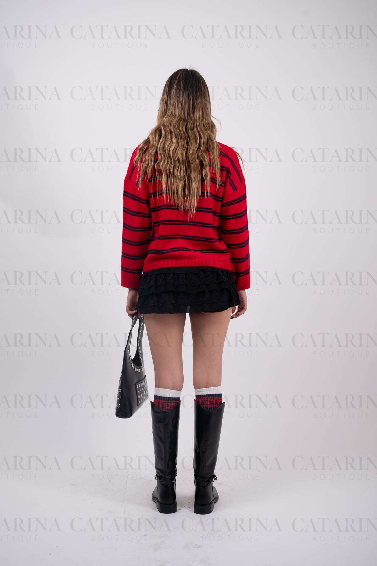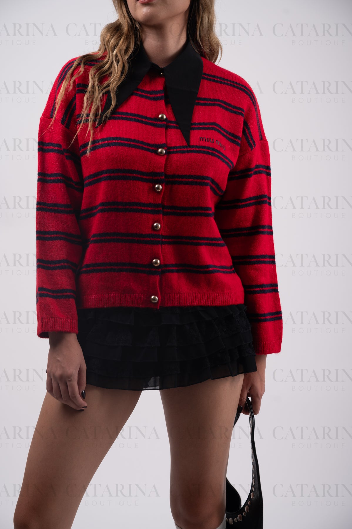 Suéter de cuello redondo. Manga larga. Botones delanteros. Color liso con lineas a contraste. Bajo acabado recto.
